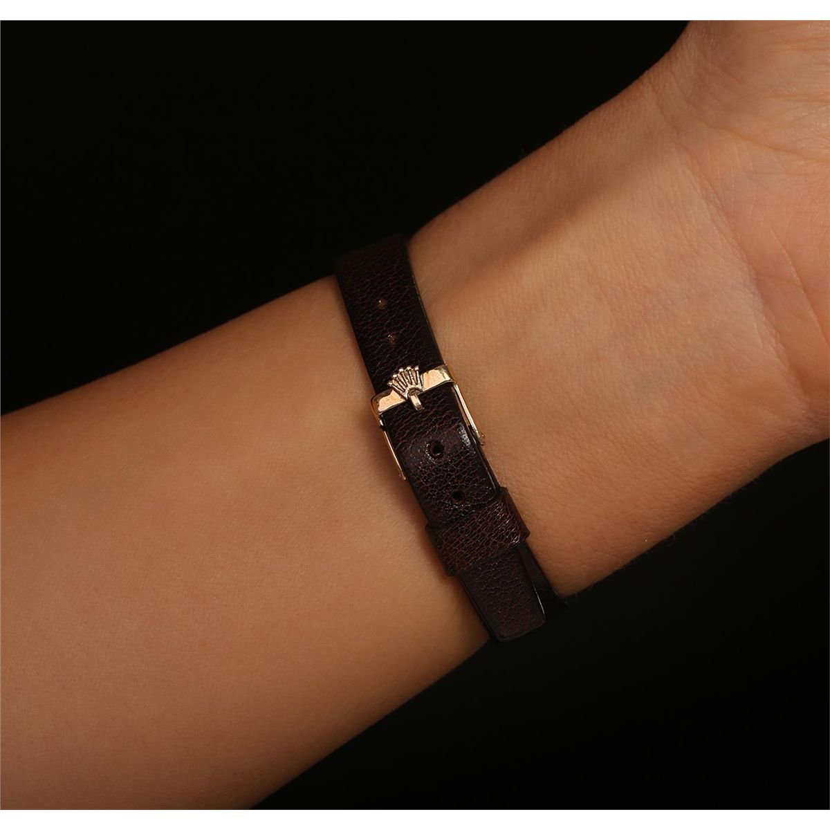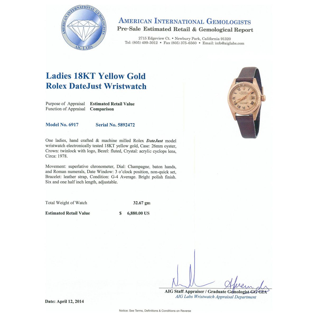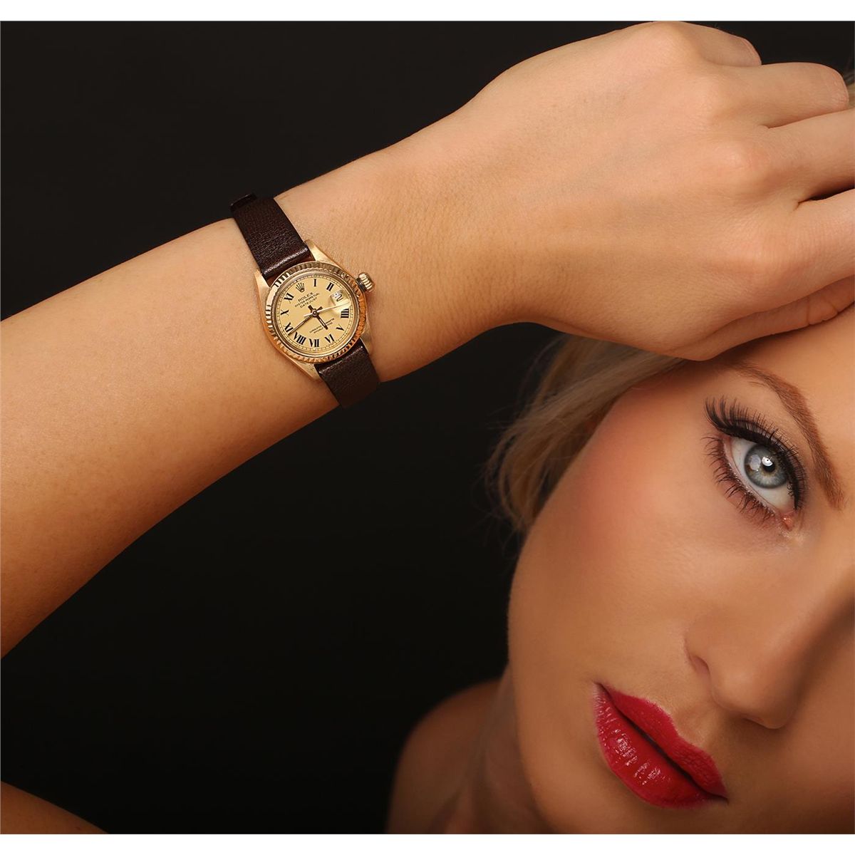 One ladies, hand crafted & machine milled Rolex DateJust model wristwatch electronically tested 18KT yellow gold, Case: 26mm oyster, Crown: twinlock with logo, Bezel: fluted, Crystal: acrylic cyclops lens, Circa: 1978. Movement: superlative chronometer, Dial: Champagne, baton hands, and Roman numerals, Date Window: 3 o'clock position, non-quick set, Bracelet: leather strap, Condition: G-4 Average. Bright polish finish. Six and one half inch length, adjustable. Total Weight of Watch 32.67gm. AIG Appraised at $6,880.00.