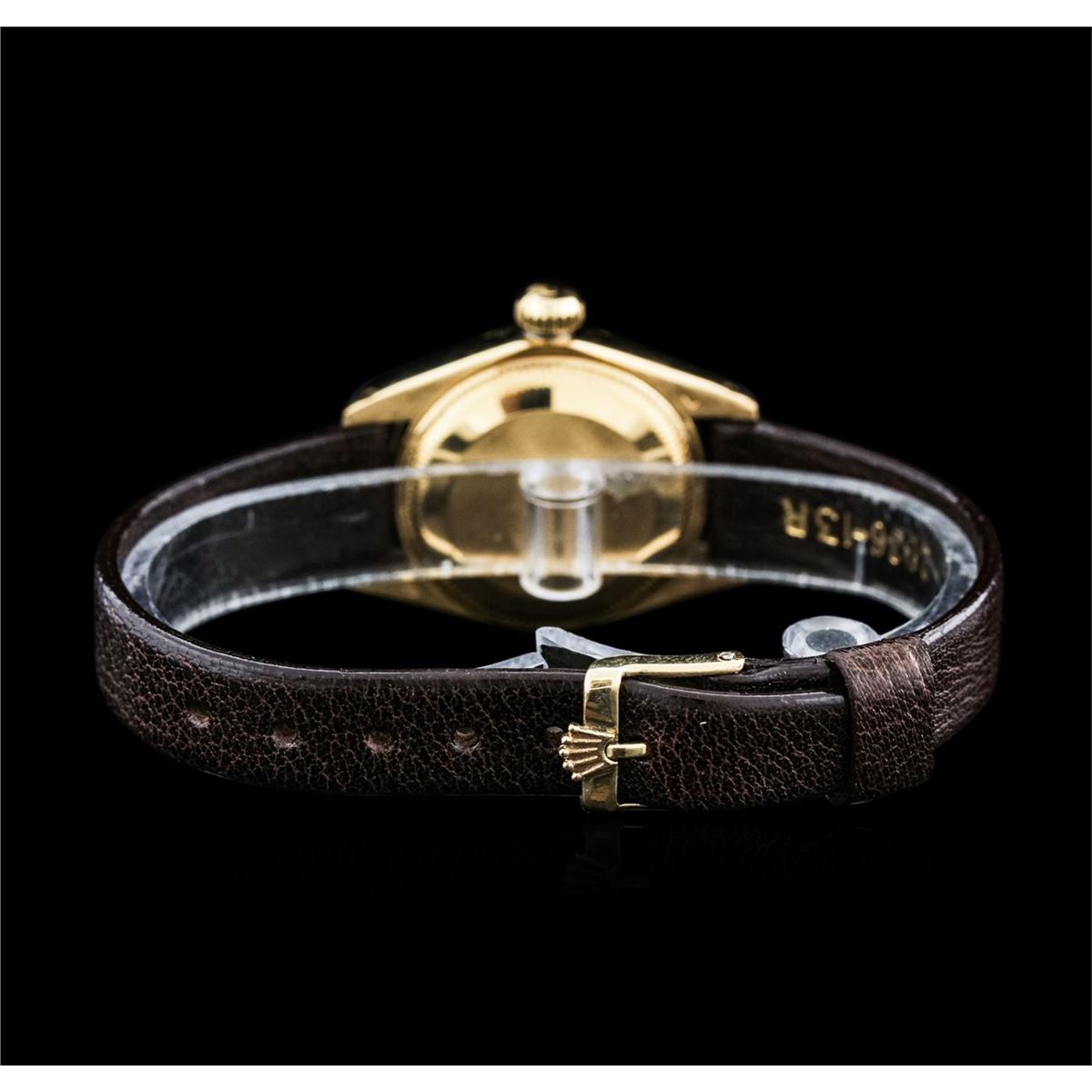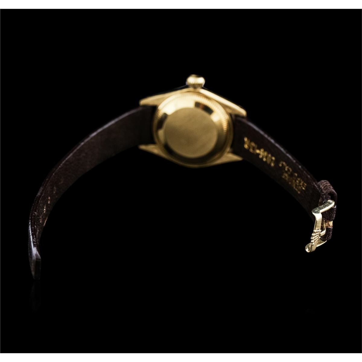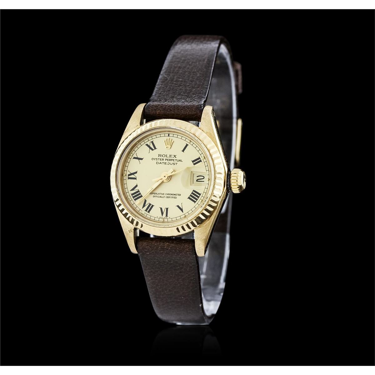 One ladies, hand crafted & machine milled Rolex DateJust model wristwatch electronically tested 18KT yellow gold, Case: 26mm oyster, Crown: twinlock with logo, Bezel: fluted, Crystal: acrylic cyclops lens, Circa: 1978. Movement: superlative chronometer, Dial: Champagne, baton hands, and Roman numerals, Date Window: 3 o'clock position, non-quick set, Bracelet: leather strap, Condition: G-4 Average. Bright polish finish. Six and one half inch length, adjustable. Total Weight of Watch 32.67gm. AIG Appraised at $6,880.00.