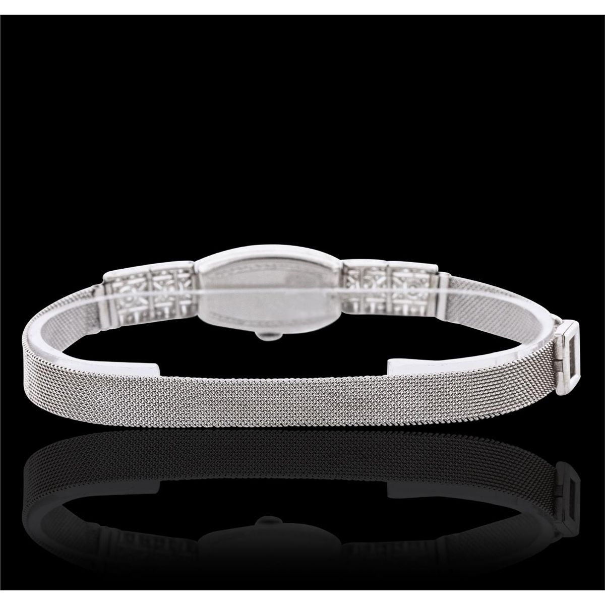 One, cast manufactured Art Deco platinum and 18K white gold W. ALLEMAHN MONTREUX diamond lady's wrist watch with Swiss made mechanical movement, 17 jewels. Case and Lugs: platinum engraved on the sides, acrylic crystal, measures 23mm x 14mm. Diamonds are set on top and lugs. Case signed inside "900".Dial: White in color with Arabic markers and pointed hands. Bracelet: Mesh design, 18K white gold, buckle clasp 6" in length. Signed "18ct".Total Weight of the watch: 22.40 grams Condition: G-4 FINE, (good working order and good condition). Containing: Four gypsy set transitional cut diamonds, measuring 2.10 - 2.10 x 1.30mm (depth est.) approximate total weight of 4 Stones = 0.14ct. Clarity: SI-2. Color: H - I. Seventy-Four bead set single cut diamonds, measuring 1.80 - 1.20 x 0.72mm (depth est.) approximate total weight of 74 Stones = 0.73ct. Clarity: SI-1 to SI-2. Color: I - J. All diamonds are graded in the mounting, unless otherwise stated. GGL Appraised at $4,345.00.