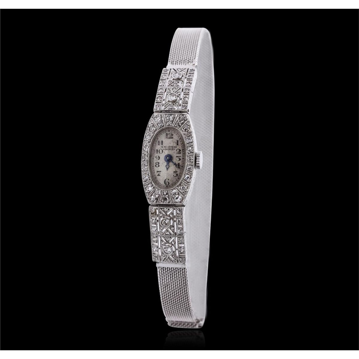 One, cast manufactured Art Deco platinum and 18K white gold W. ALLEMAHN MONTREUX diamond lady's wrist watch with Swiss made mechanical movement, 17 jewels. Case and Lugs: platinum engraved on the sides, acrylic crystal, measures 23mm x 14mm. Diamonds are set on top and lugs. Case signed inside "900".Dial: White in color with Arabic markers and pointed hands. Bracelet: Mesh design, 18K white gold, buckle clasp 6" in length. Signed "18ct".Total Weight of the watch: 22.40 grams Condition: G-4 FINE, (good working order and good condition). Containing: Four gypsy set transitional cut diamonds, measuring 2.10 - 2.10 x 1.30mm (depth est.) approximate total weight of 4 Stones = 0.14ct. Clarity: SI-2. Color: H - I. Seventy-Four bead set single cut diamonds, measuring 1.80 - 1.20 x 0.72mm (depth est.) approximate total weight of 74 Stones = 0.73ct. Clarity: SI-1 to SI-2. Color: I - J. All diamonds are graded in the mounting, unless otherwise stated. GGL Appraised at $4,345.00.