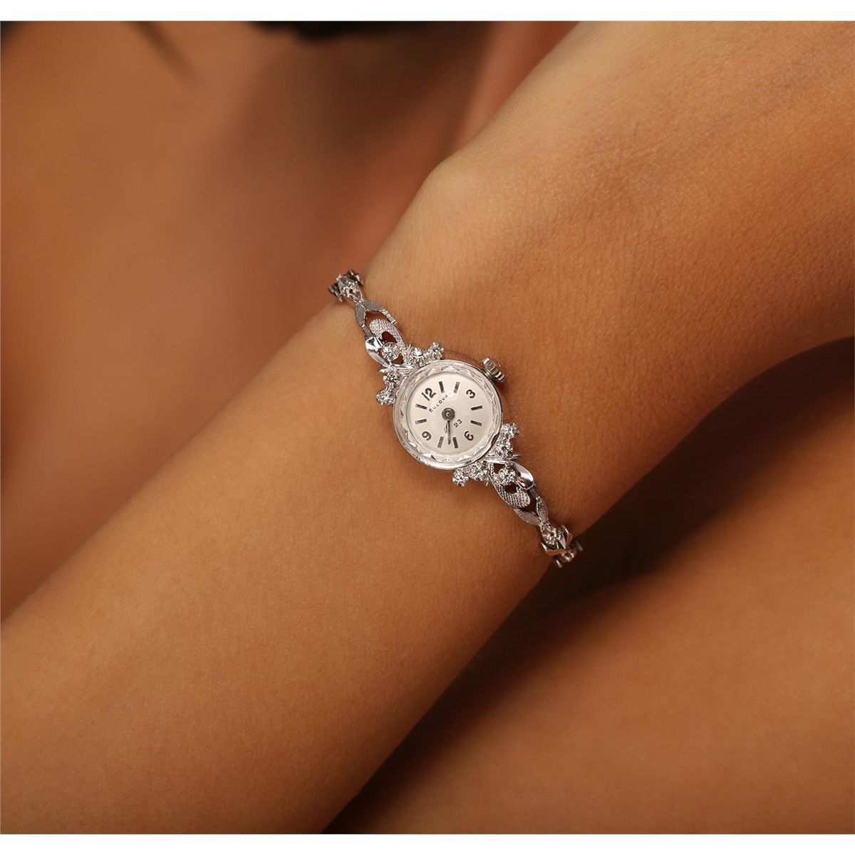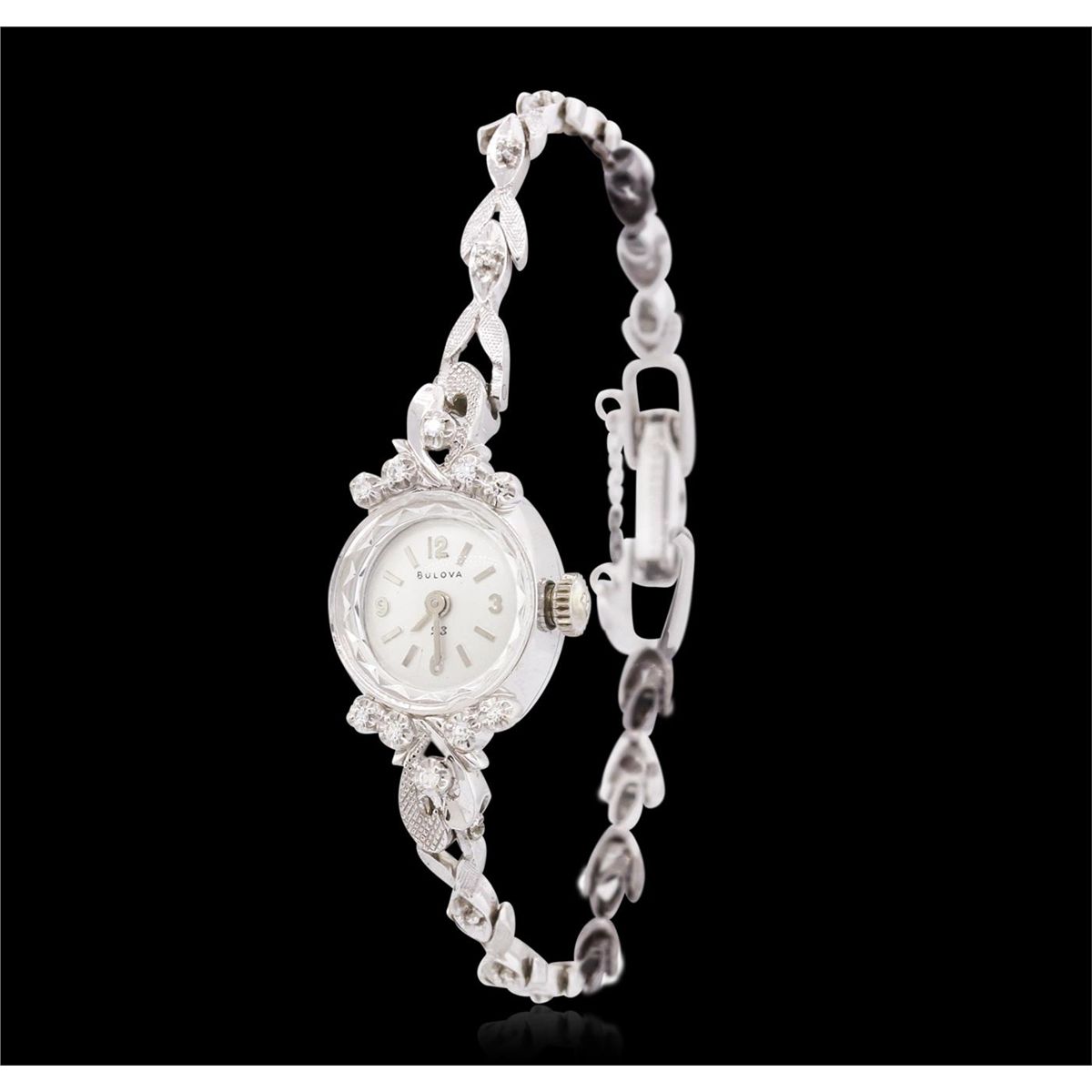 One ladies, vintage Bulova diamond wristwatch electronically tested, 14KT white gold Case: 17 x 13mm, Scalloped Crown: dial & movement set, Bezel: diamond set, Crystal: domed acrylic. Case No. 12432.USA Movement: twenty three jewel mechanical, Dial: Silvered, with baton pointed type hands, numerals & indices, 14KT white gold Bracelet: diamond set links, Condition: G-4 Average. Bright polish finish, Six inch length. Over locking clasp. Containing: Twenty Four bright cut & bead set single cut diamonds, approximate. Total Weight of 24 Stones = 0.15ct. Graded in the setting. Clarity: VS-1 to VS-2. Color: G - I. Total Weight of Diamonds 0.15ct. Total Weight of Watch 14.68 grams. AIG Appraised at $3,880.00.