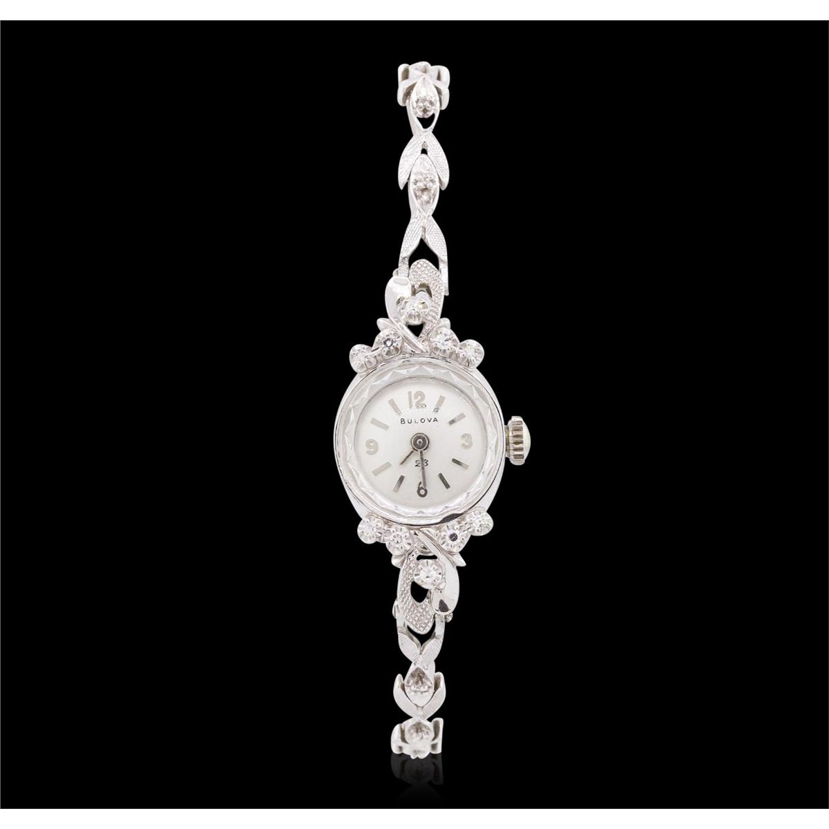 One ladies, vintage Bulova diamond wristwatch electronically tested, 14KT white gold Case: 17 x 13mm, Scalloped Crown: dial & movement set, Bezel: diamond set, Crystal: domed acrylic. Case No. 12432.USA Movement: twenty three jewel mechanical, Dial: Silvered, with baton pointed type hands, numerals & indices, 14KT white gold Bracelet: diamond set links, Condition: G-4 Average. Bright polish finish, Six inch length. Over locking clasp. Containing: Twenty Four bright cut & bead set single cut diamonds, approximate. Total Weight of 24 Stones = 0.15ct. Graded in the setting. Clarity: VS-1 to VS-2. Color: G - I. Total Weight of Diamonds 0.15ct. Total Weight of Watch 14.68 grams. AIG Appraised at $3,880.00.