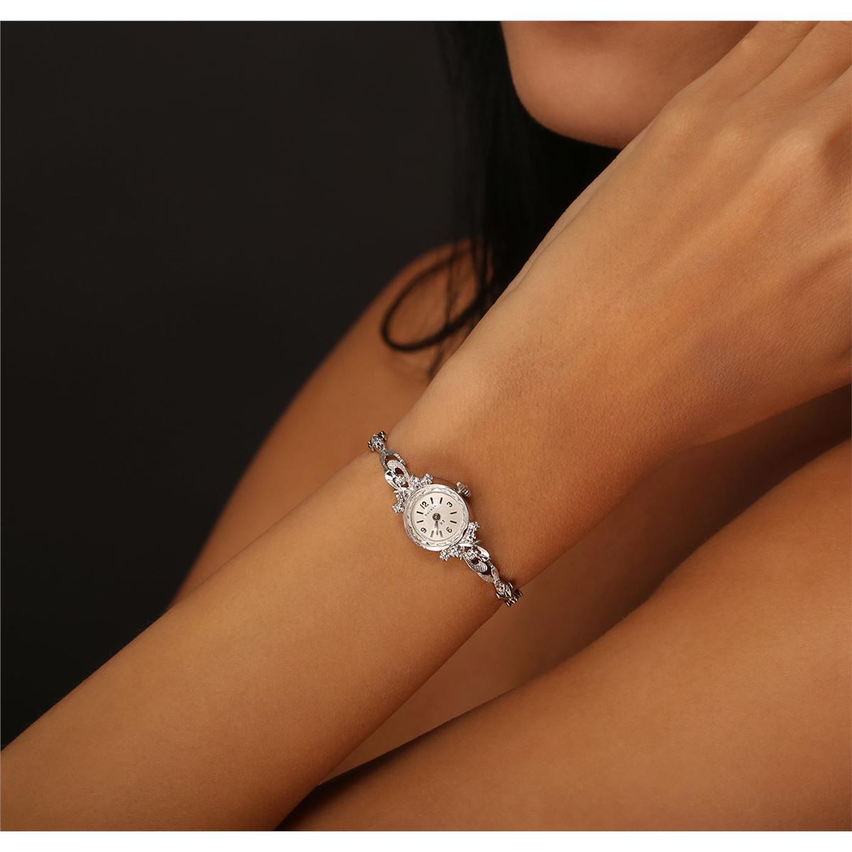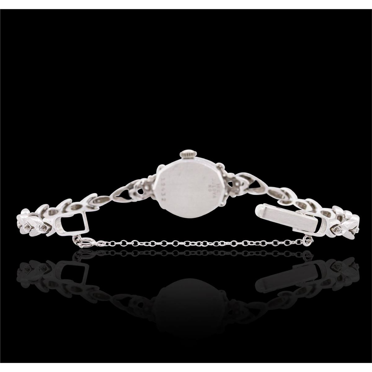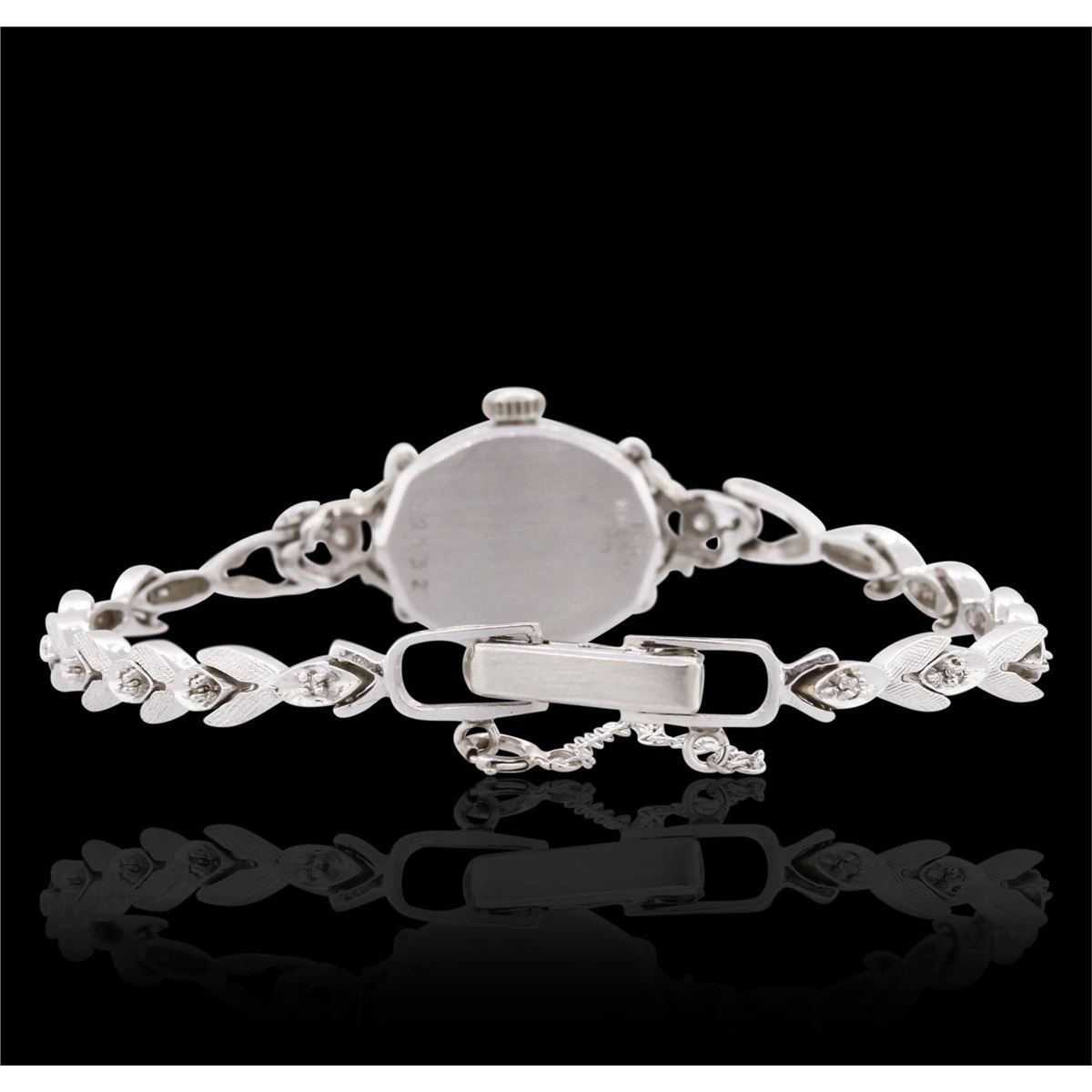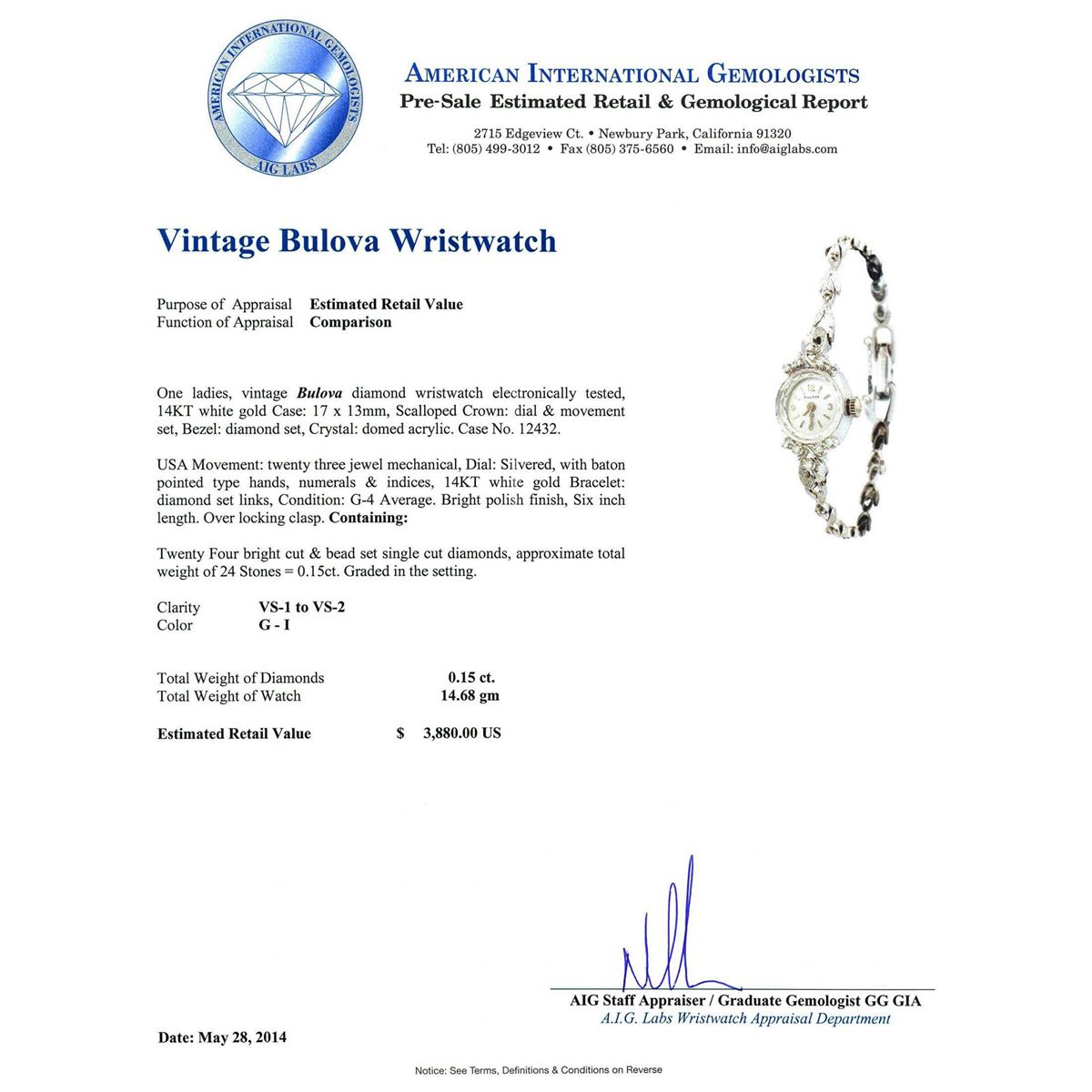 One ladies, vintage Bulova diamond wristwatch electronically tested, 14KT white gold Case: 17 x 13mm, Scalloped Crown: dial & movement set, Bezel: diamond set, Crystal: domed acrylic. Case No. 12432.USA Movement: twenty three jewel mechanical, Dial: Silvered, with baton pointed type hands, numerals & indices, 14KT white gold Bracelet: diamond set links, Condition: G-4 Average. Bright polish finish, Six inch length. Over locking clasp. Containing: Twenty Four bright cut & bead set single cut diamonds, approximate. Total Weight of 24 Stones = 0.15ct. Graded in the setting. Clarity: VS-1 to VS-2. Color: G - I. Total Weight of Diamonds 0.15ct. Total Weight of Watch 14.68 grams. AIG Appraised at $3,880.00.