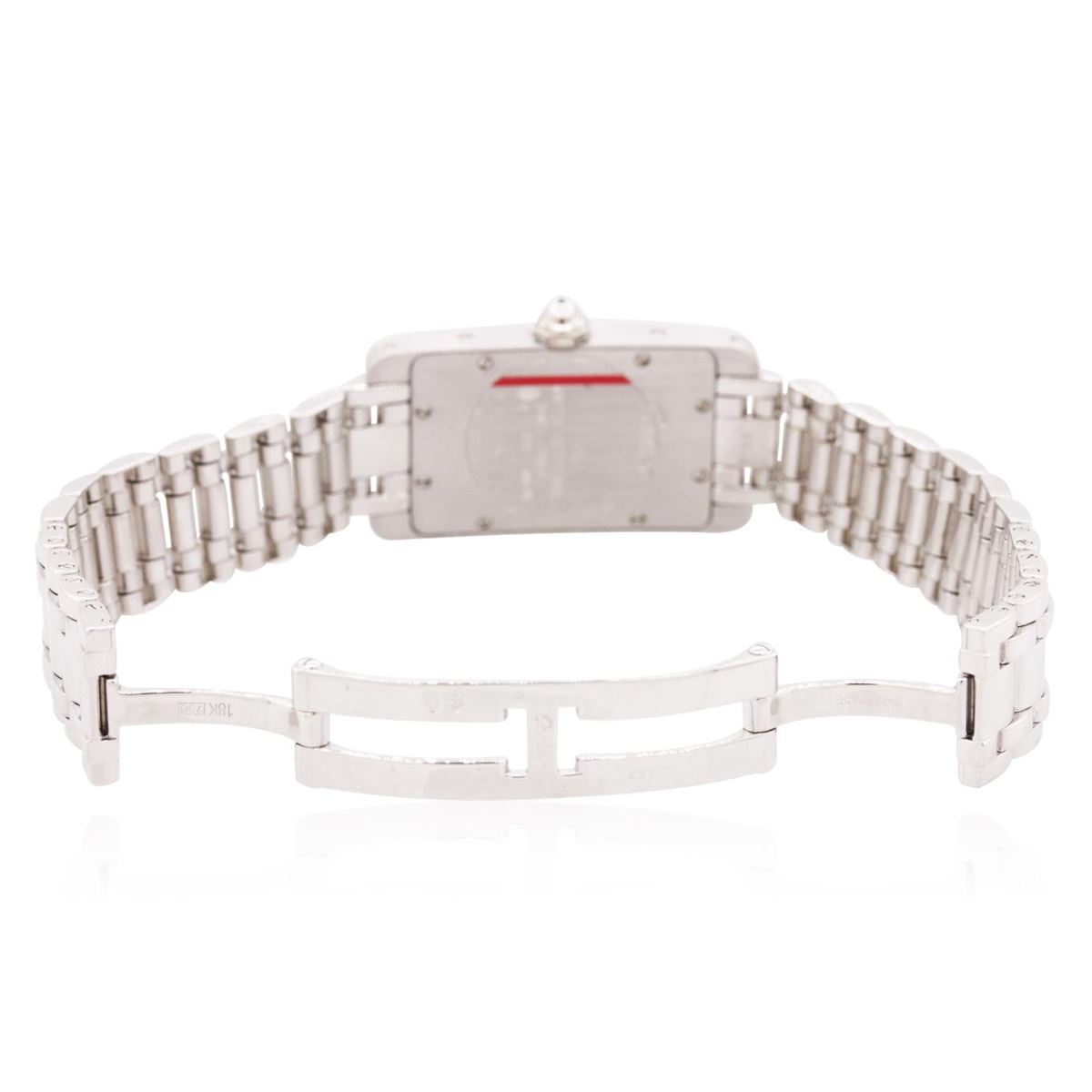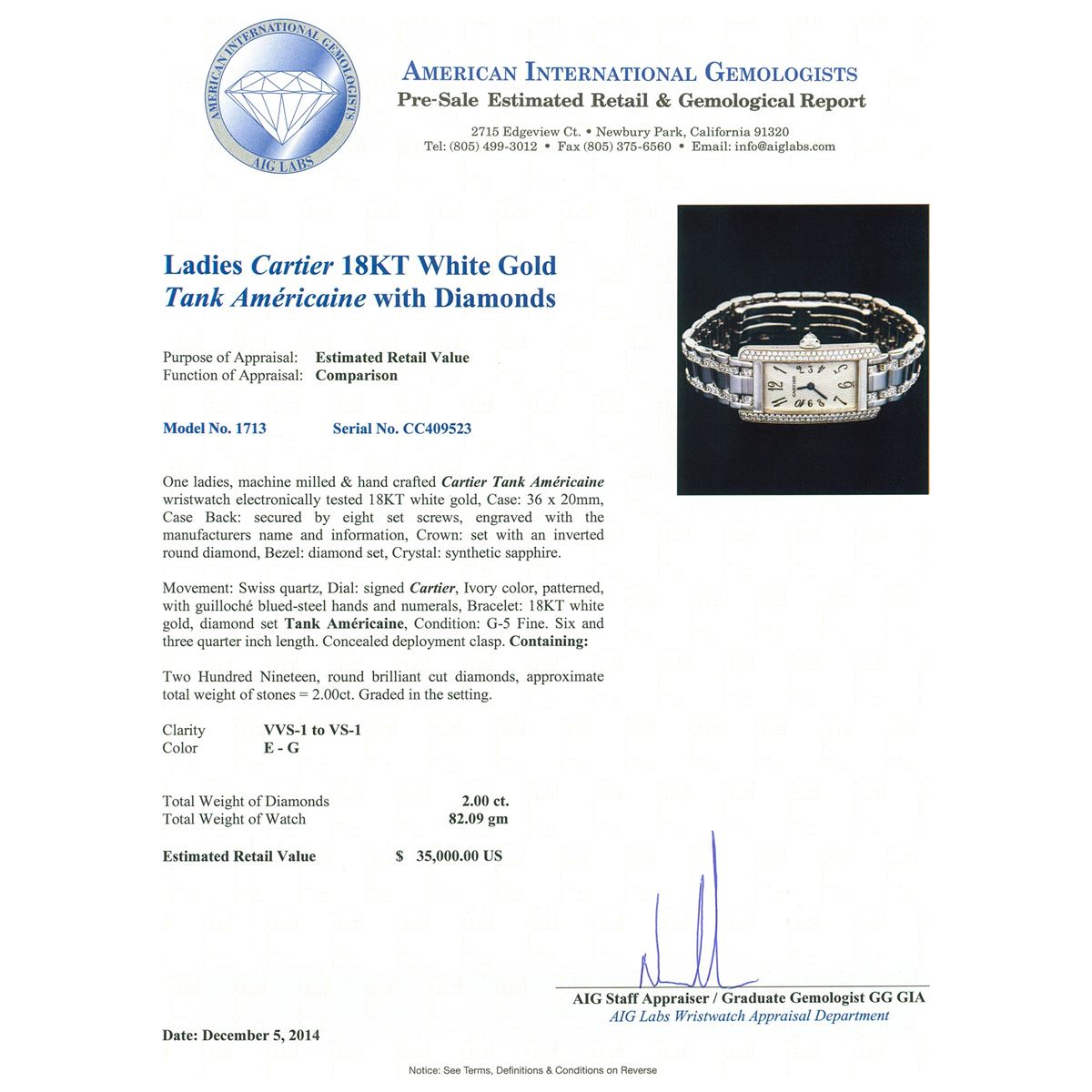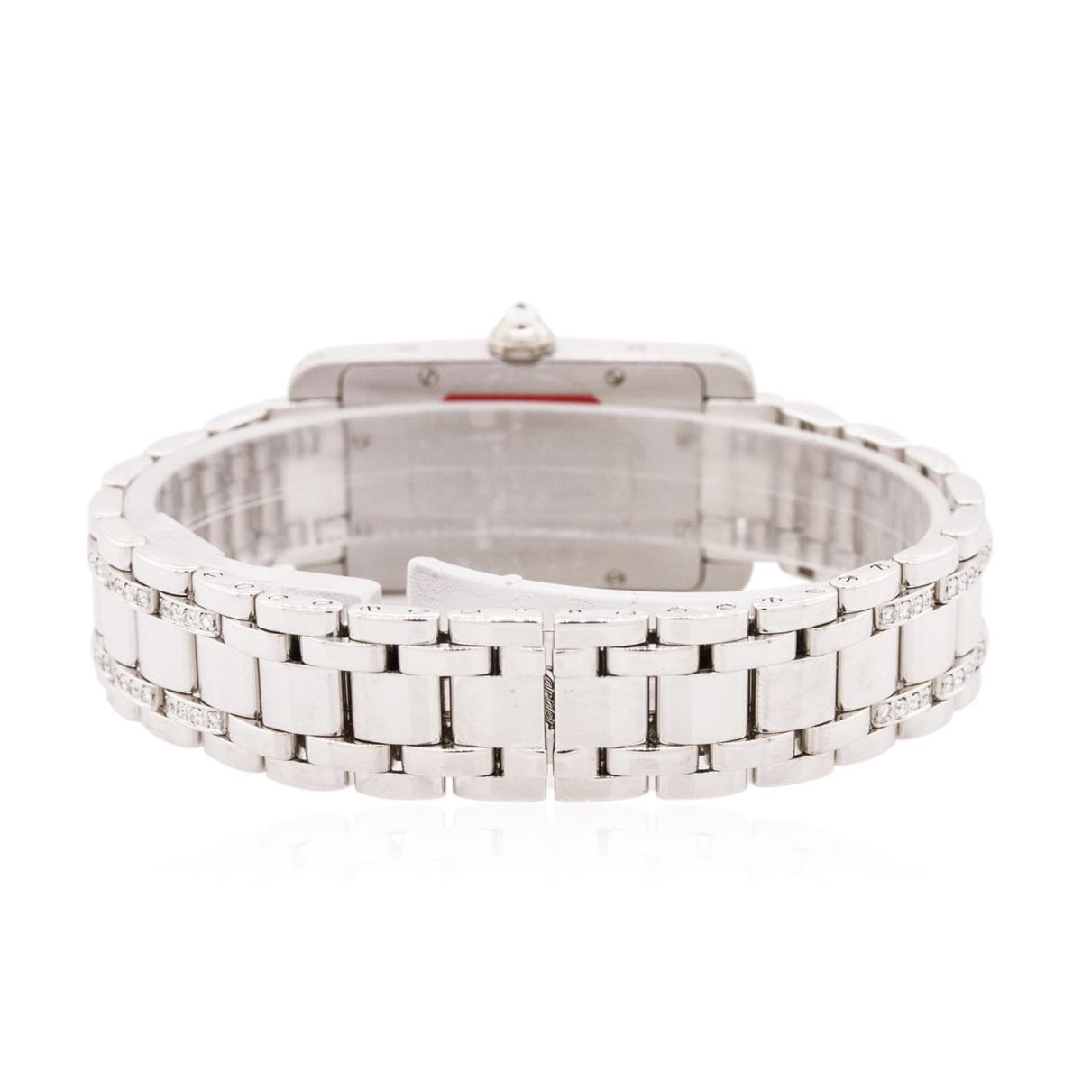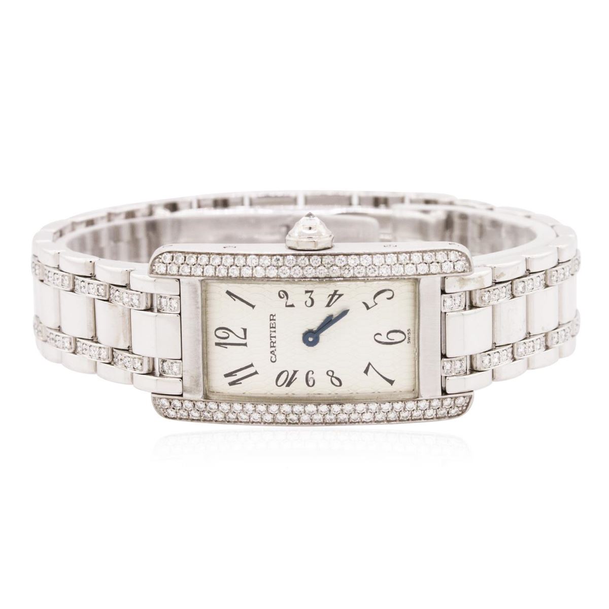 One ladies, machine milled & hand crafted Cartier Tank Americaine wristwatch electronically tested 18KT white gold, Case: 36 x 20mm, Case Back: secured by eight set screws, engraved with the manufacturers name and information, Crown: set with an inverted round diamond, Bezel: diamond set, Crystal: synthetic sapphire. Movement: Swiss quartz, Dial: signed Cartier, Ivory color, patterned, with guilloch, blued-steel hands and numerals, Bracelet: 18KT white gold, diamond set Tank Americaine, Condition: G-5 Fine. Six and three quarter inch length. Concealed deployment clasp. Containing: Two Hundred Nineteen, round brilliant cut diamonds, approximate total weight of stones = 2.00ct. Graded in the setting. Clarity: VVS-1 to VS-1. Color: E - G. Total Weight of Diamonds 2.00ct. Total Weight of Watch 82.09 grams. AIG Appraised at $35,000.00.