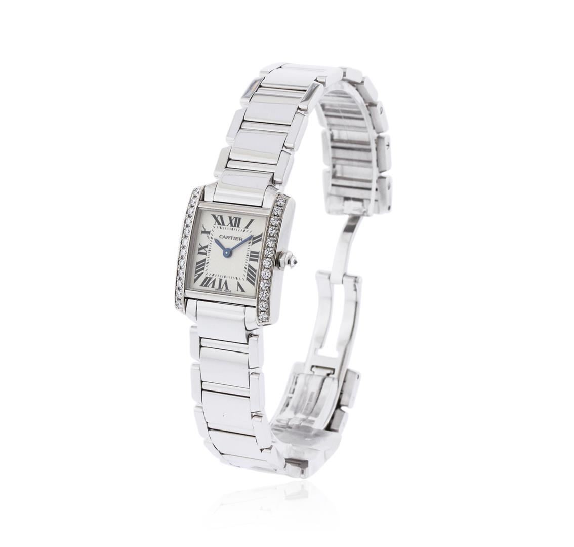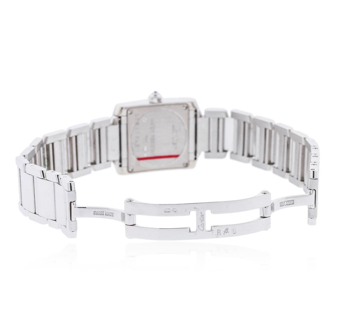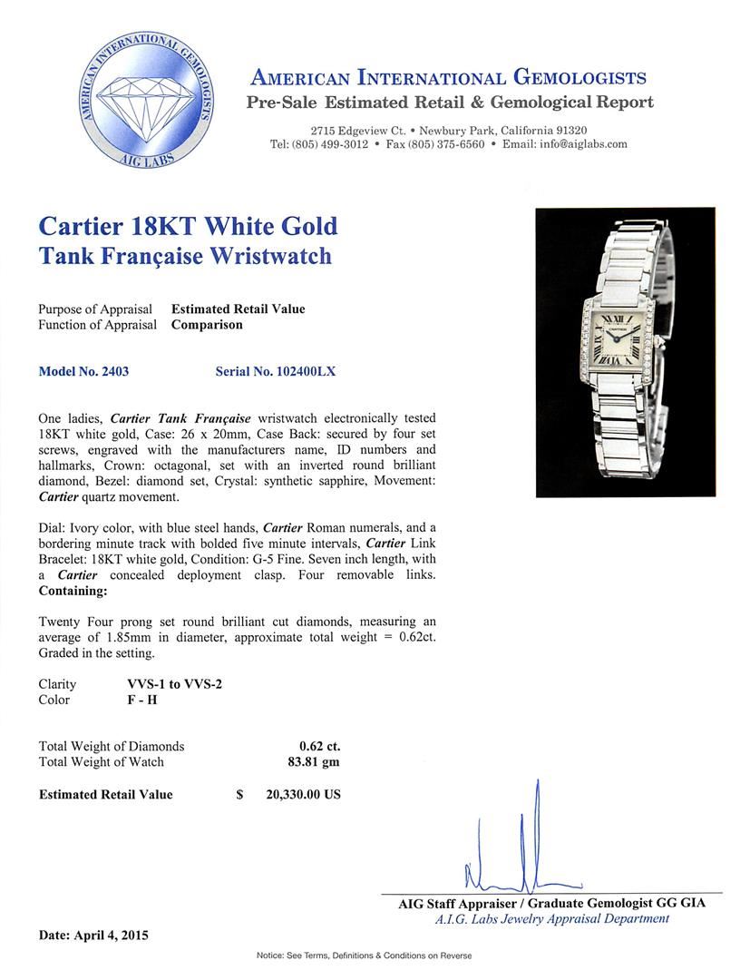 One ladies, Cartier Tank Francaise wristwatch electronically tested 18KT white gold, Case: 26 x 20mm, Case Back: secured by four set screws, engraved with the manufacturers name, ID numbers and hallmarks, Crown: octagonal, set with an inverted round brilliant diamond, Bezel: diamond set, Crystal: synthetic sapphire, Movement: Cartier quartz movement. Dial: Ivory color, with blue steel hands, Cartier Roman numerals, and a bordering minute track with bolded five minute intervals, Cartier Link Bracelet: 18KT white gold, Condition: G-5 Fine. Seven inch length, with a Cartier concealed deployment clasp. Four removable links. Containing: Twenty Four prong set round brilliant cut diamonds, measuring an average of 1.85mm in diameter, approximate total weight = 0.62ct. Graded in the setting. Clarity: VVS-1 to VVS-2 Color F - H. Total Weight of Diamonds 0.62ct. Total Weight of Watch 83.81 grams. AIG Appraised at $20,330.00.