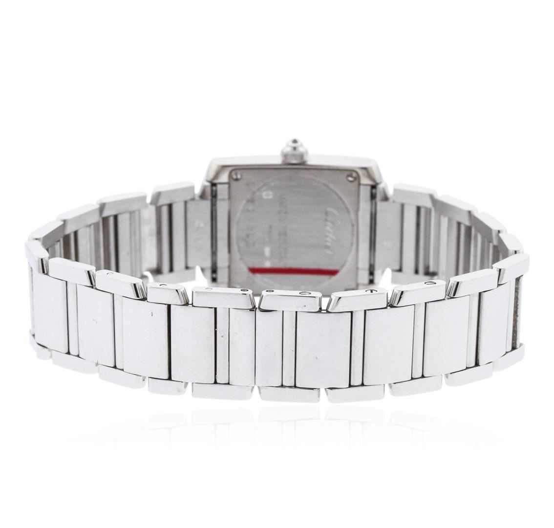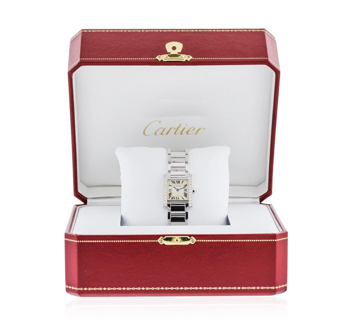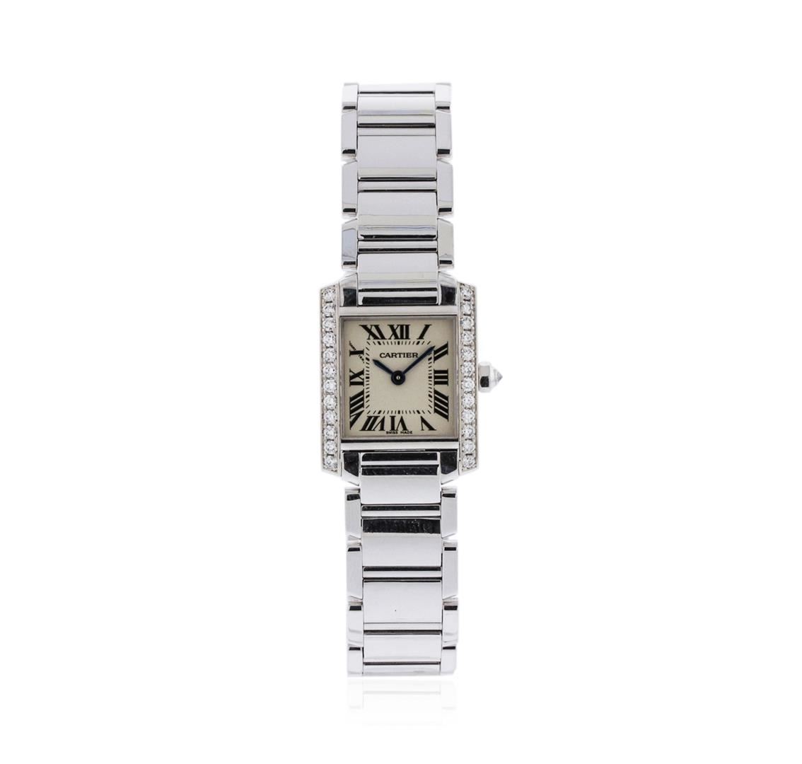 One ladies, Cartier Tank Francaise wristwatch electronically tested 18KT white gold, Case: 26 x 20mm, Case Back: secured by four set screws, engraved with the manufacturers name, ID numbers and hallmarks, Crown: octagonal, set with an inverted round brilliant diamond, Bezel: diamond set, Crystal: synthetic sapphire, Movement: Cartier quartz movement. Dial: Ivory color, with blue steel hands, Cartier Roman numerals, and a bordering minute track with bolded five minute intervals, Cartier Link Bracelet: 18KT white gold, Condition: G-5 Fine. Seven inch length, with a Cartier concealed deployment clasp. Four removable links. Containing: Twenty Four prong set round brilliant cut diamonds, measuring an average of 1.85mm in diameter, approximate total weight = 0.62ct. Graded in the setting. Clarity: VVS-1 to VVS-2 Color F - H. Total Weight of Diamonds 0.62ct. Total Weight of Watch 83.81 grams. AIG Appraised at $20,330.00.