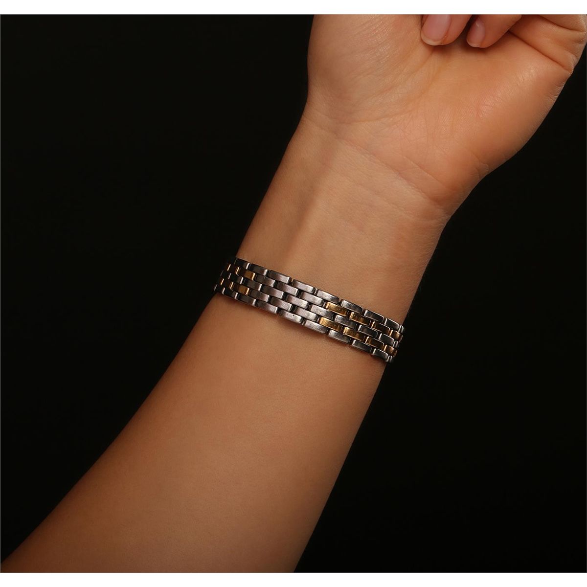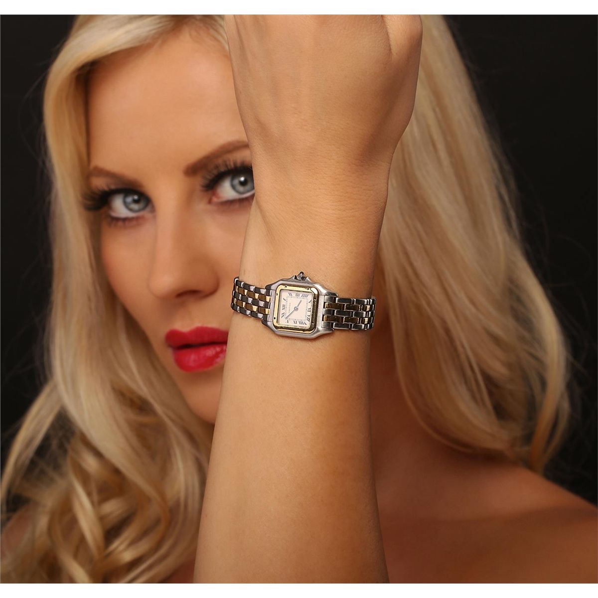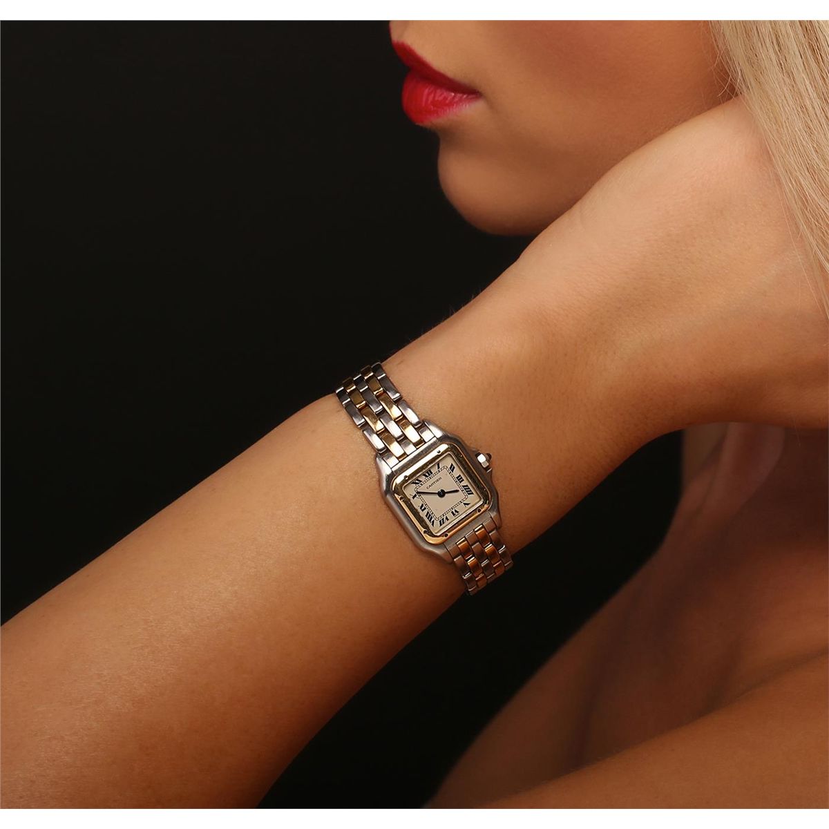 One ladies, Cartier Panthere wristwatch electronically tested stainless steel & 18KT yellow gold, Case: 30 x 22mm, Case Back: secured by eight inset screws, engraved with the manufacturers name, logo, and ID numbers, Crown: octagonal, set with a blue cabochon crystal within protective shoulders, Bezel: polished yellow gold set with eight inset rivets, Crystal: synthetic sapphire lens. Movement: quartz, Dial: ivory color, with sword shaped Blued steel hands & Cartier Black Roman numerals, Bracelet: Panthere three rows of stainless steel links & two rows of 18KT yellow gold links, Condition: G-4 Average. Bright polish finish. Six inch length. Three removable links. Concealed deployment clasp. Total Weight of Watch 42.41 grams. AIG Appraised at $4,150.00.