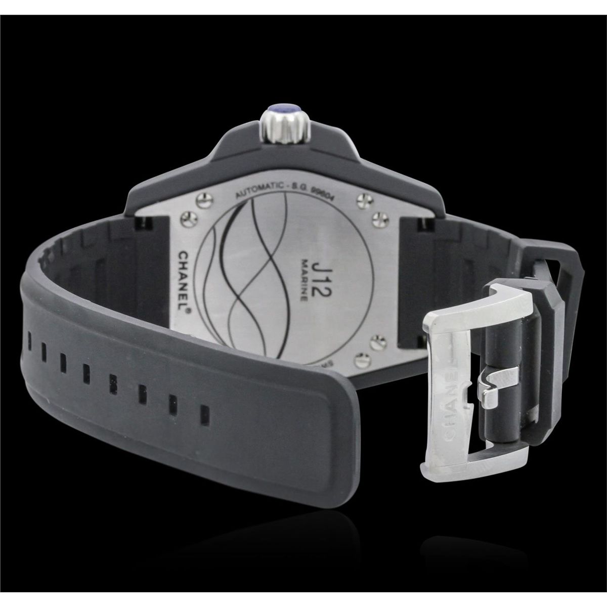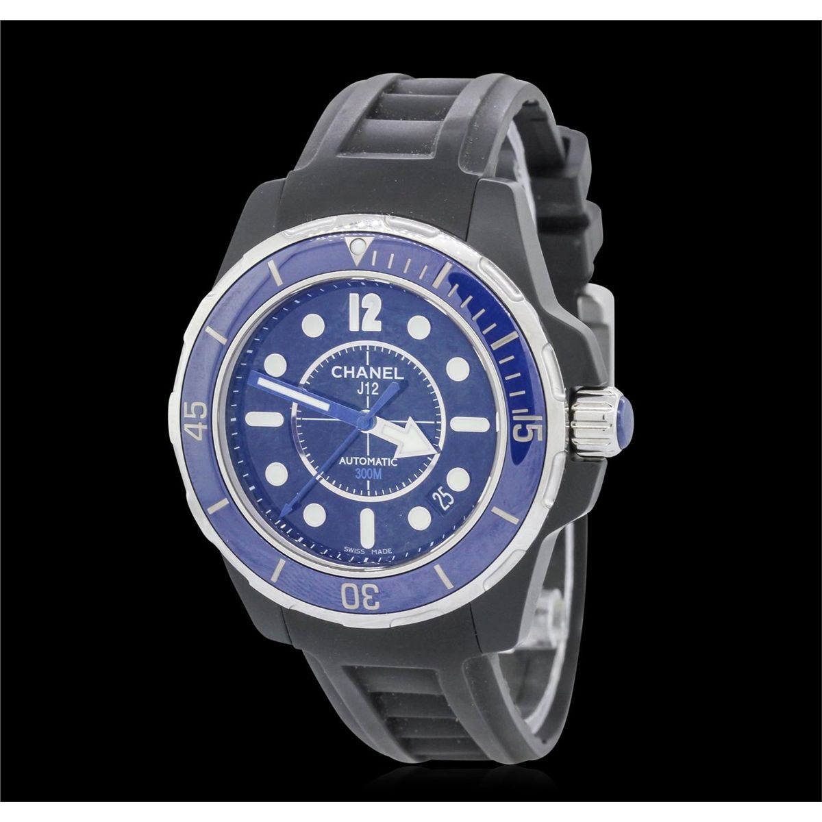 One ladies Chanel J12 Marine Wristwatch featuring: Black Matte Rubber Strap, Automatic Mechanical movement, Analog Display, Date between 4 o'clock and 5 o'clock position, Unidirectional blue ceramic bezel, Blue Dial, luminous hands, dot hour markers with Arabic 12, Minute Markers Around Outer Rim, Scratch resistant sapphire crystal, Steel Crown, 38mm Case, hidden deployment clasp. Water Resistant to 300m.