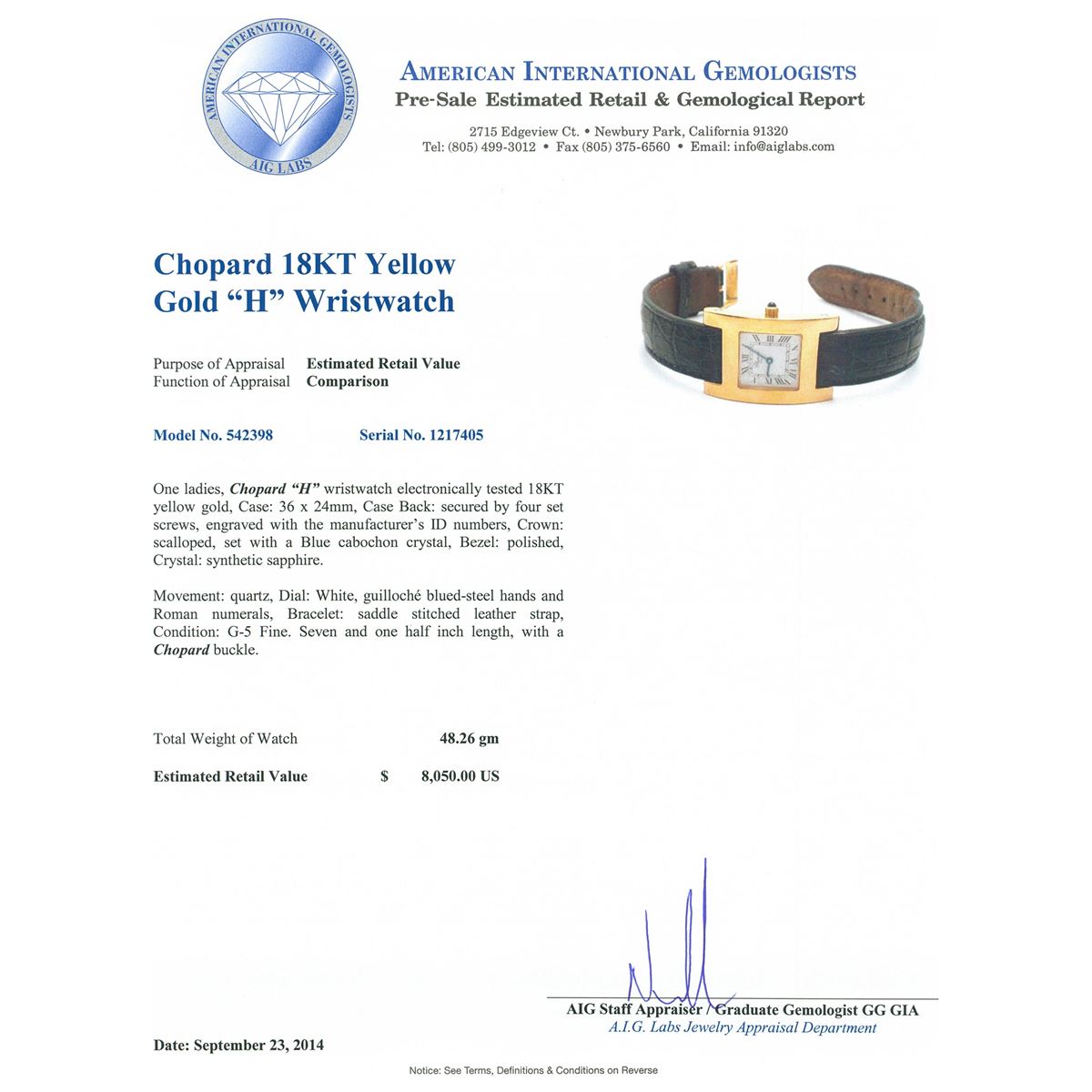 One ladies, Chopard "H" wristwatch electronically tested 18KT yellow gold, Case: 36 x 24mm, Case Back: secured by four set screws, engraved with the manufacturer's ID numbers, Crown: scalloped, set with a Blue cabochon crystal, Bezel: polished, Crystal: synthetic sapphire. Movement: quartz, Dial: White, guilloch, blued-steel hands and Roman numerals, Bracelet: saddle stitched leather strap, Condition: G-5 Fine. Seven and one half inch length, with a Chopard buckle. Total Weight of Watch 48.26 grams. AIG Appraised at $8,050.00.