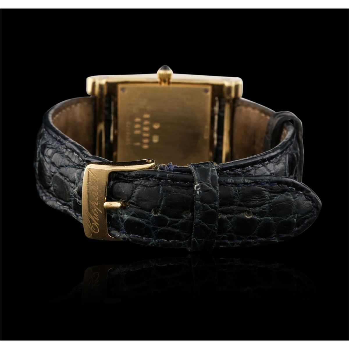 One ladies, Chopard "H" wristwatch electronically tested 18KT yellow gold, Case: 36 x 24mm, Case Back: secured by four set screws, engraved with the manufacturer's ID numbers, Crown: scalloped, set with a Blue cabochon crystal, Bezel: polished, Crystal: synthetic sapphire. Movement: quartz, Dial: White, guilloch, blued-steel hands and Roman numerals, Bracelet: saddle stitched leather strap, Condition: G-5 Fine. Seven and one half inch length, with a Chopard buckle. Total Weight of Watch 48.26 grams. AIG Appraised at $8,050.00.