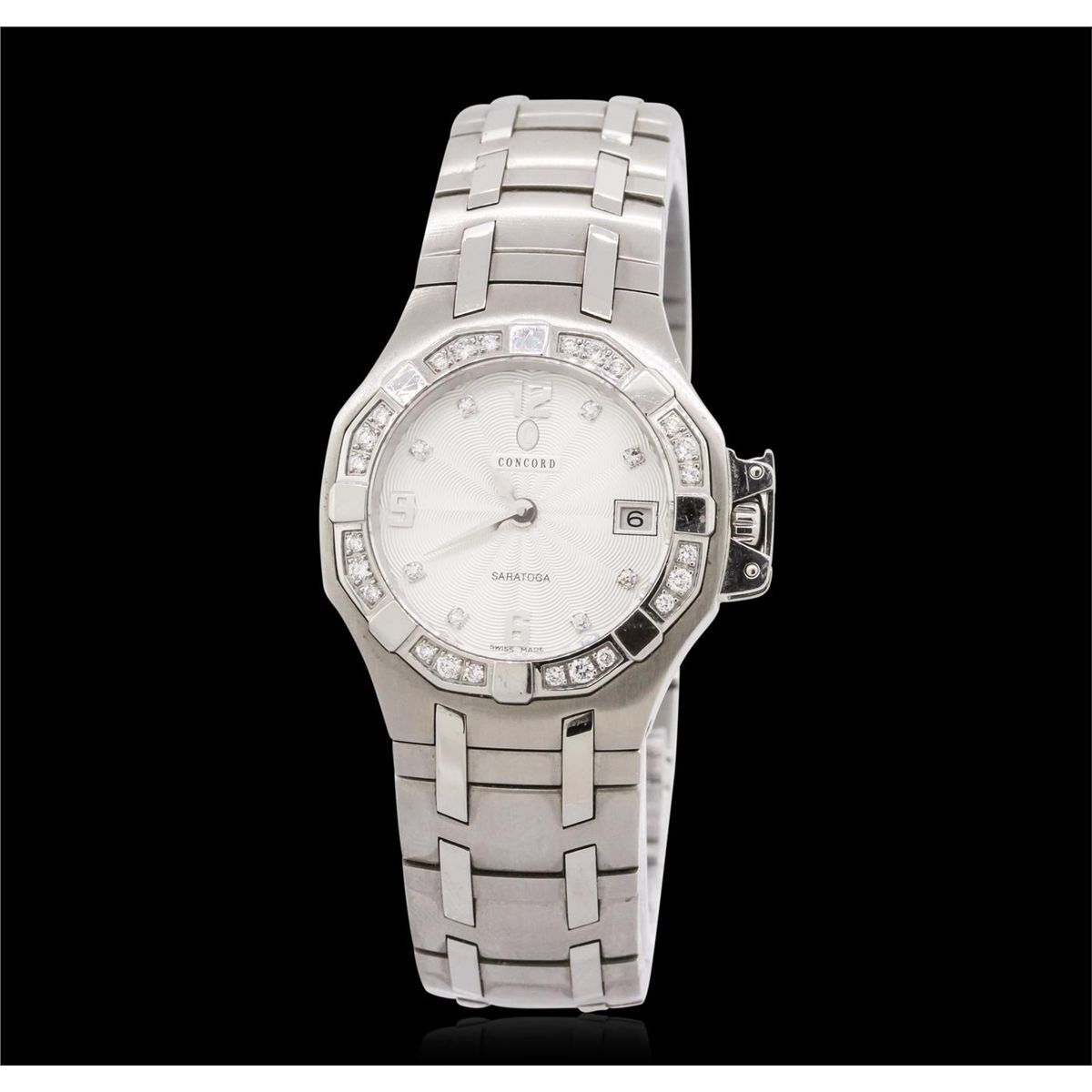 One ladies, Concord Saratoga wristwatch, electronically tested stainless steel, Case: 29mm, Case Back: engraved with the manufacturers name, logo, and ID numbers, secured by four set screws, Distinctive Hexagonal Shaped Bezel: diamond set, Crown: the crown is set under a latched crown protector, Crystal: synthetic sapphire. Movement: Swiss quartz, Dial: Silvered, with baton pointed hands, diamond indices and American style numerals. Date Window: 3 o'clock position. Concord Bracelet: stainless steel link. Condition: G-5Fine. Bright polish and brushed finish. Seven and one half inch length, adjustable. Concealed deployment clasp. Containing: Twenty Four round diamonds approximate. Total Weight of 24 Stones equals 0.22ct. Graded in the setting. Clarity: VVS2 - VS-2Color F - G Total Weight of Diamonds 0.22ct. Total Weight of Wristwatch 100.68 grams. AIG Appraised at $5,250.00.