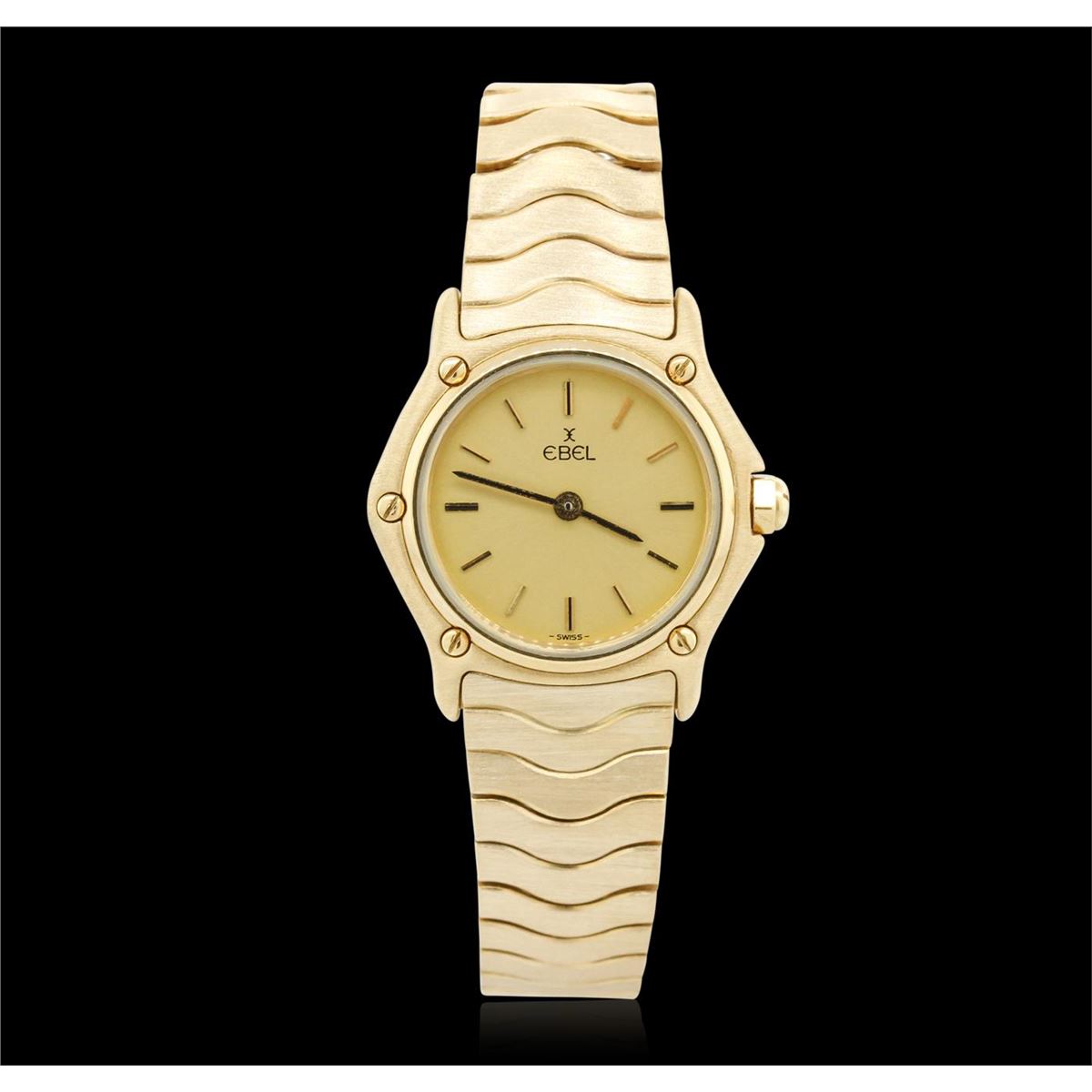 One ladies Ebel wristwatch featuring: 18KT Yellow Gold dial, case, crown, bracelet five screw bezel, gold dial with analog display, Ebel logo at 12 o'clock position, hour markers, black hour and minute hands Swiss movement, jeweler's clasp. Watch weighs a total of 52.90 grams.
