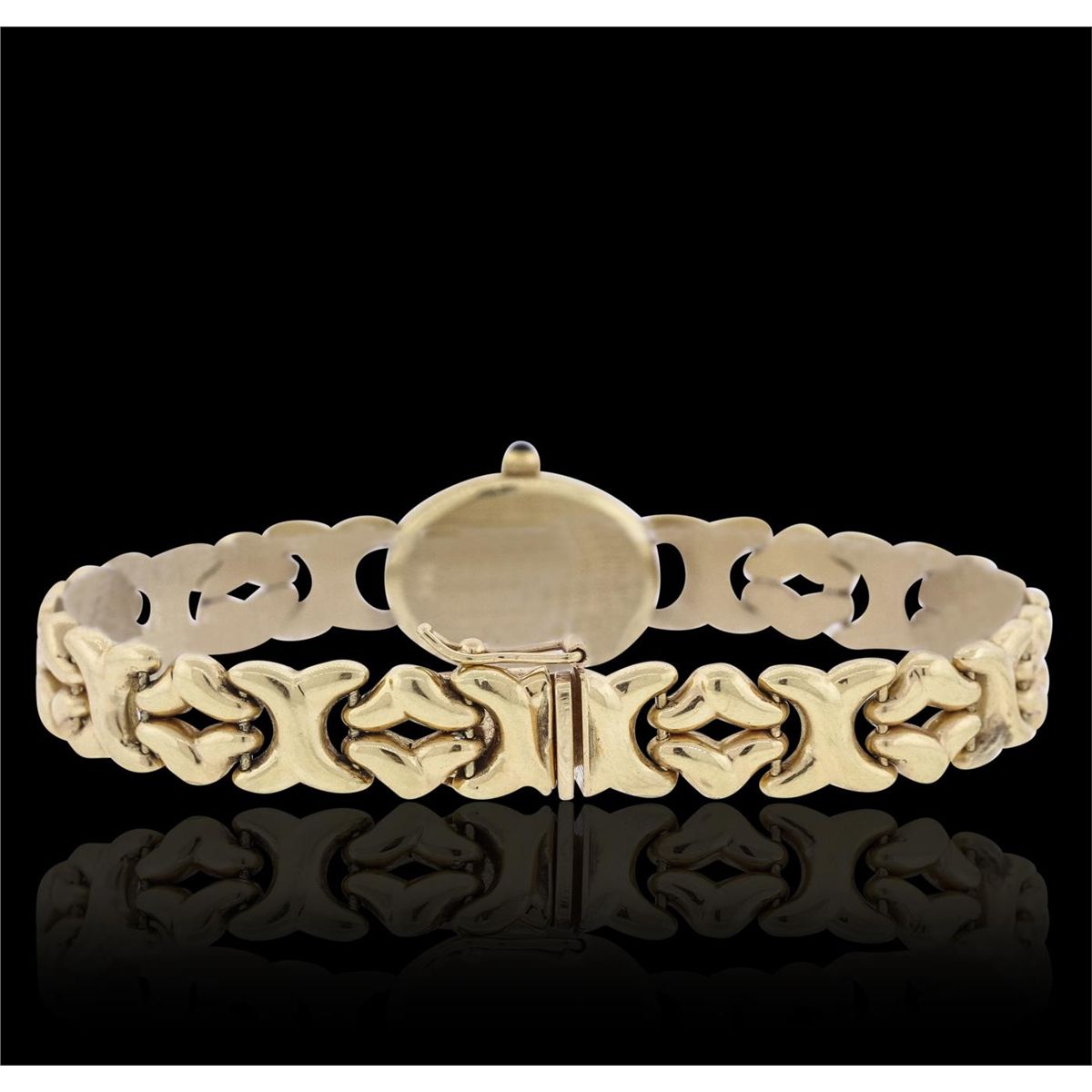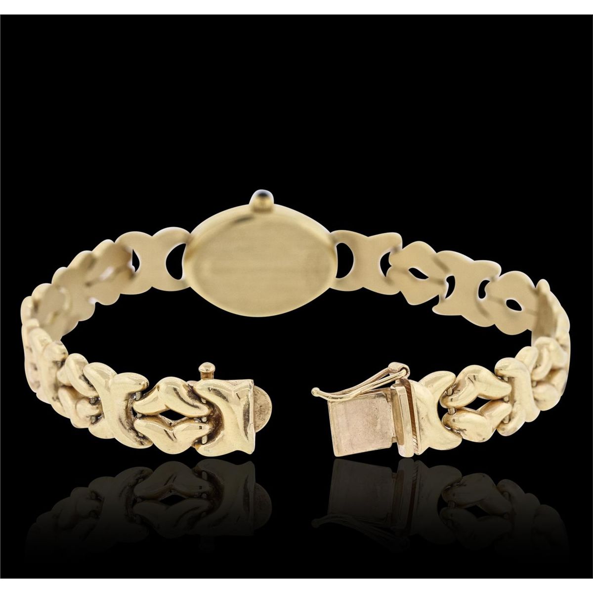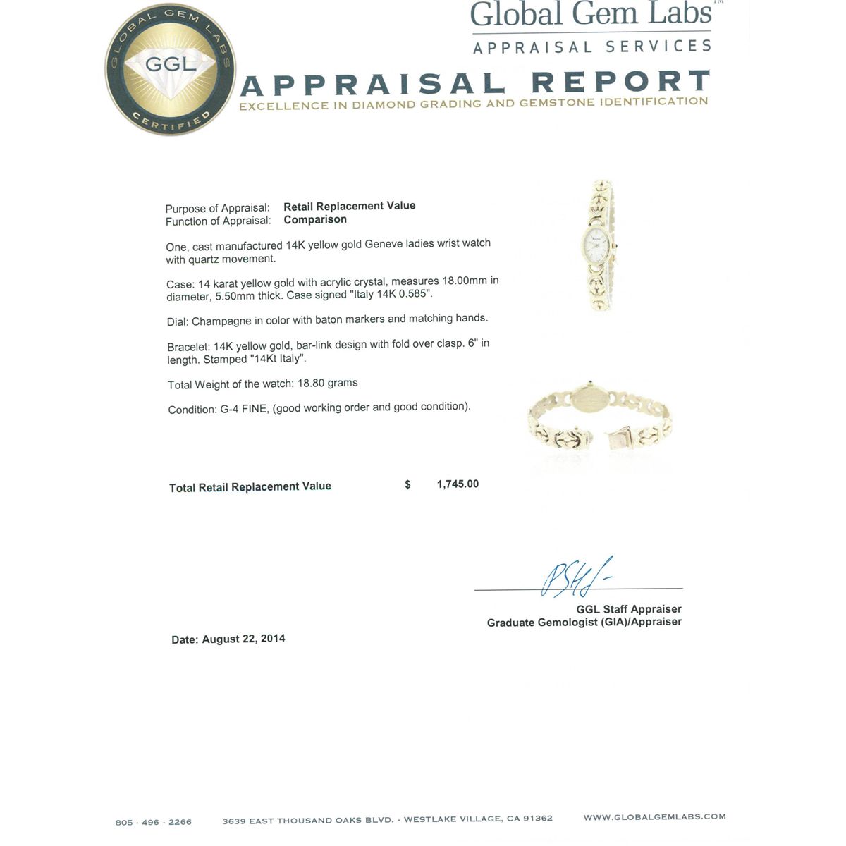 One, cast manufactured 14K yellow gold Geneve ladies wrist watch with quartz movement. Case: 14 karat yellow gold with acrylic crystal, measures 18.00mm in diameter, 5.50mm thick. Case signed "Italy 14K 0.585". Dial: Champagne in color with baton markers and matching hands. Bracelet: 14K yellow gold, bar-link design with fold over clasp. 6" in length. Stamped "14Kt Italy". Total Weight of the watch: 18.30 grams. Condition: G-4 FINE, (good working order and good condition). GGL Appraised at $1,745.00.