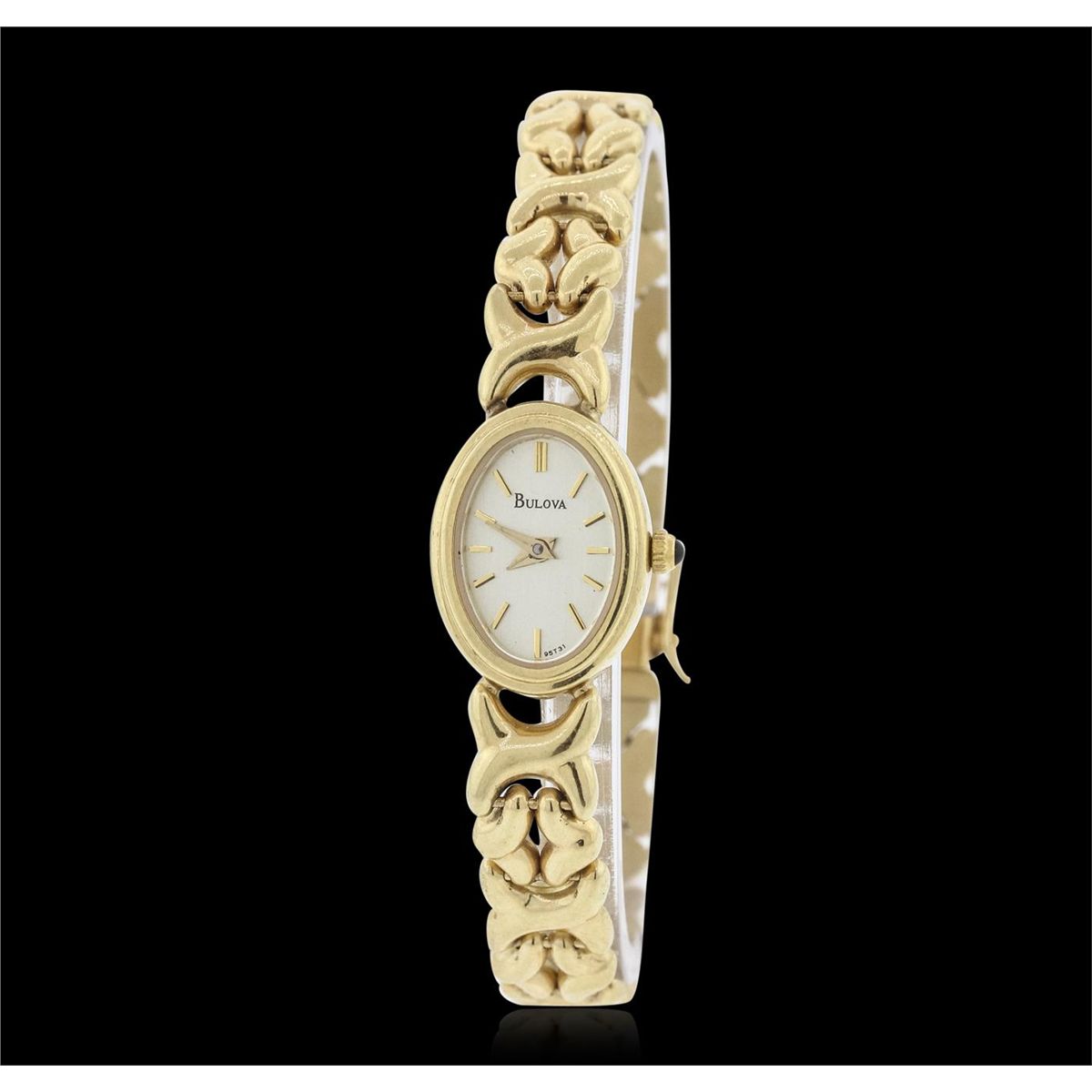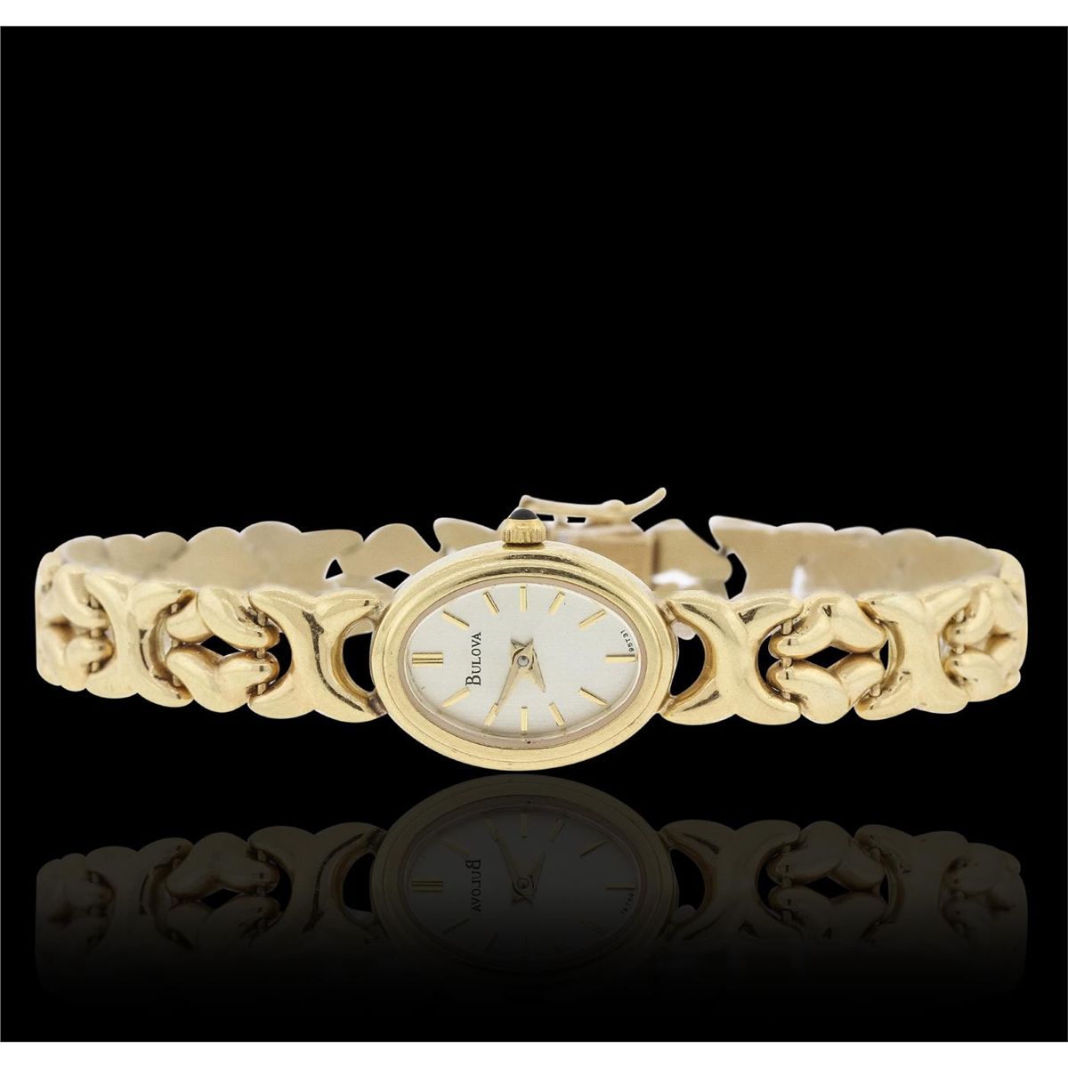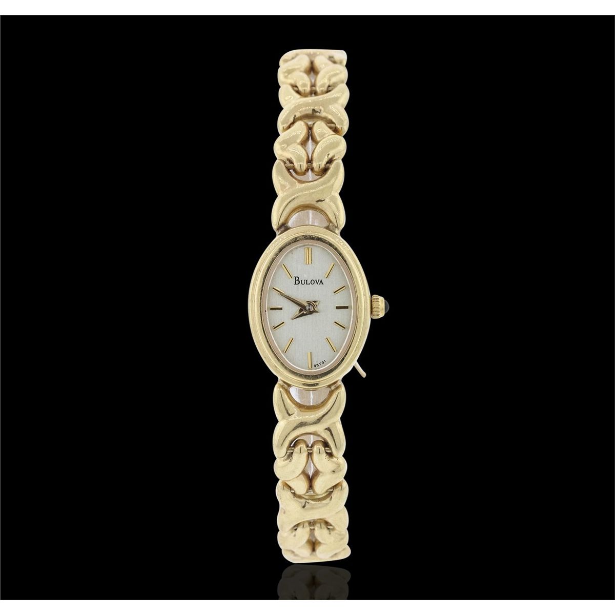 One, cast manufactured 14K yellow gold Geneve ladies wrist watch with quartz movement. Case: 14 karat yellow gold with acrylic crystal, measures 18.00mm in diameter, 5.50mm thick. Case signed "Italy 14K 0.585". Dial: Champagne in color with baton markers and matching hands. Bracelet: 14K yellow gold, bar-link design with fold over clasp. 6" in length. Stamped "14Kt Italy". Total Weight of the watch: 18.30 grams. Condition: G-4 FINE, (good working order and good condition). GGL Appraised at $1,745.00.