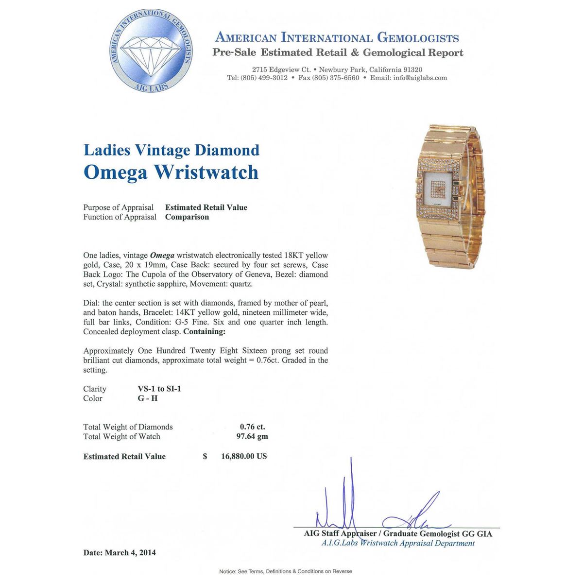 One ladies, vintage Omega wristwatch electronically tested 18KT yellow gold, Case, 20 x 19mm, Case Back: secured by four set screws, Case Back Logo: The Cupola of the Observatory of Geneva, Bezel: diamond set, Crystal: synthetic sapphire, Movement: quartz. Dial: the center section is set with diamonds, framed by mother of pearl, and baton hands, Bracelet: 14KT yellow gold, nineteen millimeter wide, full bar links, Condition: G-5 Fine. Six and one quarter inch length. Concealed deployment clasp. Containing: Approximately One Hundred Twenty Eight Sixteen prong set round brilliant cut diamonds, approximate total weight = 0.76ct. Graded in the setting. Clarity: VS-1 to SI-1. Color: G - H. Total Weight of Diamonds 0.76ct. Total Weight of Watch 97.64gm. AIG Appraised at $16,880.00.