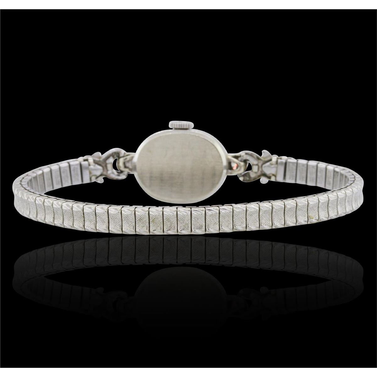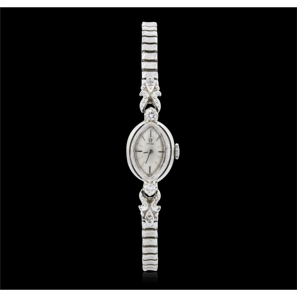 One Ladies Omega Vintage wristwatch featuring: Stainless Steel case, crown, bracelet, and bezel with diamond lugs, white dial with analog display, hour markers, hour and minute hands. This item measures 15mm across, including crown, and weighs a total of 14.30 grams.
