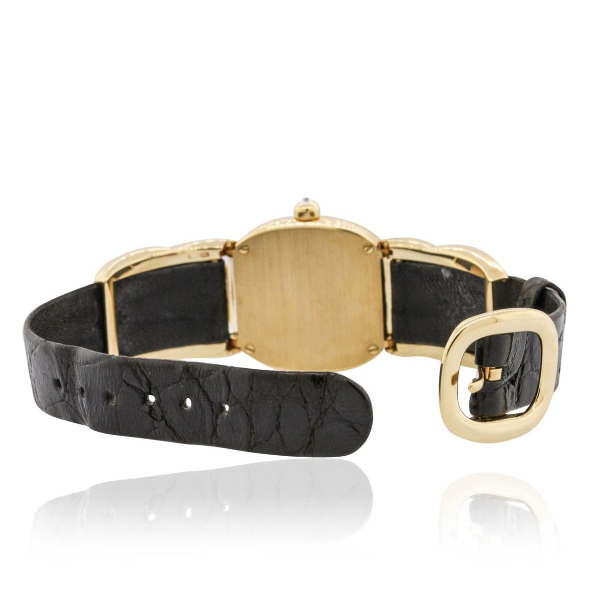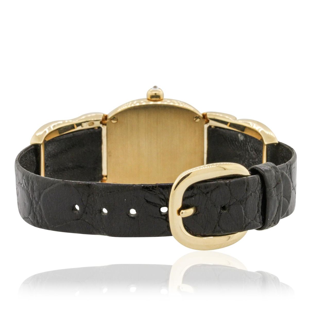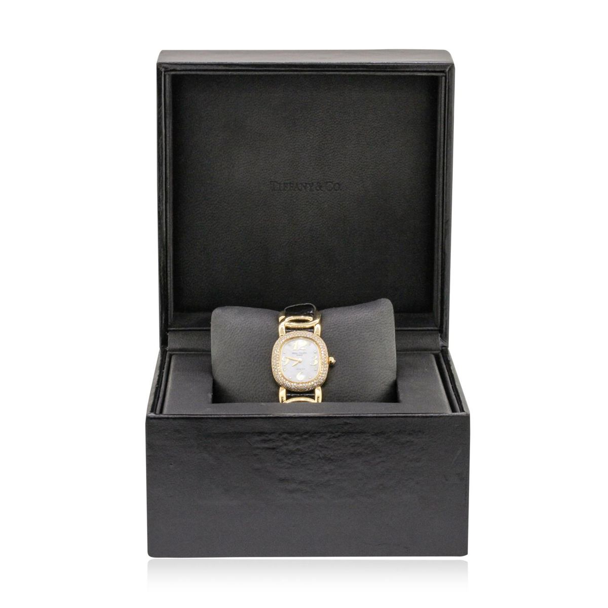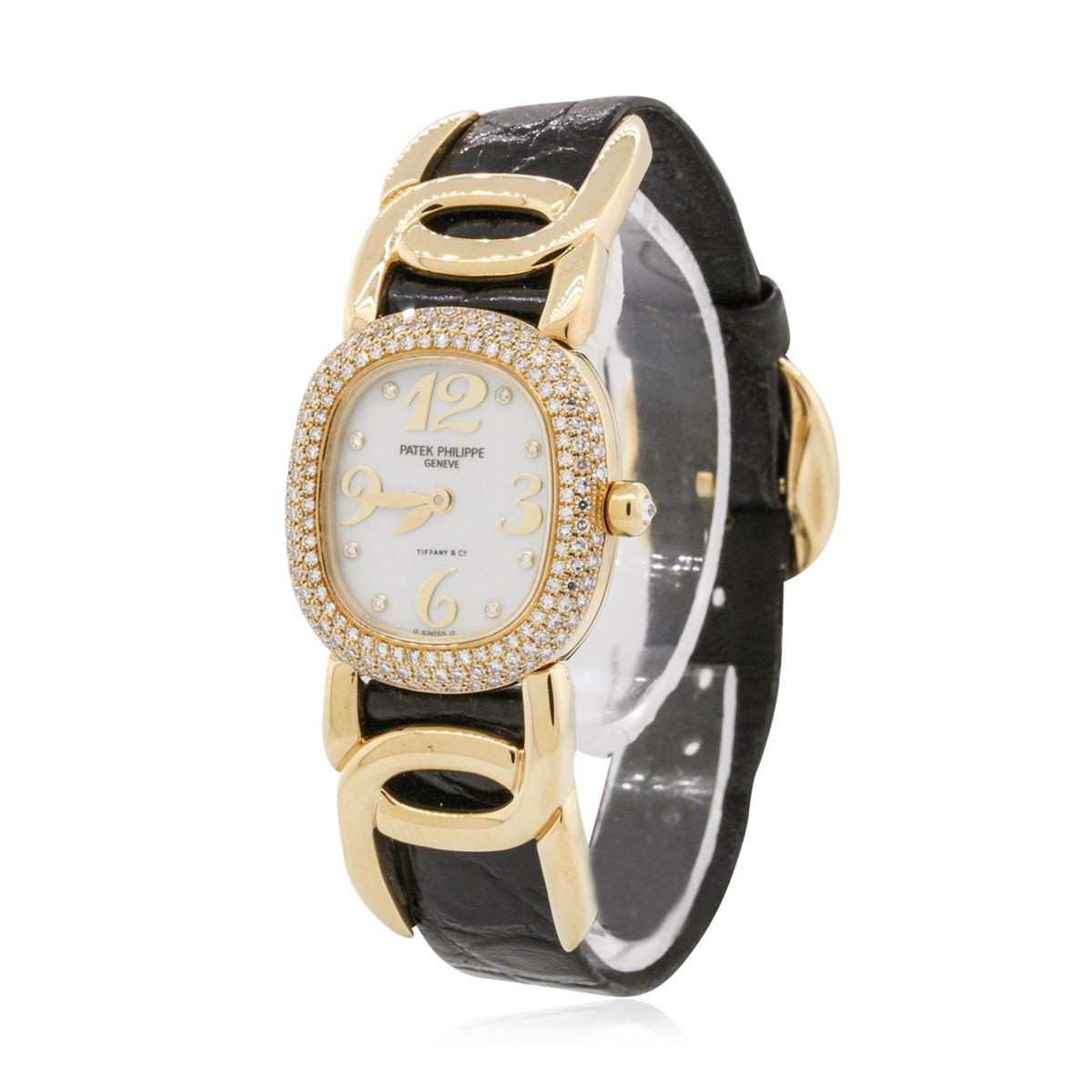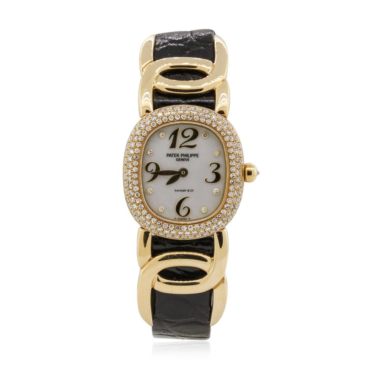 One ladies, Patek Philippe Golden Ellipse wristwatch electronically tested 18KT yellow gold, Elliptical Case: 24 x 23mm, Case Back: secured with four set screws, Case Lugs: hinged and intertwined, Bezel: diamond set, Crystal: synthetic sapphire. Movement: quartz, Dial: signed Tiffany & Co, and Patek Philippe, mother of pearl, golden hands, with indices and numerals, Patek Philippe Bracelet: leather strap, Condition: G-5 Fine. Seven inch length, adjustable, with the Patek Philippe 18KT yellow gold clasp. Containing: Approximately One Hundred Sixty single cut diamonds, approximate total weight equals 1.00ct. Set & graded in the bezel. Clarity VVS-2 Average. Color: E - F. Total Weight of Diamonds 1.00ct. Total Weight of Watch 40.87 grams. AIG Appraised at $25,000.00.