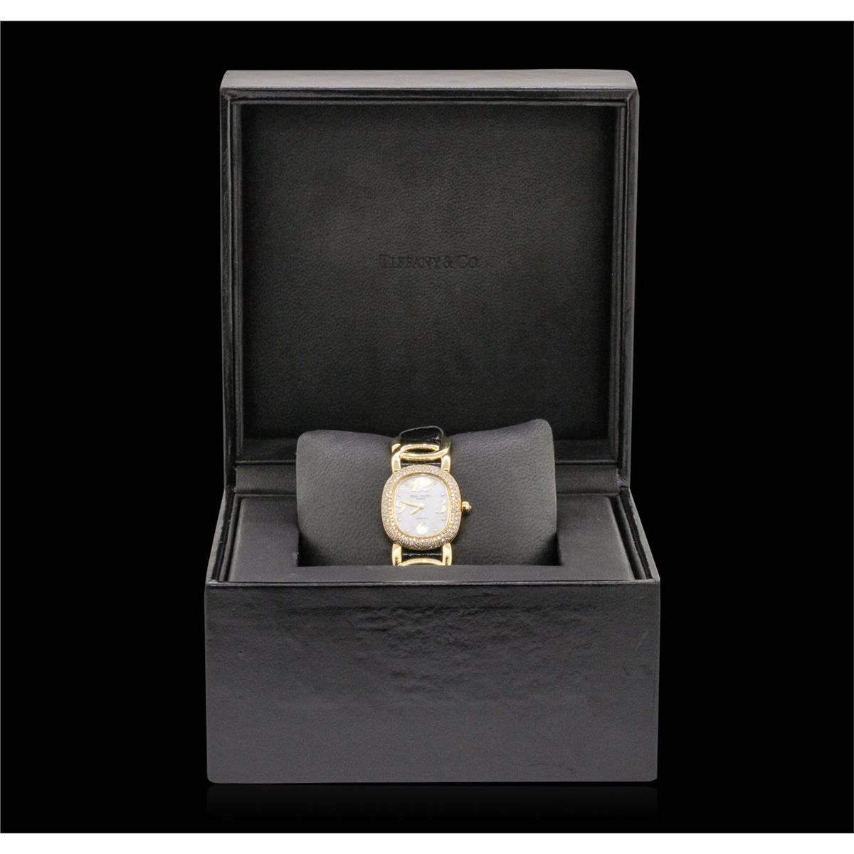 One ladies, Patek Philippe Golden Ellipse wristwatch electronically tested 18KT yellow gold, Elliptical Case: 24 x 23mm, Case Back: secured with four set screws, Case Lugs: hinged and intertwined, Bezel: diamond set, Crystal: synthetic sapphire. Movement: quartz, Dial: signed Tiffany & Co, and Patek Philippe, mother of pearl, golden hands, with indices and numerals, Patek Philippe Bracelet: leather strap, Condition: G-5 Fine. Seven inch length, adjustable, with the Patek Philippe 18KT yellow gold clasp. Containing: Approximately One Hundred Sixty single cut diamonds, approximate total weight equals 1.00ct. Set & graded in the bezel. Clarity VVS-2 Average. Color: E - F. Total Weight of Diamonds 1.00ct. Total Weight of Watch 40.87 grams. AIG Appraised at $25,000.00.