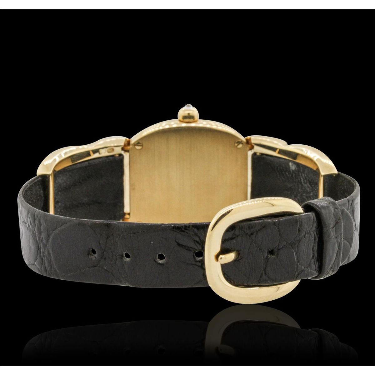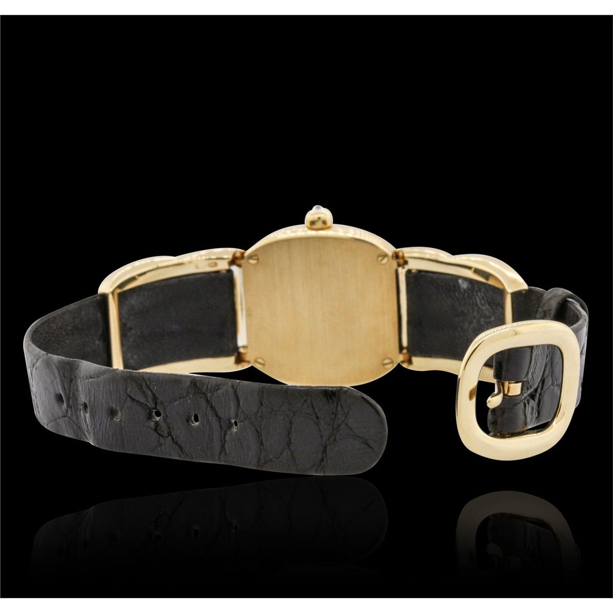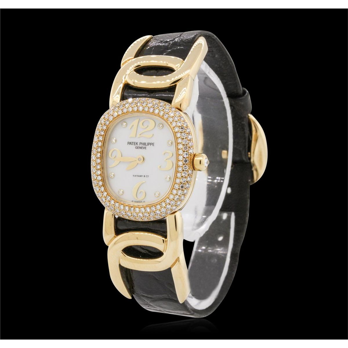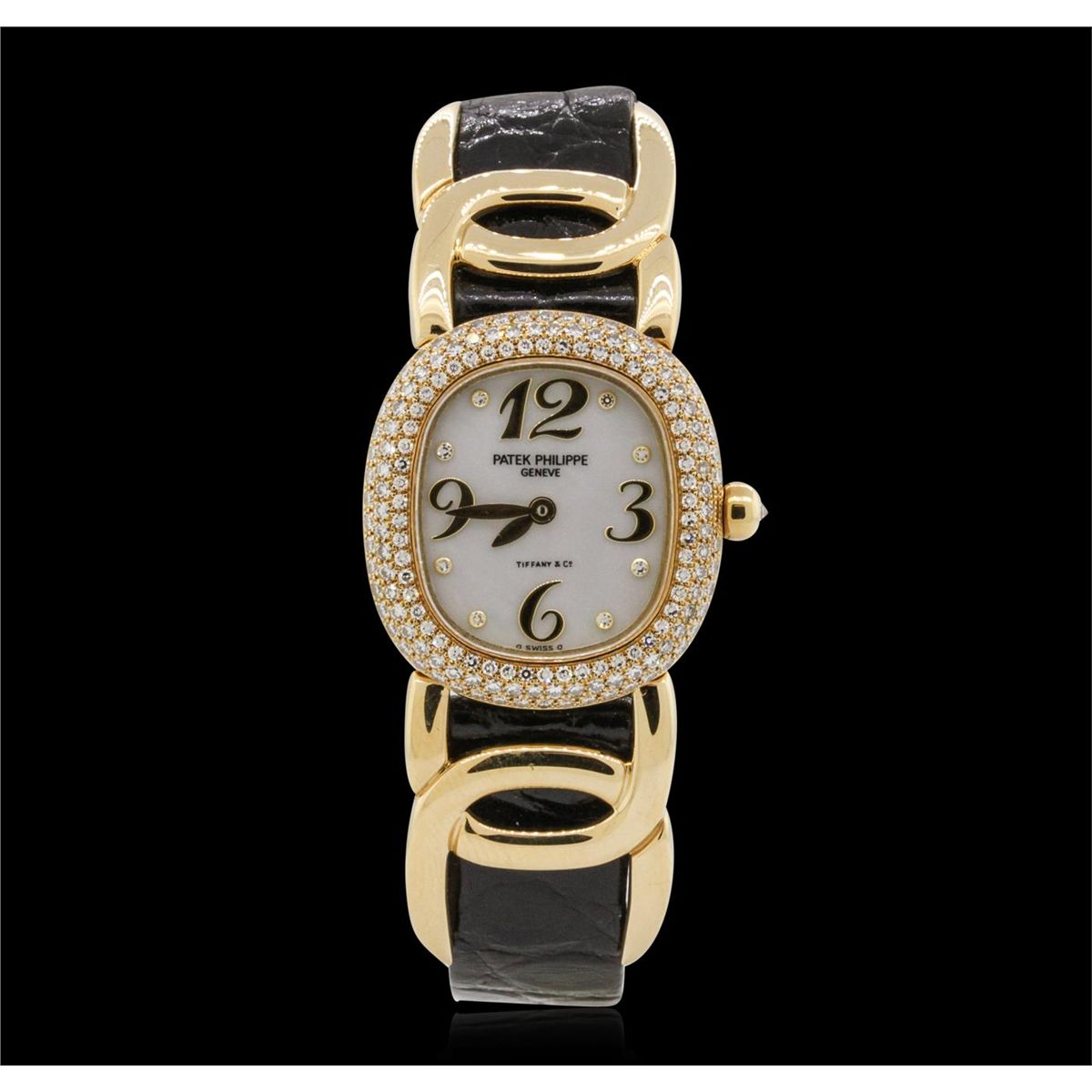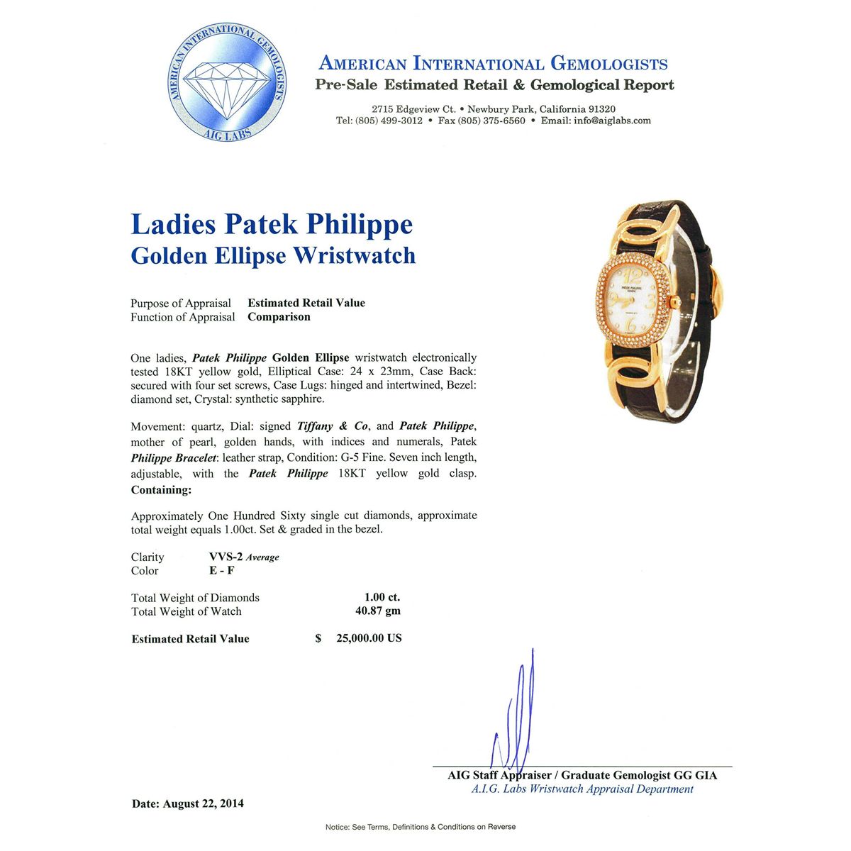 One ladies, Patek Philippe Golden Ellipse wristwatch electronically tested 18KT yellow gold, Elliptical Case: 24 x 23mm, Case Back: secured with four set screws, Case Lugs: hinged and intertwined, Bezel: diamond set, Crystal: synthetic sapphire. Movement: quartz, Dial: signed Tiffany & Co, and Patek Philippe, mother of pearl, golden hands, with indices and numerals, Patek Philippe Bracelet: leather strap, Condition: G-5 Fine. Seven inch length, adjustable, with the Patek Philippe 18KT yellow gold clasp. Containing: Approximately One Hundred Sixty single cut diamonds, approximate total weight equals 1.00ct. Set & graded in the bezel. Clarity VVS-2 Average. Color: E - F. Total Weight of Diamonds 1.00ct. Total Weight of Watch 40.87 grams. AIG Appraised at $25,000.00.