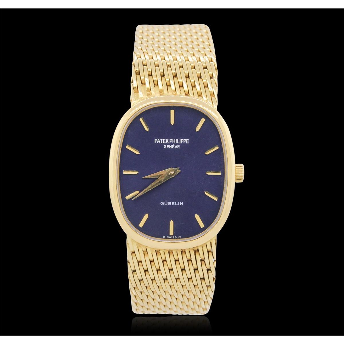 One ladies Patek Philippe Ellipse wristwatch featuring: Swiss Mechanical Movement, 18KT Yellow Gold Bracelet with jeweler's clasp, Bezel, Case, Crown, and Lugs. Dark blue dial with analog display, "Gübelin" at 6 o'clock position, gold tone hour markers and hour and minute hands. Includes box. Case measures 25mm including crown.