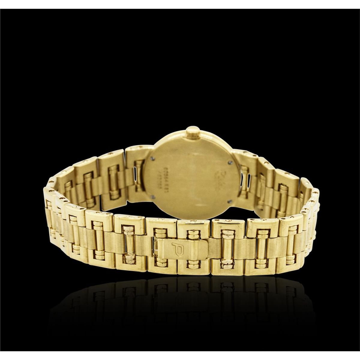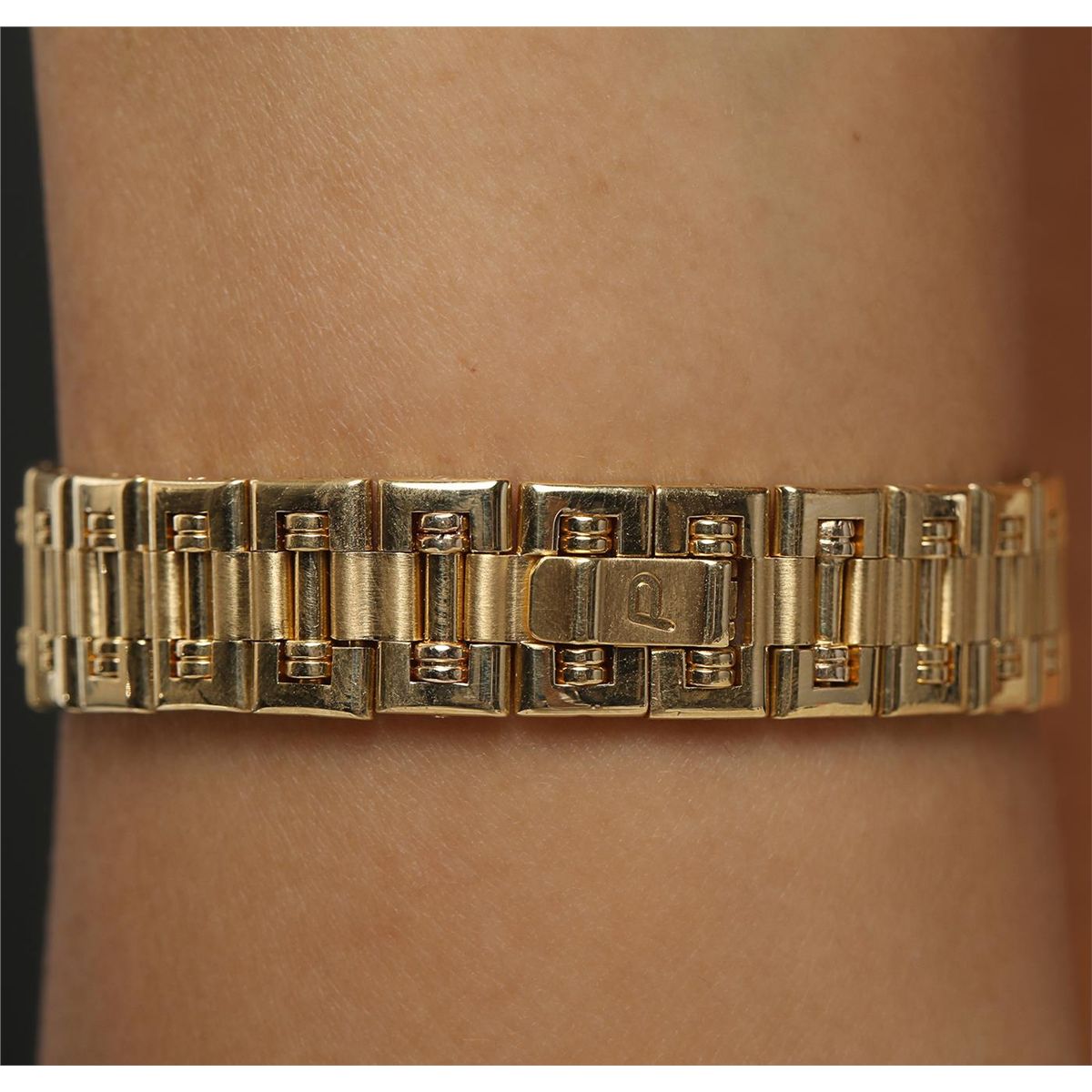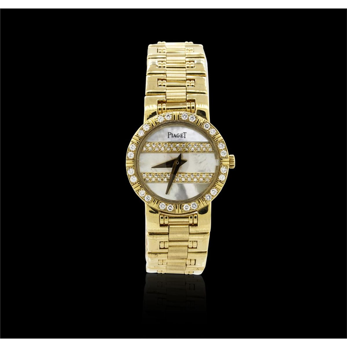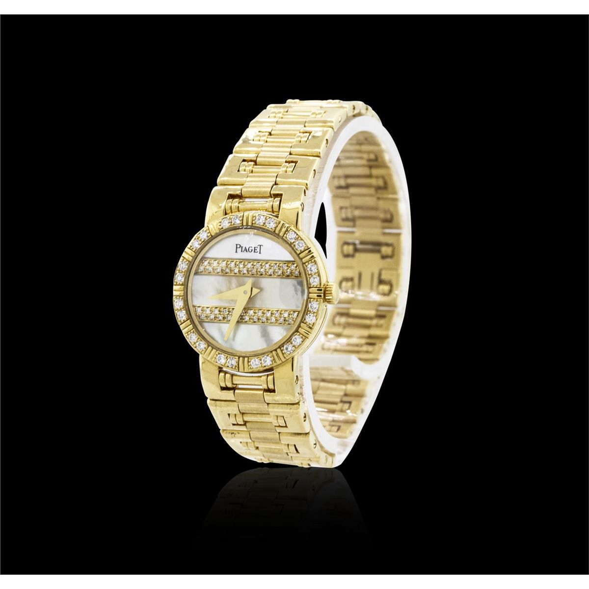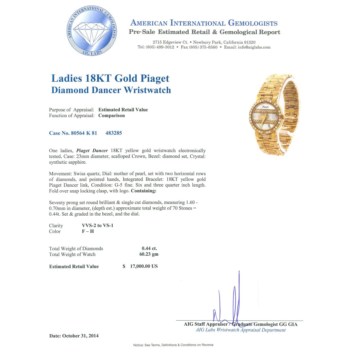 One ladies, Piaget Dancer 18KT yellow gold wristwatch electronically tested, Case: 23mm diameter, scalloped Crown, Bezel: diamond set, Crystal: synthetic sapphire. Movement: Swiss quartz, Dial: mother of pearl, set with two horizontal rows of diamonds, and pointed hands, Integrated Bracelet: 18KT yellow gold Piaget Dancer link, Condition: G-5 fine. Six and three quarter inch length. Fold over snap locking clasp, with logo. Containing: Seventy prong set round brilliant & single cut diamonds, measuring 1.60 - 0.70mm in diameter, (depth est.) approximate total weight of 70 Stones = 0.44t. Set & graded in the bezel, and the dial. Clarity: VVS-2 to VS-1. Color: F - H. Total Weight of Diamonds 0.44ct. Total Weight of Watch 60.23 grams. AIG Appraised at $17,000.00.
