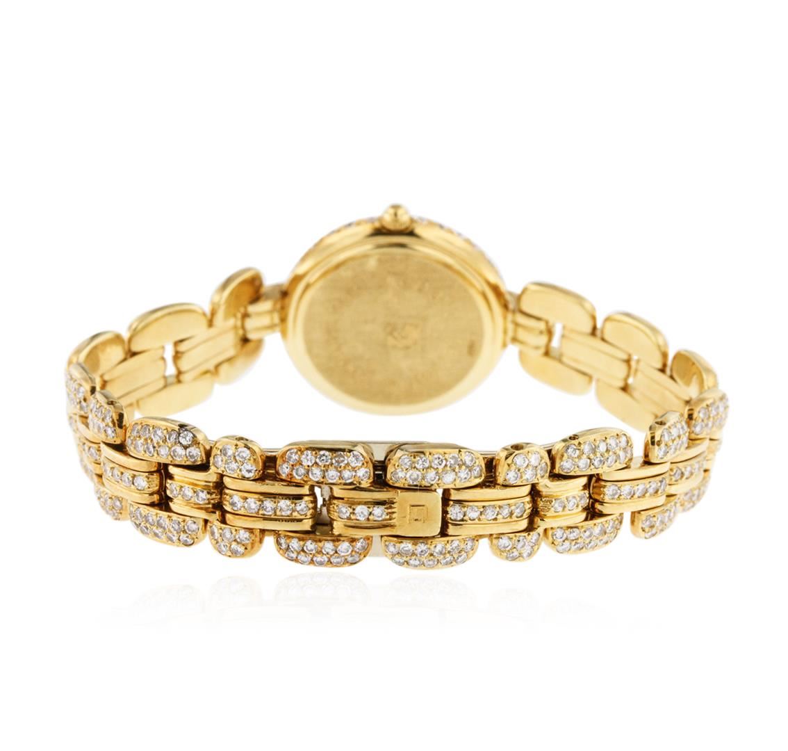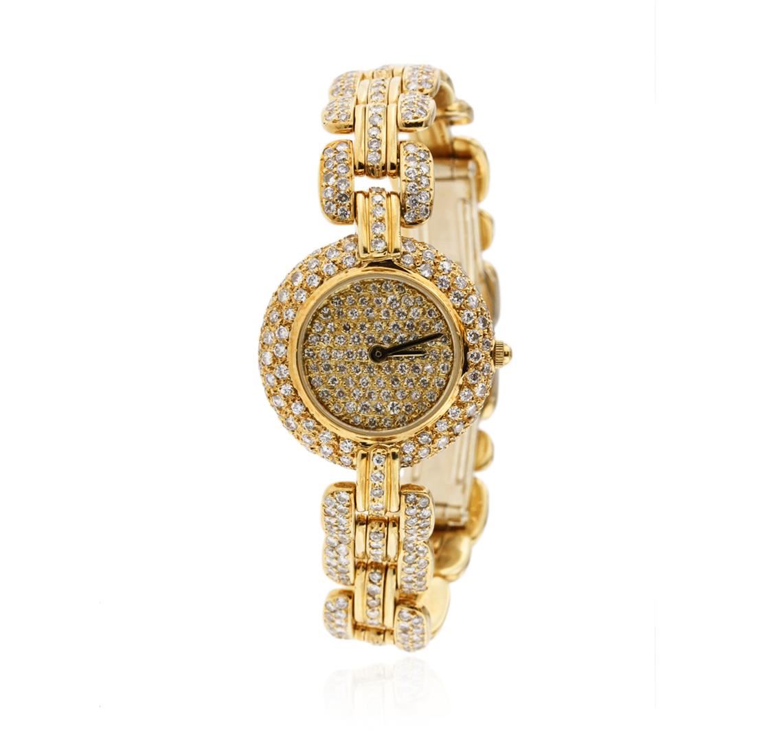 One ladies, Renato Ferraris wristwatch electronically tested 18KT yellow gold, Case, 24mm diameter, Case Back: engraved with the manufacturers name and logo, Bezel: diamond set, Crystal: synthetic sapphire, Movement: quartz. Dial: pave, set diamonds, Bracelet: 18KT yellow gold, flexible links, twelve millimeter width, set throughout with diamonds, Condition: G-5 Fine. Six and one half inch length. Concealed deployment clasp. Containing: Approximately Five Hundred Twenty Five pave, set round brilliant cut diamonds, approximate total weight = 4.00ct. Graded in the setting. Clarity: VS-1 to SI-2. Color: F - H. Total Weight of Diamonds 4.00ct. Total Weight of Watch 66.89 grams. AIG Appraised at $17,880.00.