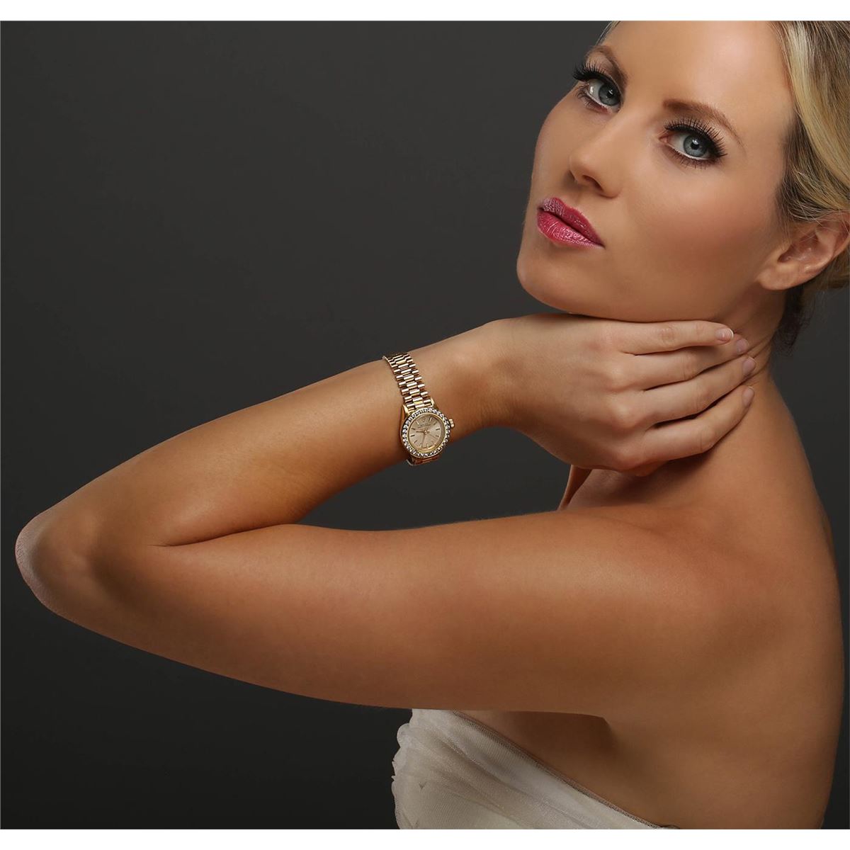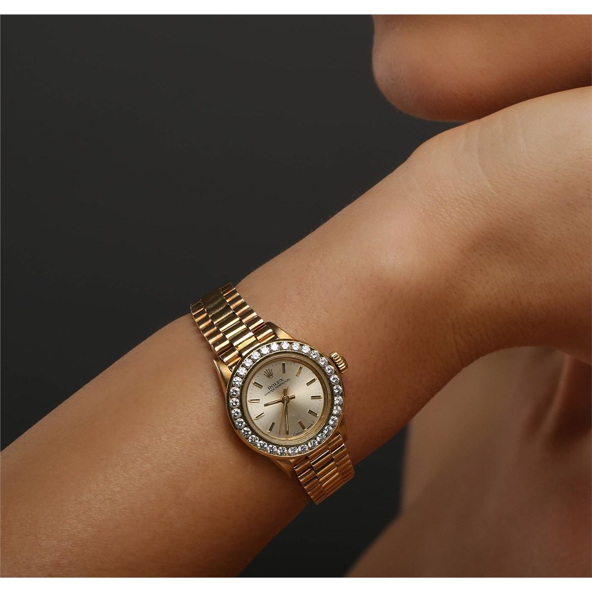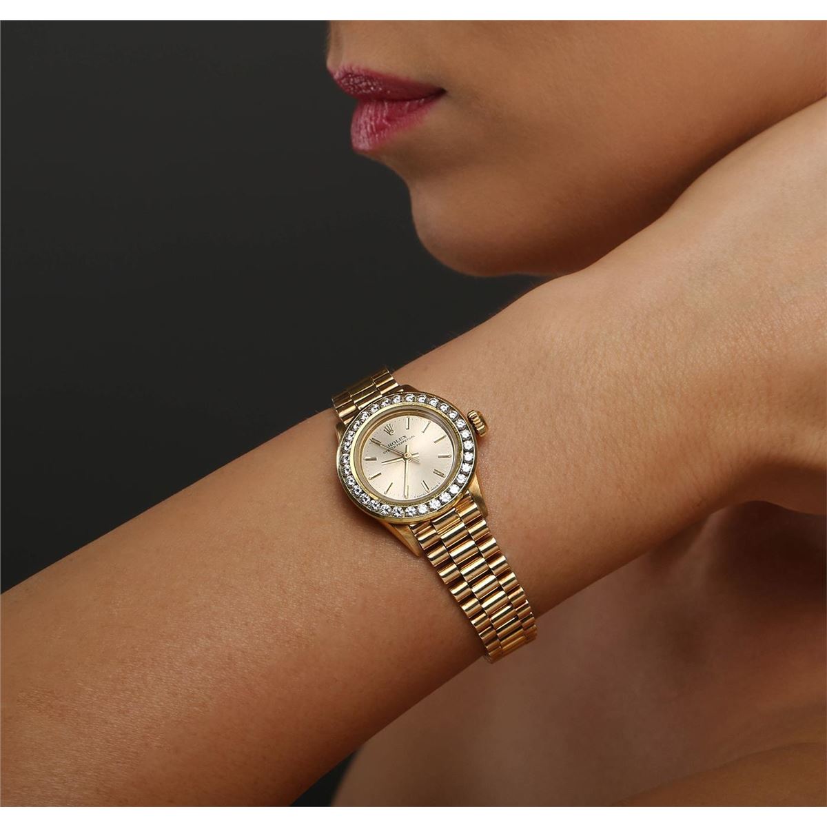 One ladies, hand crafted & machine milled Rolex Oyster Perpetual, model wristwatch electronically tested, Circa: 1986, 14KT yellow gold Case: 25mm oyster, Crown: twinlock with logo, Custom Bezel: diamond set, Custom Crystal: synthetic sapphire lens.Movement: stem wind mechanical, Dial: Light Champagne, with baton hands & indices, Bracelet: 14KT yellow gold jubilee, Condition: G-4 Average. Bright polish & satin finish. Six and one half inch length, adjustable. Concealed 18KT yellow gold deployment clasp, with logo. Containing:Thirty Two single cut diamonds, measuring an average of 2.30mm in diameter, approximate total weight = 1.45ct. Set & graded in the bezel. Clarity VS-2 to SI-2. Color: G - H. Total Weight of Diamonds 1.45ct. Total Weight of Watch 58.93gm. AIG Appraised at $16,300.00.