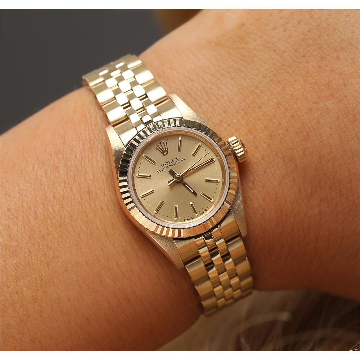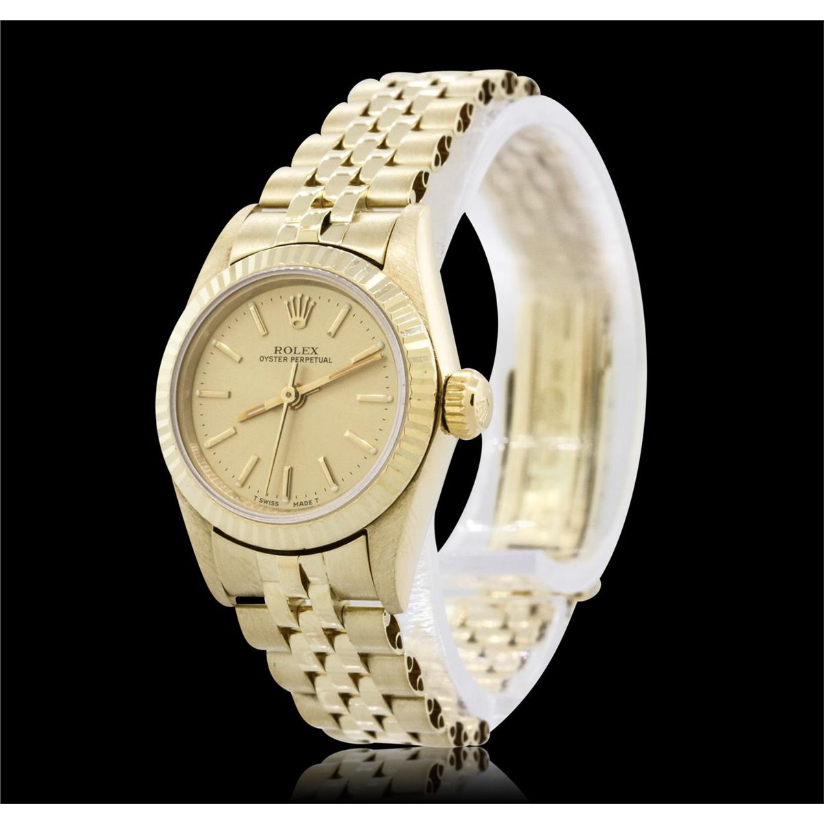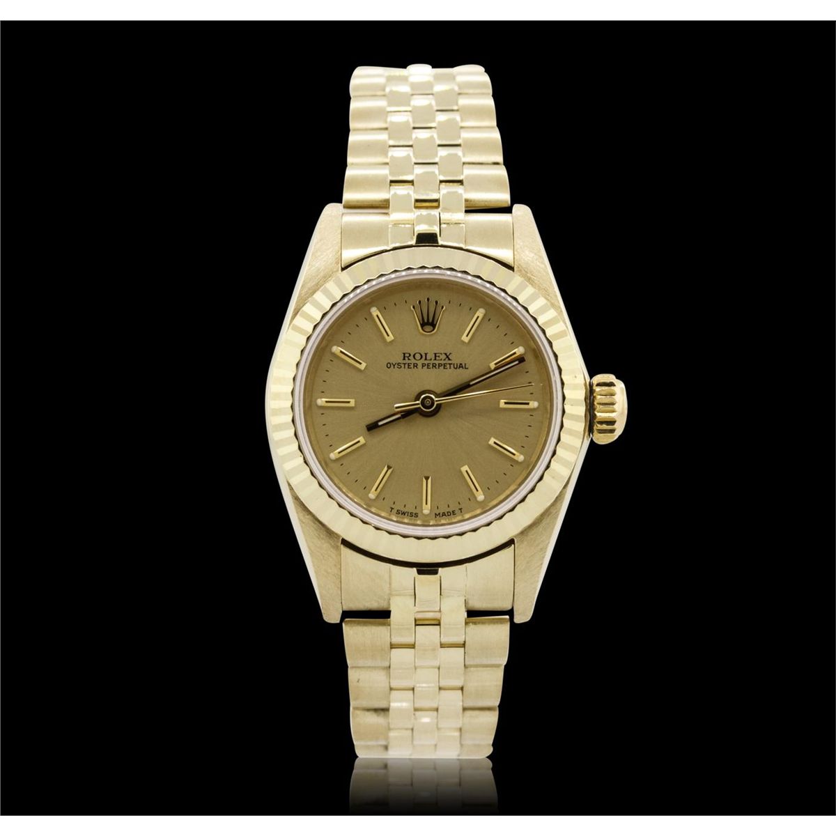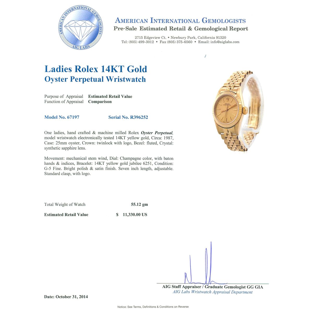 One ladies, hand crafted & machine milled Rolex Oyster Perpetual, model wristwatch electronically tested 14KT yellow gold, Circa: 1987, Case: 25mm oyster, Crown: twinlock with logo, Bezel: fluted, Crystal: synthetic sapphire lens. Movement: mechanical stem wind, Dial: Champagne color, with baton hands & indices, Bracelet: 14KT yellow gold jubilee 6251, Condition: G-5 Fine. Bright polish & satin finish. Seven inch length, adjustable. Standard clasp, with logo. Total Weight of Watch 55.12 grams. AIG Appraised at $11,330.00.