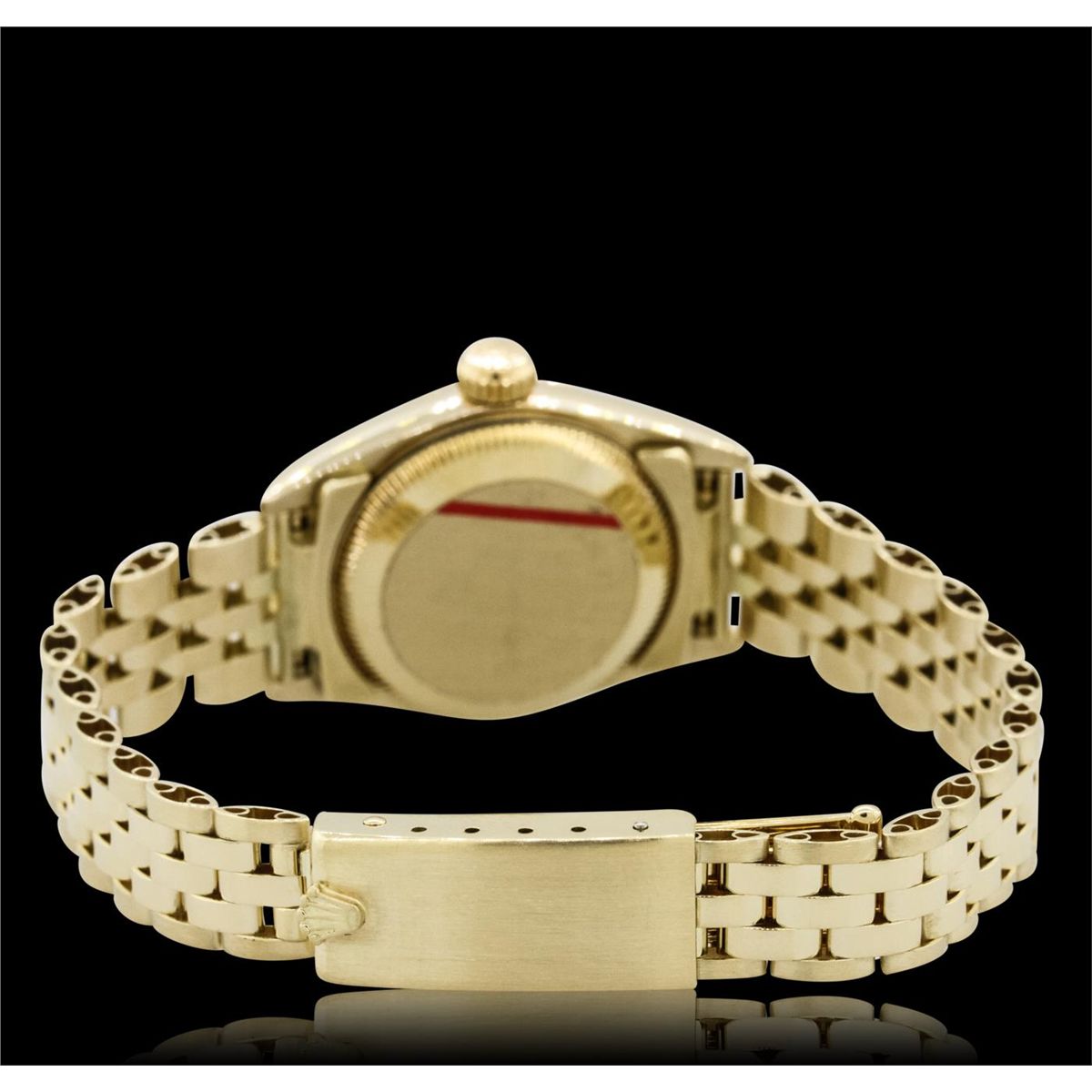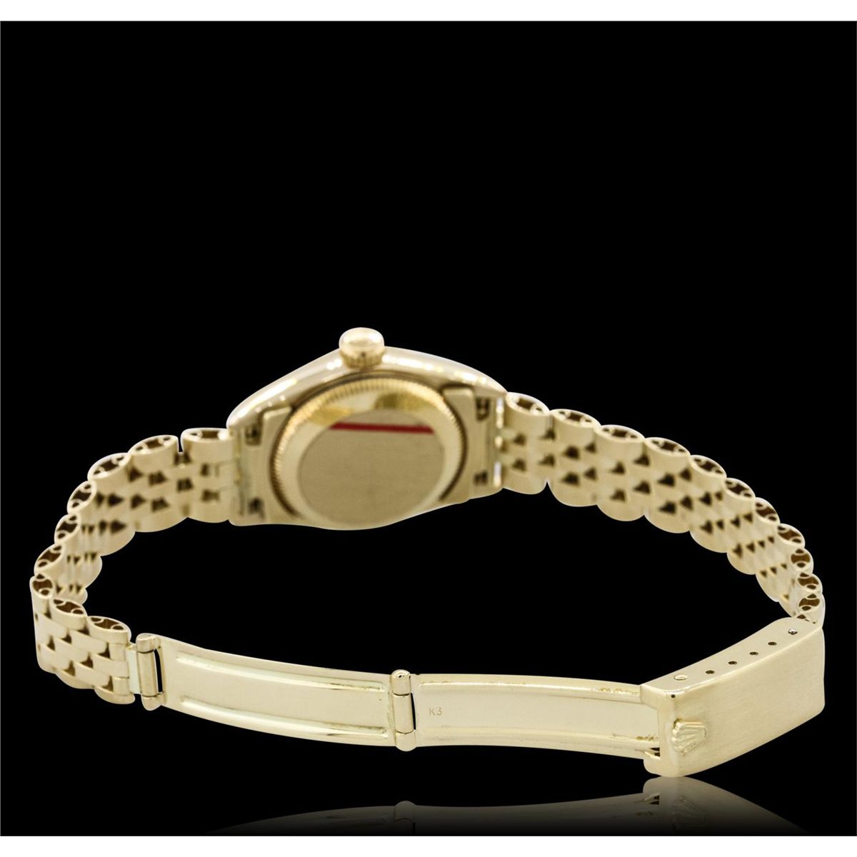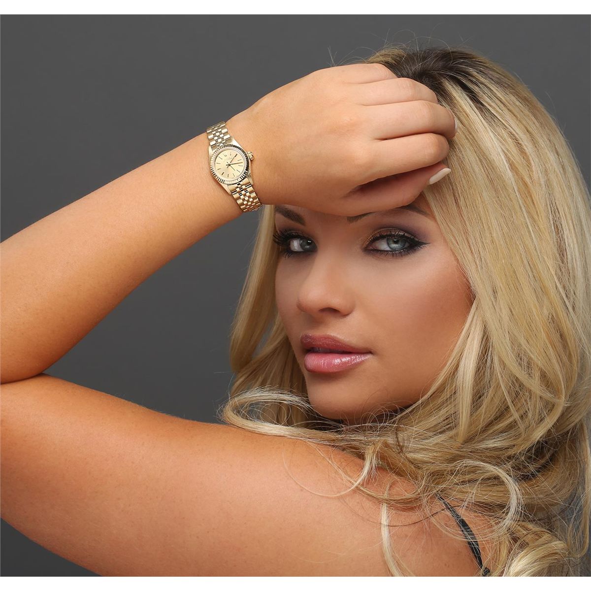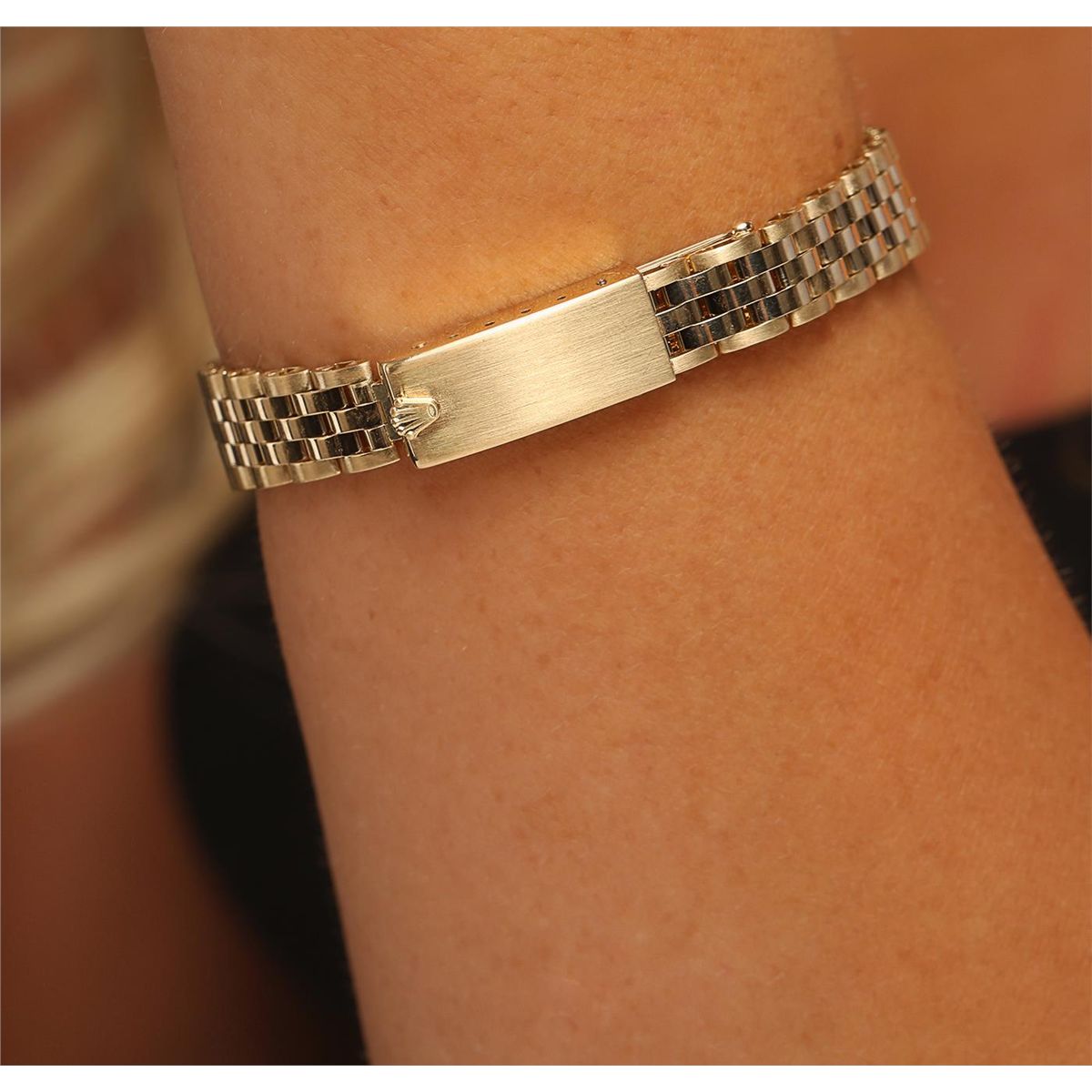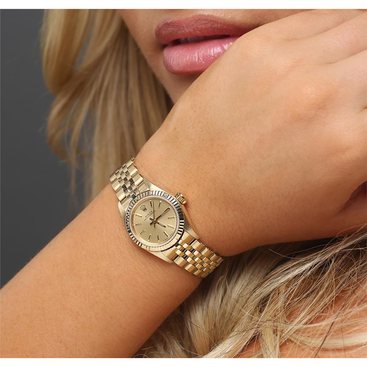 One ladies, hand crafted & machine milled Rolex Oyster Perpetual, model wristwatch electronically tested 14KT yellow gold, Circa: 1987, Case: 25mm oyster, Crown: twinlock with logo, Bezel: fluted, Crystal: synthetic sapphire lens. Movement: mechanical stem wind, Dial: Champagne color, with baton hands & indices, Bracelet: 14KT yellow gold jubilee 6251, Condition: G-5 Fine. Bright polish & satin finish. Seven inch length, adjustable. Standard clasp, with logo. Total Weight of Watch 55.12 grams. AIG Appraised at $11,330.00.