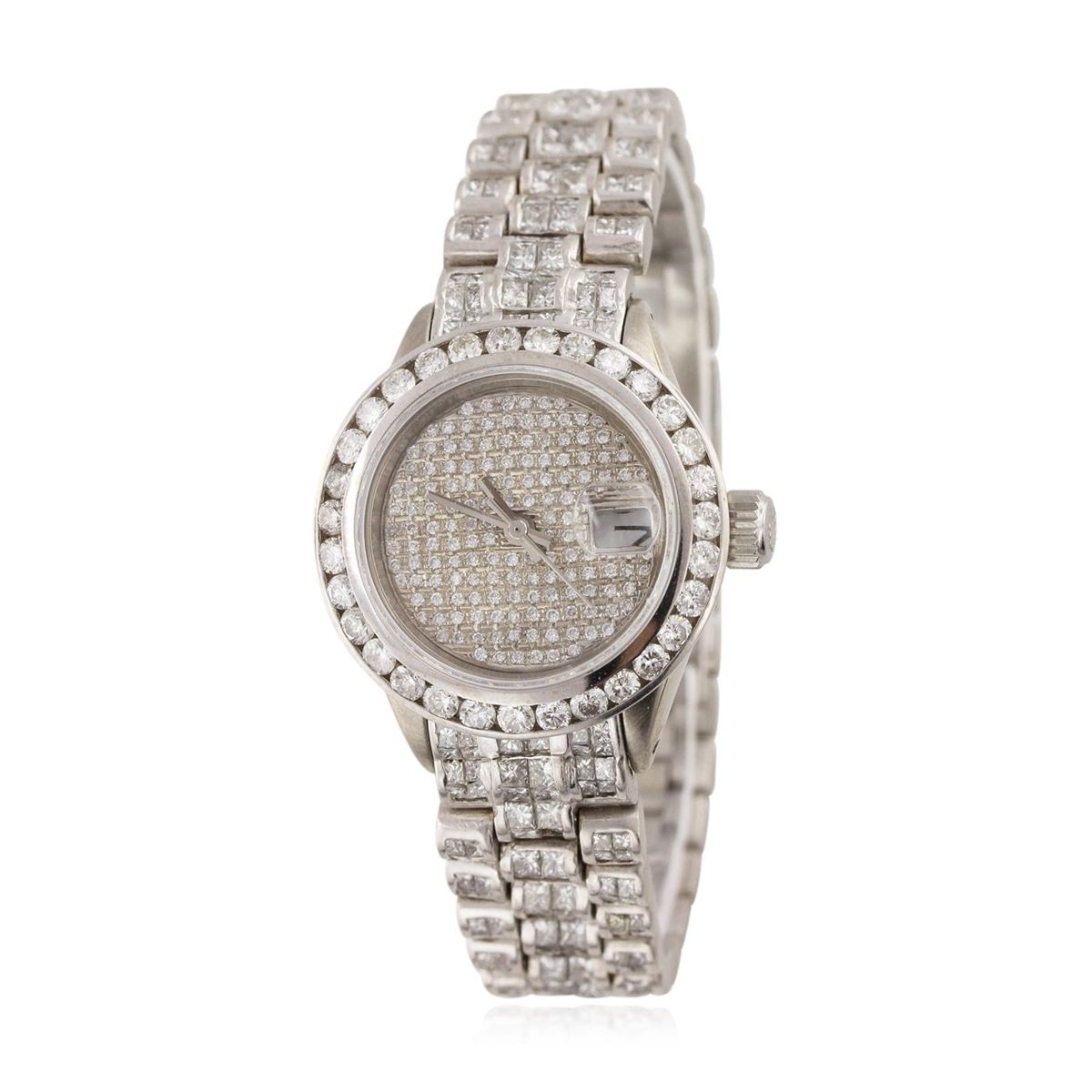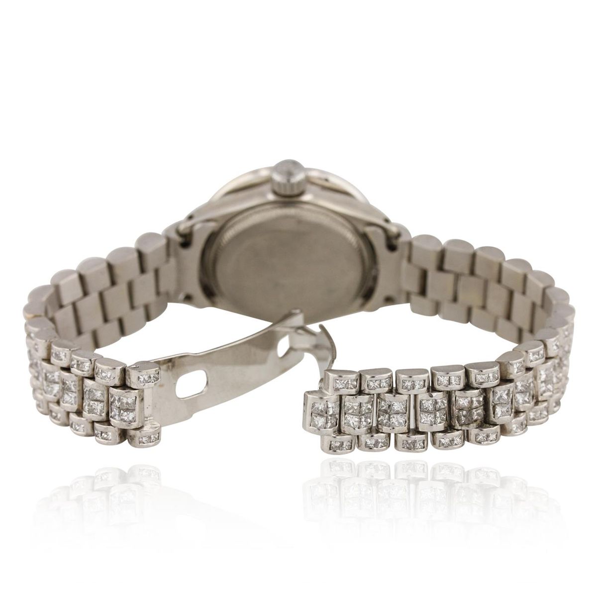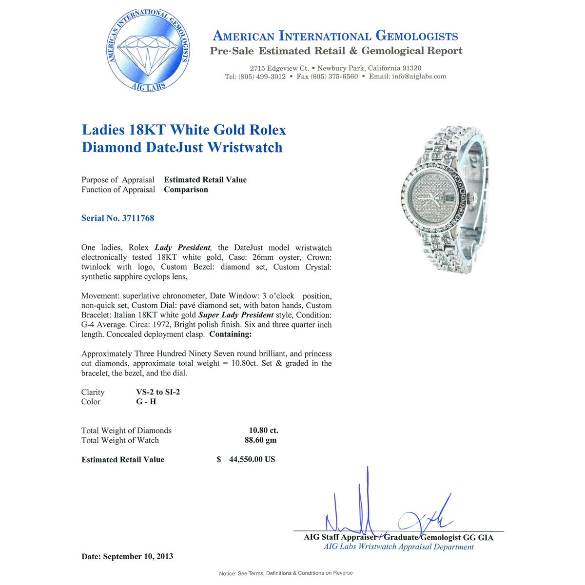 One ladies, Rolex Lady President, the DateJust model wristwatch electronically tested 18KT white gold, Case: 26mm oyster, Crown: twin lock with logo, Custom Bezel: diamond set, Custom Crystal: synthetic sapphire cyclops lens, Movement: superlative chronometer, Date Window: 3 o'clock position, non-quick set, Custom Dial: pave diamond set, with baton hands, Custom Bracelet: Italian 18KT white gold Super Lady President style, Condition: G-4 Average. Circa: 1972, Bright polish finish. Six and three quarter inch length. Concealed deployment clasp. Containing: Approximately Three Hundred Ninety Seven round brilliant, and princess cut diamonds, approximate total weight = 10.80ct. Set & graded in the bracelet, the bezel, and the dial. Clarity VS-2 to SI-2. Color G - H. Total Weight of Diamonds 10.80ct. Total Weight of Watch 88.60gm. Comes with Box! AIG Appraised at $44,550.00.