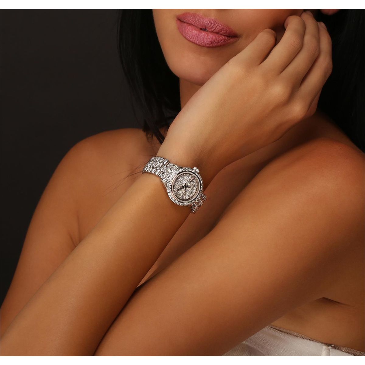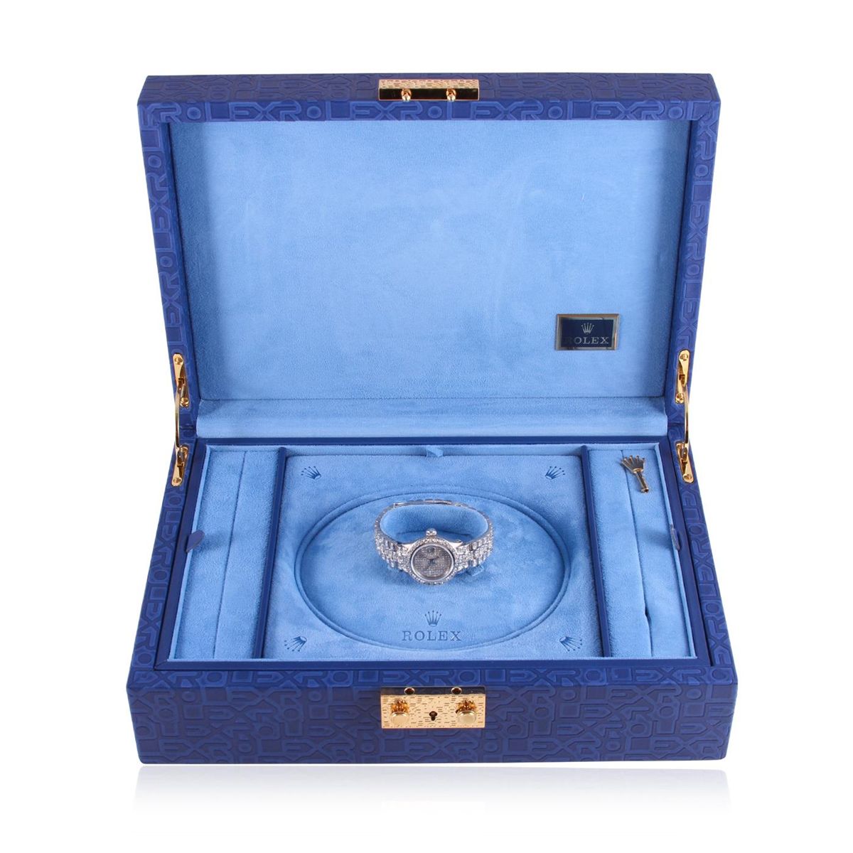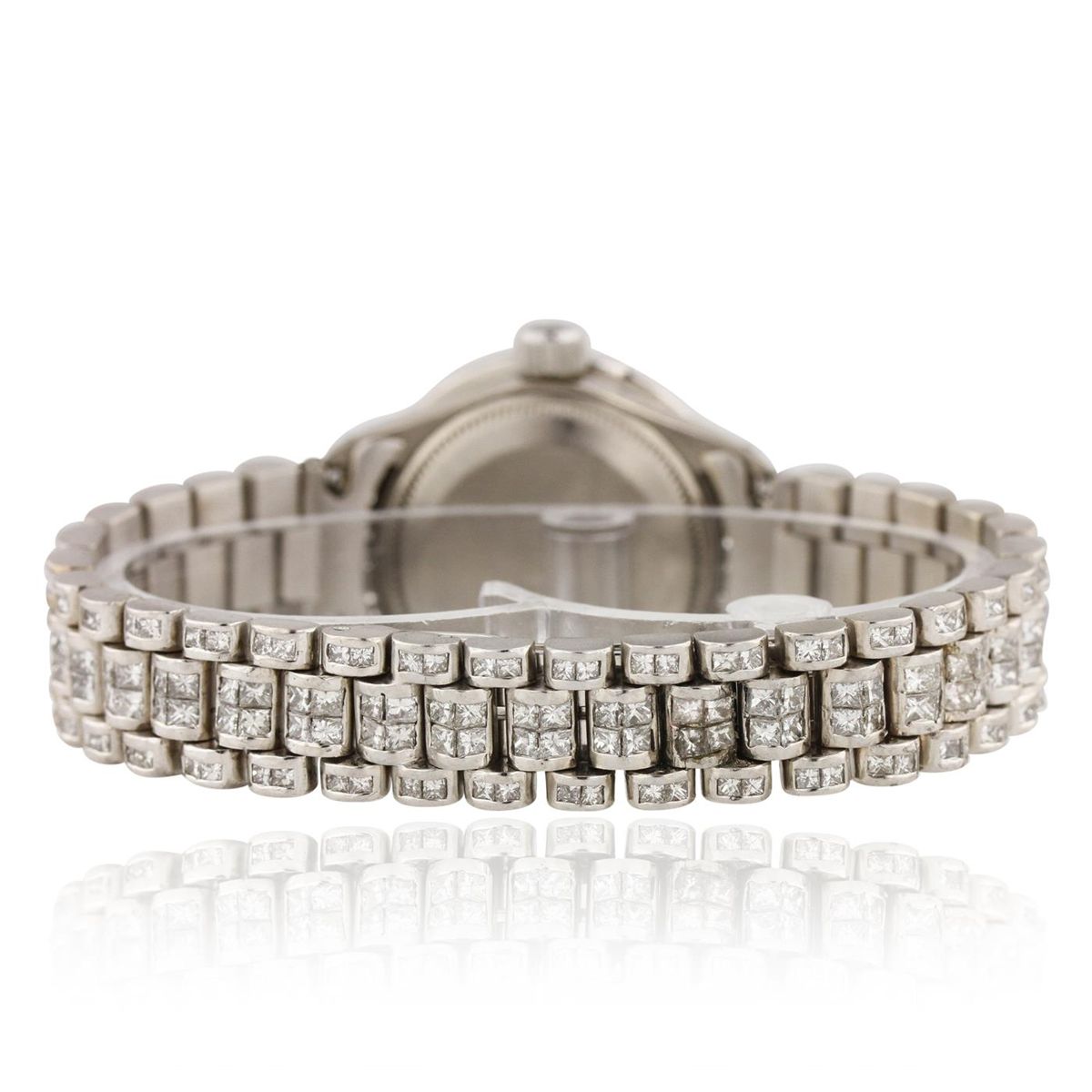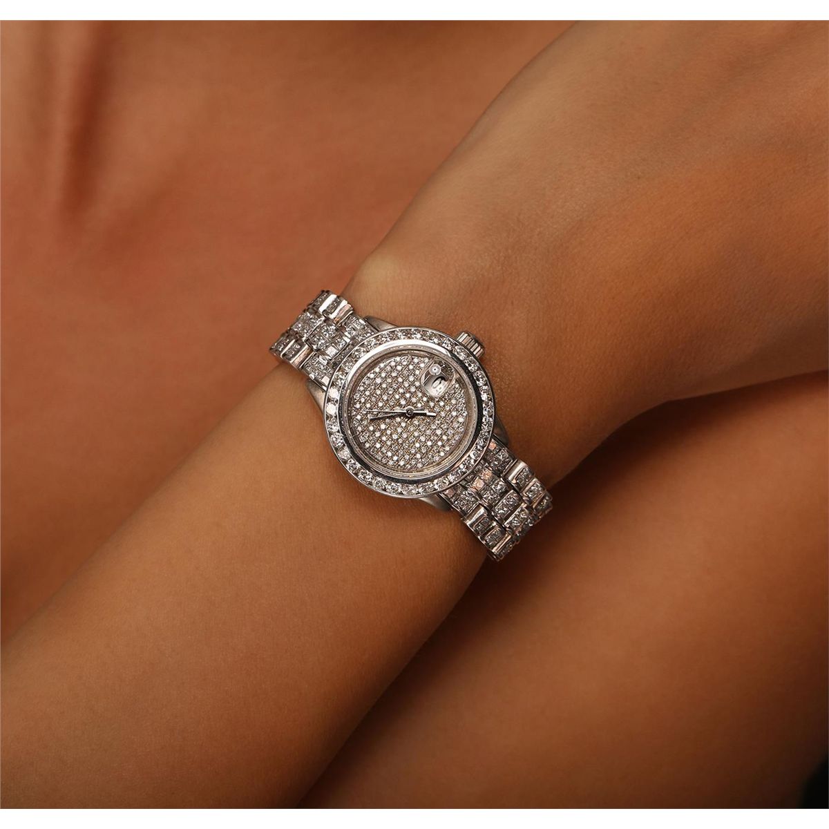One ladies, Rolex Lady President, the DateJust model wristwatch electronically tested 18KT white gold, Case: 26mm oyster, Crown: twin lock with logo, Custom Bezel: diamond set, Custom Crystal: synthetic sapphire cyclops lens, Movement: superlative chronometer, Date Window: 3 o'clock position, non-quick set, Custom Dial: pave diamond set, with baton hands, Custom Bracelet: Italian 18KT white gold Super Lady President style, Condition: G-4 Average. Circa: 1972, Bright polish finish. Six and three quarter inch length. Concealed deployment clasp. Containing: Approximately Three Hundred Ninety Seven round brilliant, and princess cut diamonds, approximate total weight = 10.80ct. Set & graded in the bracelet, the bezel, and the dial. Clarity VS-2 to SI-2. Color G - H. Total Weight of Diamonds 10.80ct. Total Weight of Watch 88.60gm. Comes with Box! AIG Appraised at $44,550.00.