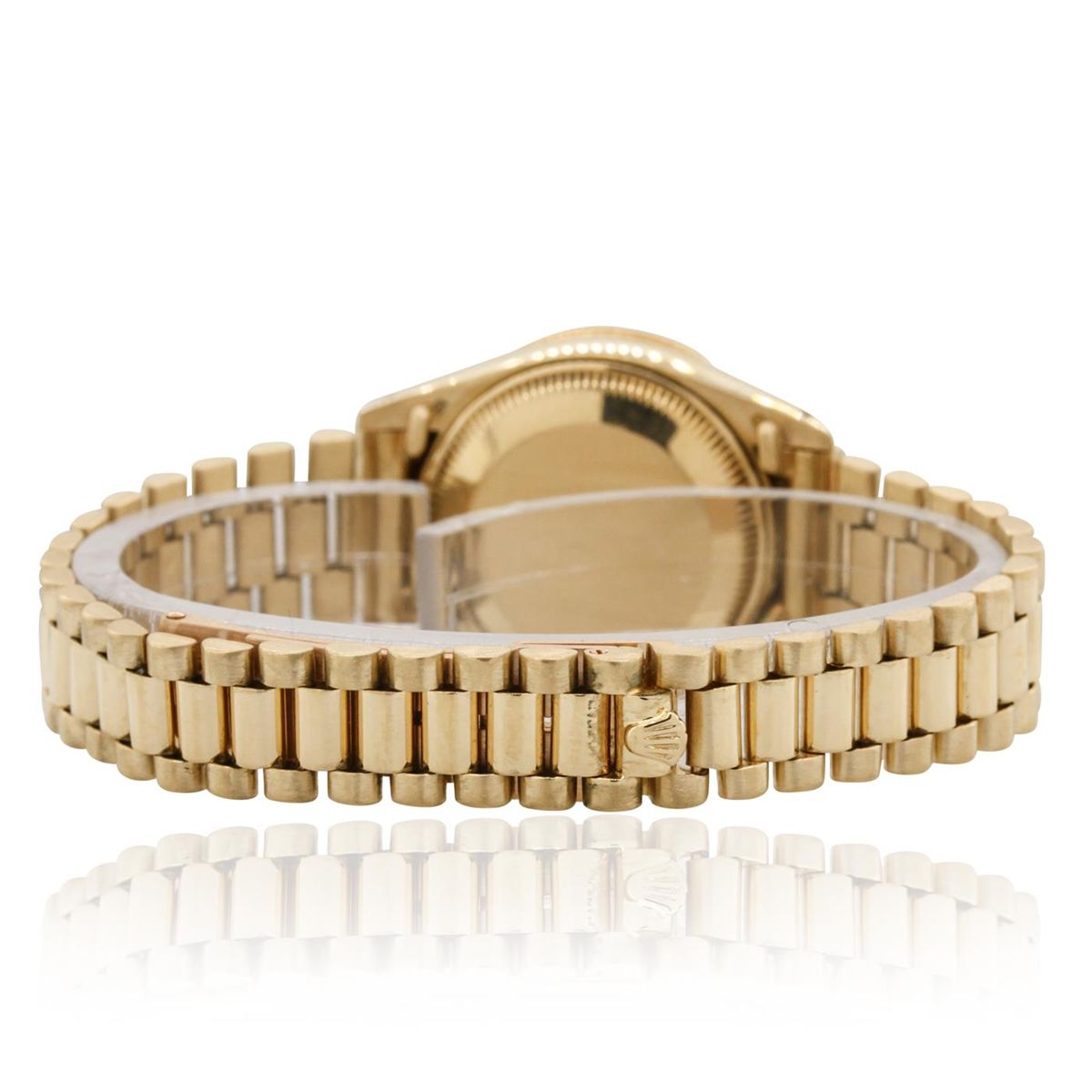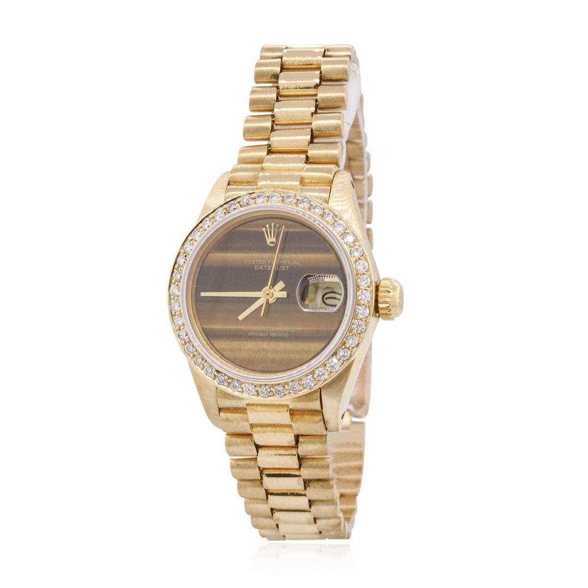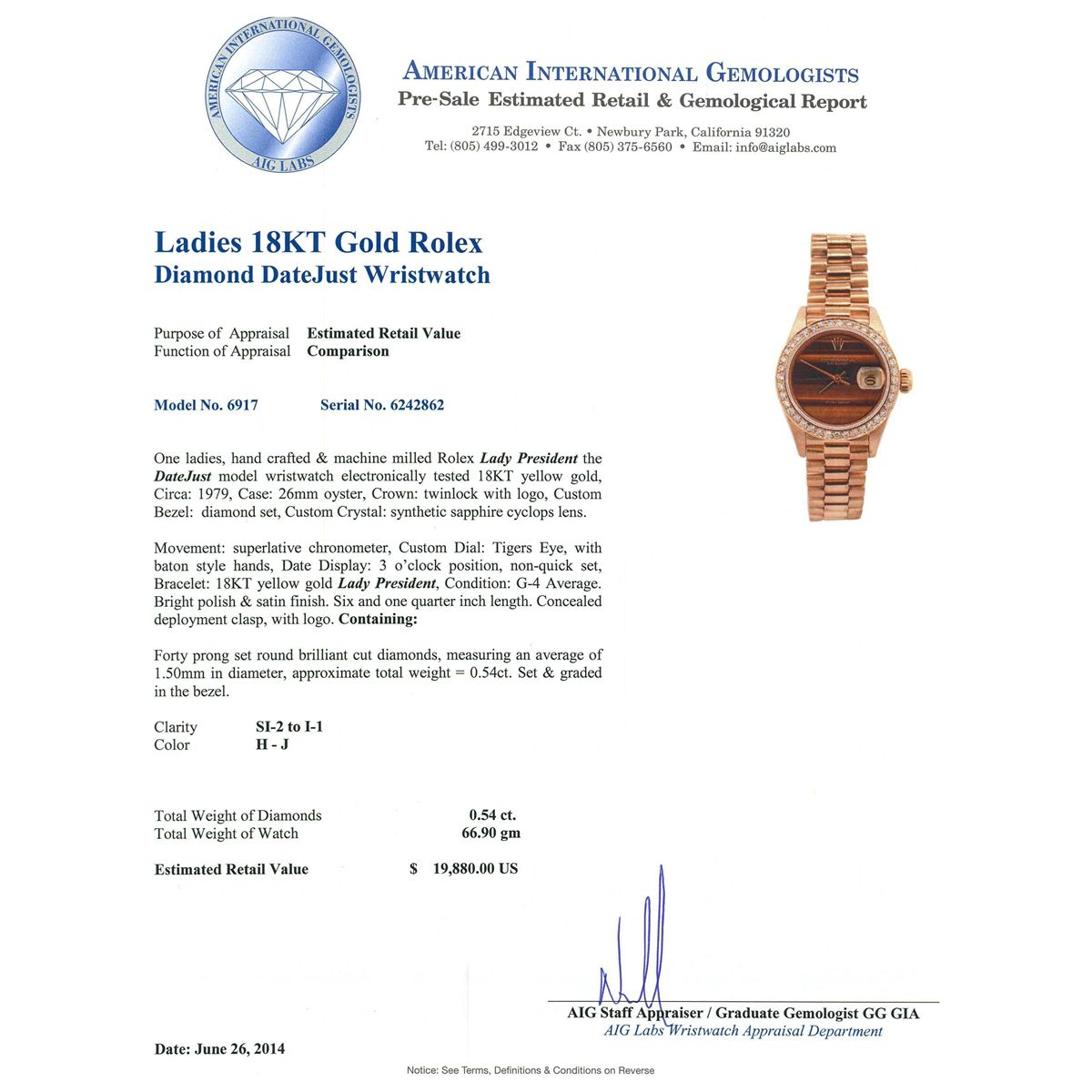 One ladies, hand crafted & machine milled Rolex Lady President the DateJust model wristwatch electronically tested 18KT yellow gold, Circa: 1979, Case: 26mm oyster, Crown: twinlock with logo, Custom Bezel: diamond set, Custom Crystal: synthetic sapphire cyclops lens. Movement: superlative chronometer, Custom Dial: Tigers Eye, with baton style hands, Date Display: 3 o'clock position, non-quick set, Bracelet: 18KT yellow gold Lady President, Condition: G-4 Average. Bright polish & satin finish. Six and one quarter inch length. Concealed deployment clasp, with logo. Containing: Forty prong set round brilliant cut diamonds, measuring an average of 1.50mm in diameter, approximate total weight = 0.54ct. Set & graded in the bezel. Clarity SI-2 to I-1. Color: H - J. Total Weight of Diamonds 0.54ct. Total Weight of Watch 66.90 grams. AIG Appraised at $19,880.00.