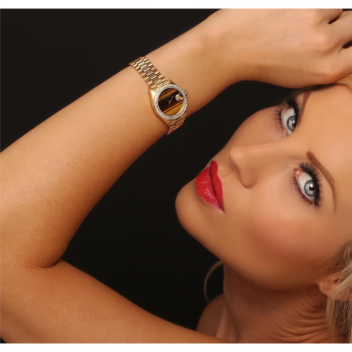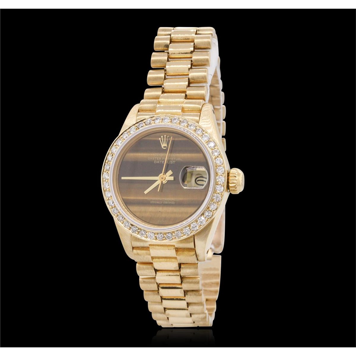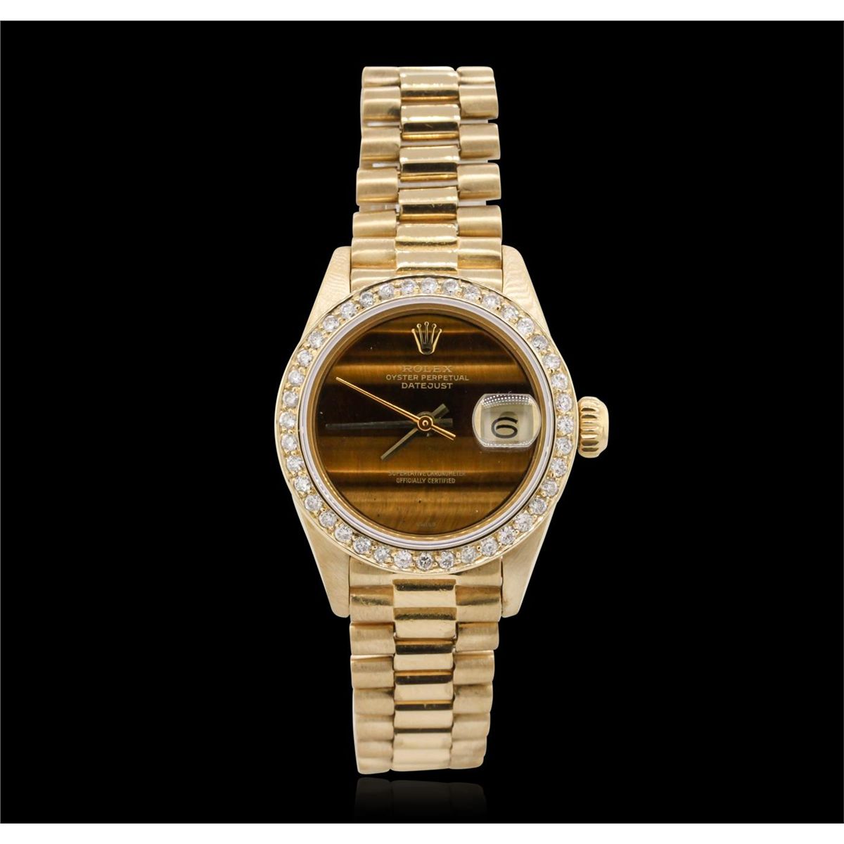 One ladies, hand crafted & machine milled Rolex Lady President the DateJust model wristwatch electronically tested 18KT yellow gold, Circa: 1979, Case: 26mm oyster, Crown: twinlock with logo, Custom Bezel: diamond set, Custom Crystal: synthetic sapphire cyclops lens. Movement: superlative chronometer, Custom Dial: Tigers Eye, with baton style hands, Date Display: 3 o'clock position, non-quick set, Bracelet: 18KT yellow gold Lady President, Condition: G-4 Average. Bright polish & satin finish. Six and one quarter inch length. Concealed deployment clasp, with logo. Containing: Forty prong set round brilliant cut diamonds, measuring an average of 1.50mm in diameter, approximate total weight = 0.54ct. Set & graded in the bezel. Clarity SI-2 to I-1. Color: H - J. Total Weight of Diamonds 0.54ct. Total Weight of Watch 66.90 grams. AIG Appraised at $19,880.00.