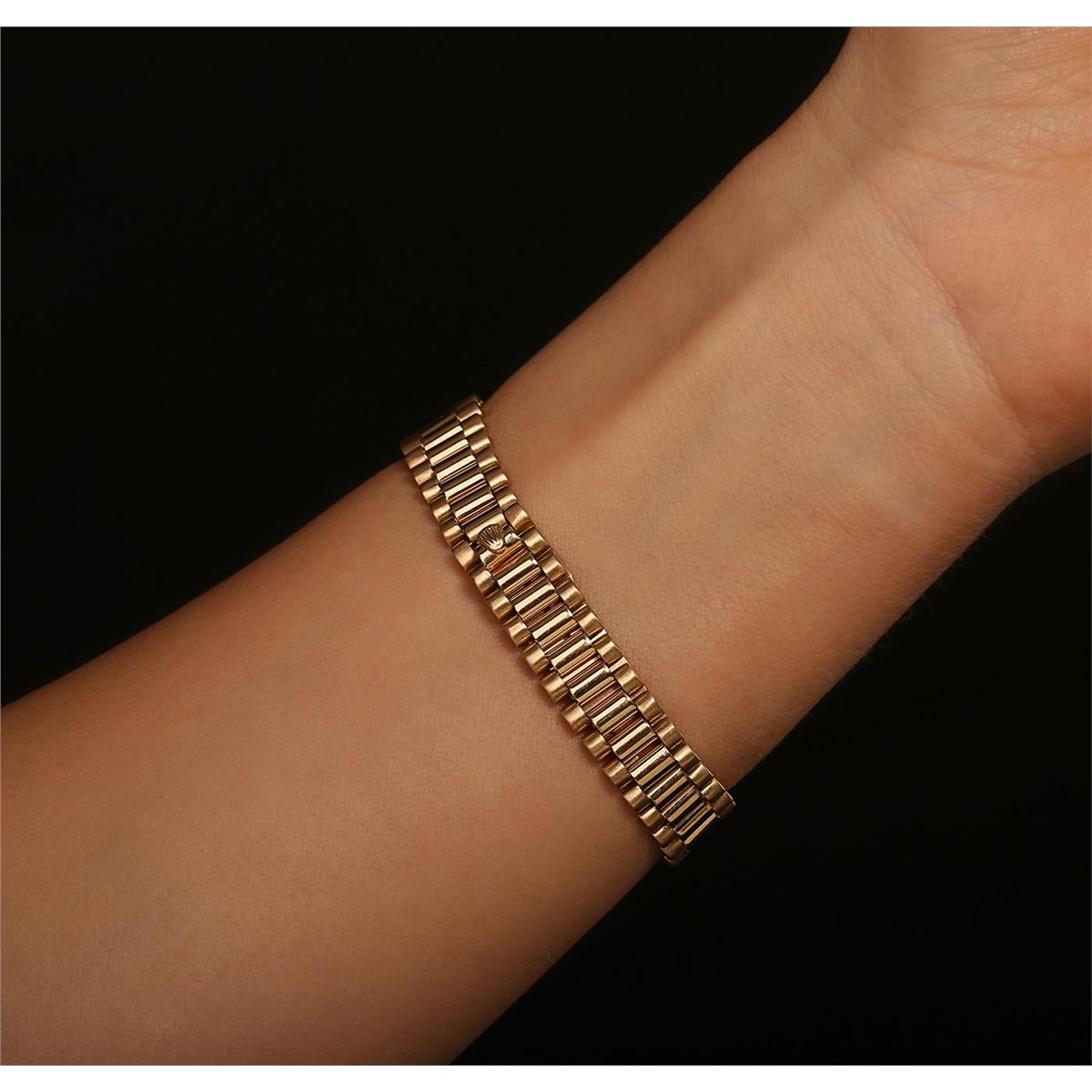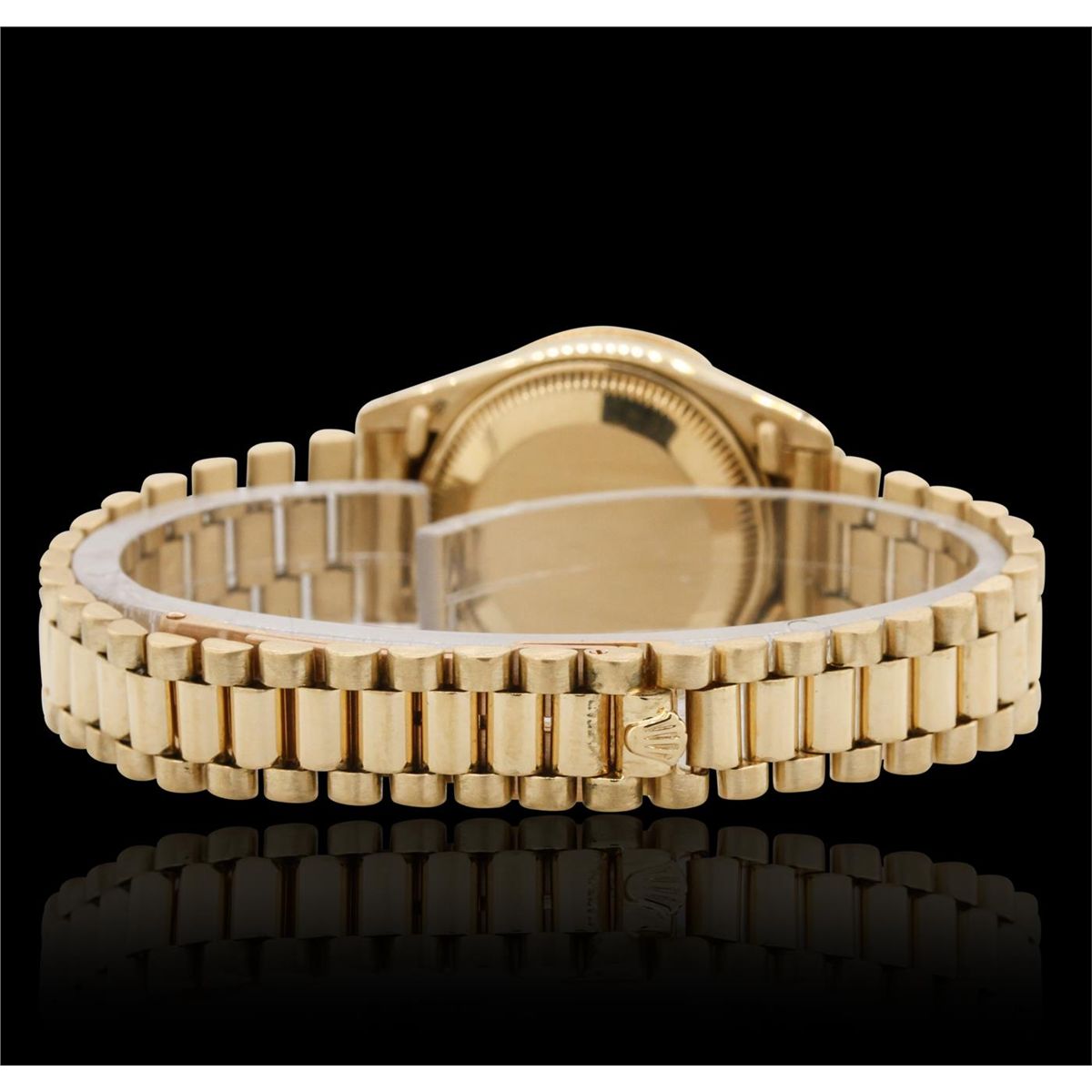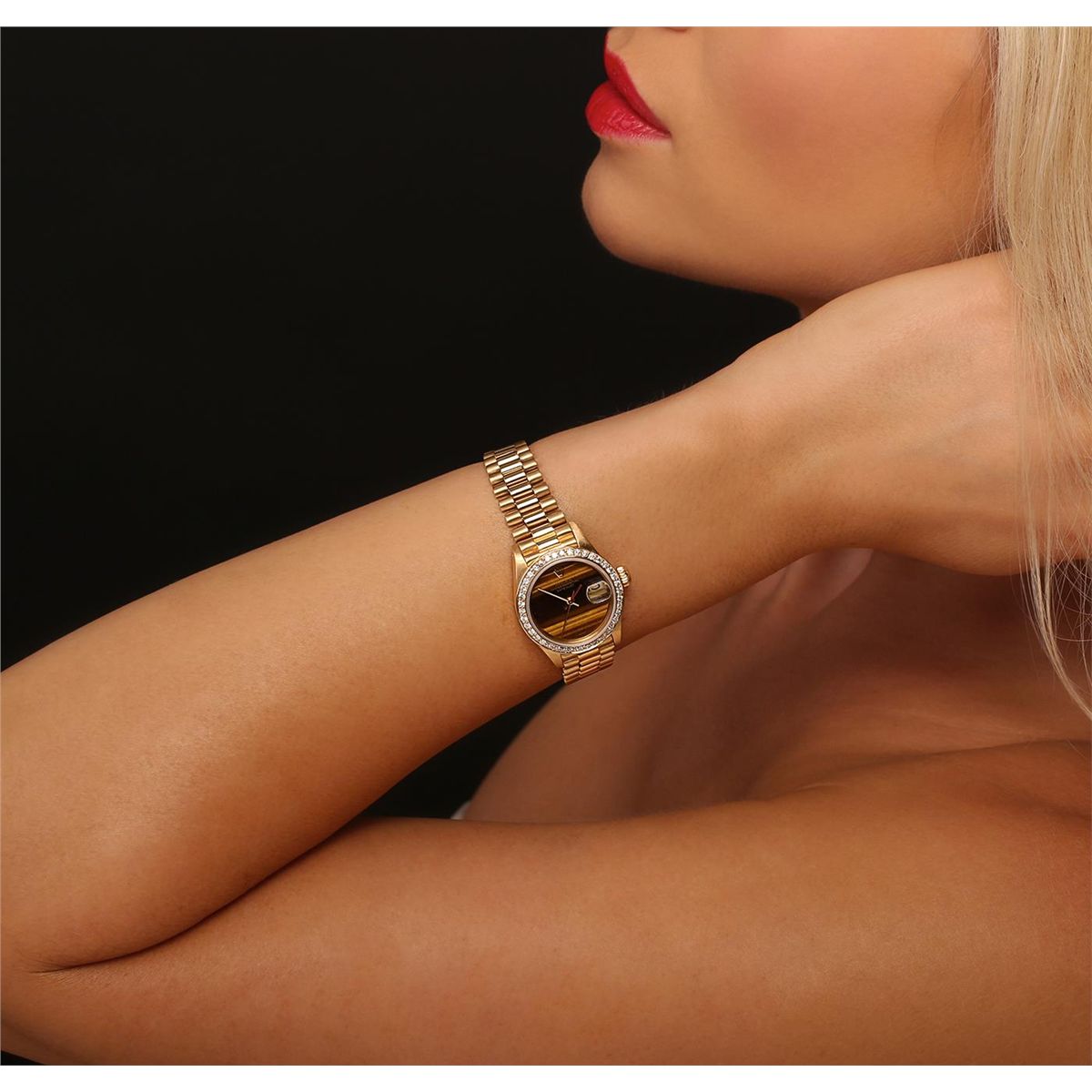 One ladies, hand crafted & machine milled Rolex Lady President the DateJust model wristwatch electronically tested 18KT yellow gold, Circa: 1979, Case: 26mm oyster, Crown: twinlock with logo, Custom Bezel: diamond set, Custom Crystal: synthetic sapphire cyclops lens. Movement: superlative chronometer, Custom Dial: Tigers Eye, with baton style hands, Date Display: 3 o'clock position, non-quick set, Bracelet: 18KT yellow gold Lady President, Condition: G-4 Average. Bright polish & satin finish. Six and one quarter inch length. Concealed deployment clasp, with logo. Containing: Forty prong set round brilliant cut diamonds, measuring an average of 1.50mm in diameter, approximate total weight = 0.54ct. Set & graded in the bezel. Clarity SI-2 to I-1. Color: H - J. Total Weight of Diamonds 0.54ct. Total Weight of Watch 66.90 grams. AIG Appraised at $19,880.00.
