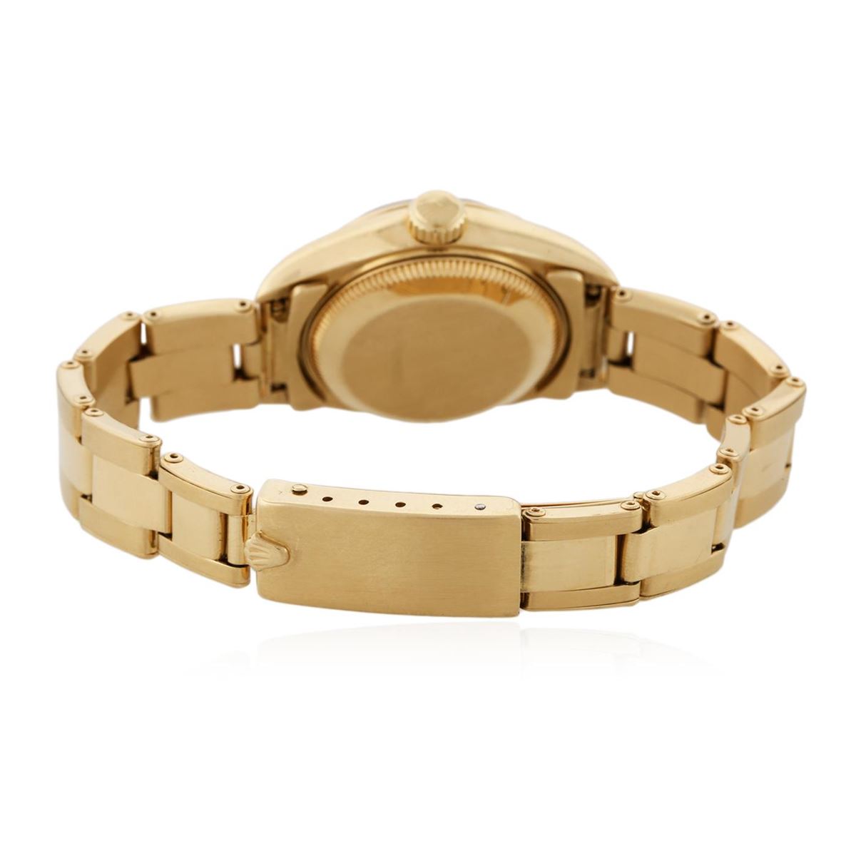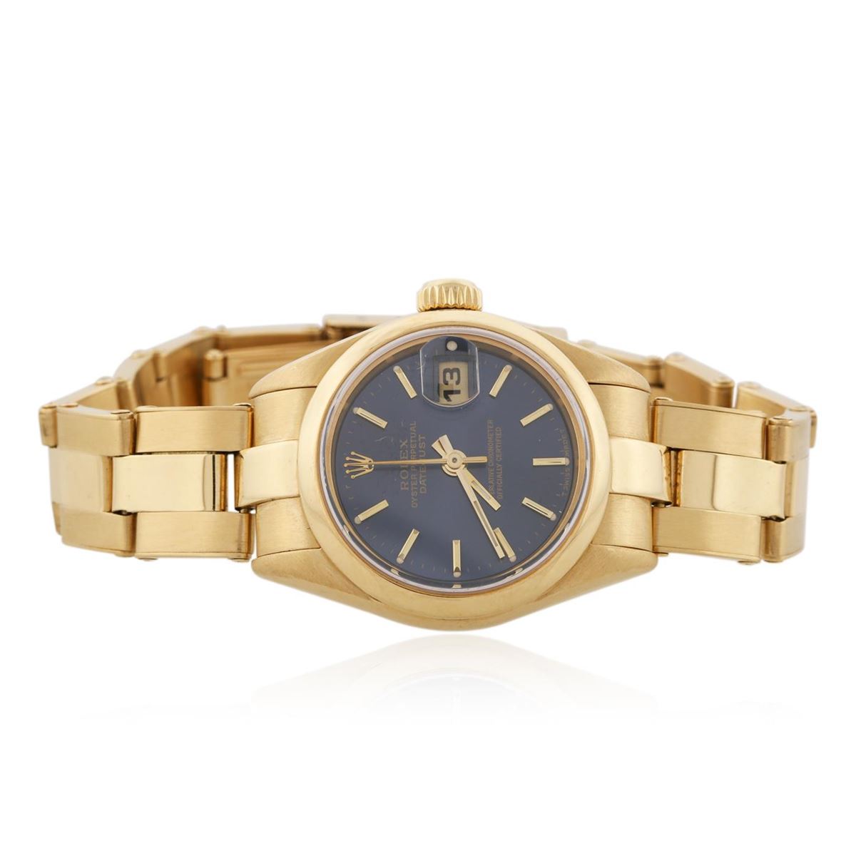 One ladies, hand crafted & machine milled Rolex DateJust model wristwatch electronically tested 18KT yellow gold, Case: 26mm oyster, Crown: twinlock, with logo, Bezel: high polish, Custom Crystal: synthetic sapphire cyclops lens. Movement: superlative chronometer, Dial: Royal Blue, Bracelet: 18KT yellow gold tapering oyster, Condition: G-5 Fine. Circa: 1995, Bright polish and brushed finish. Six and one half inch length, adjustable. Standard clasp, with logo. Total Weight of Watch 63.33 grams. AIG Appraised at $16,880.00.