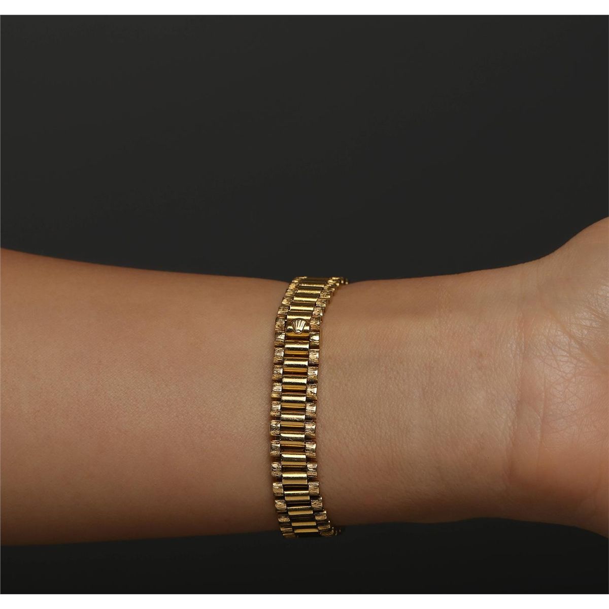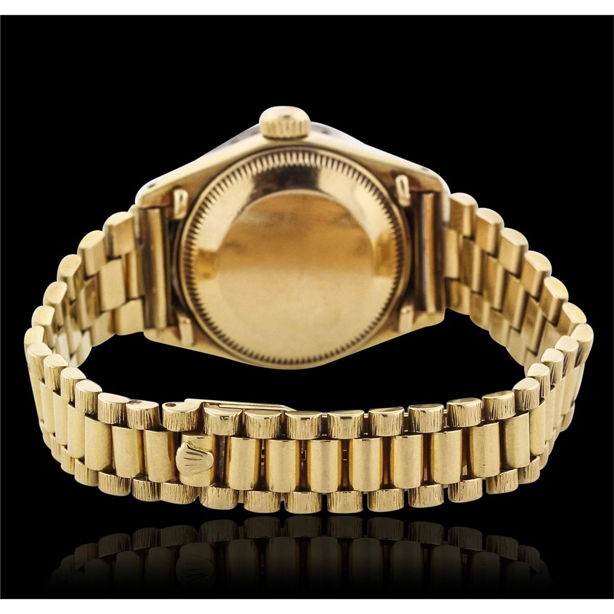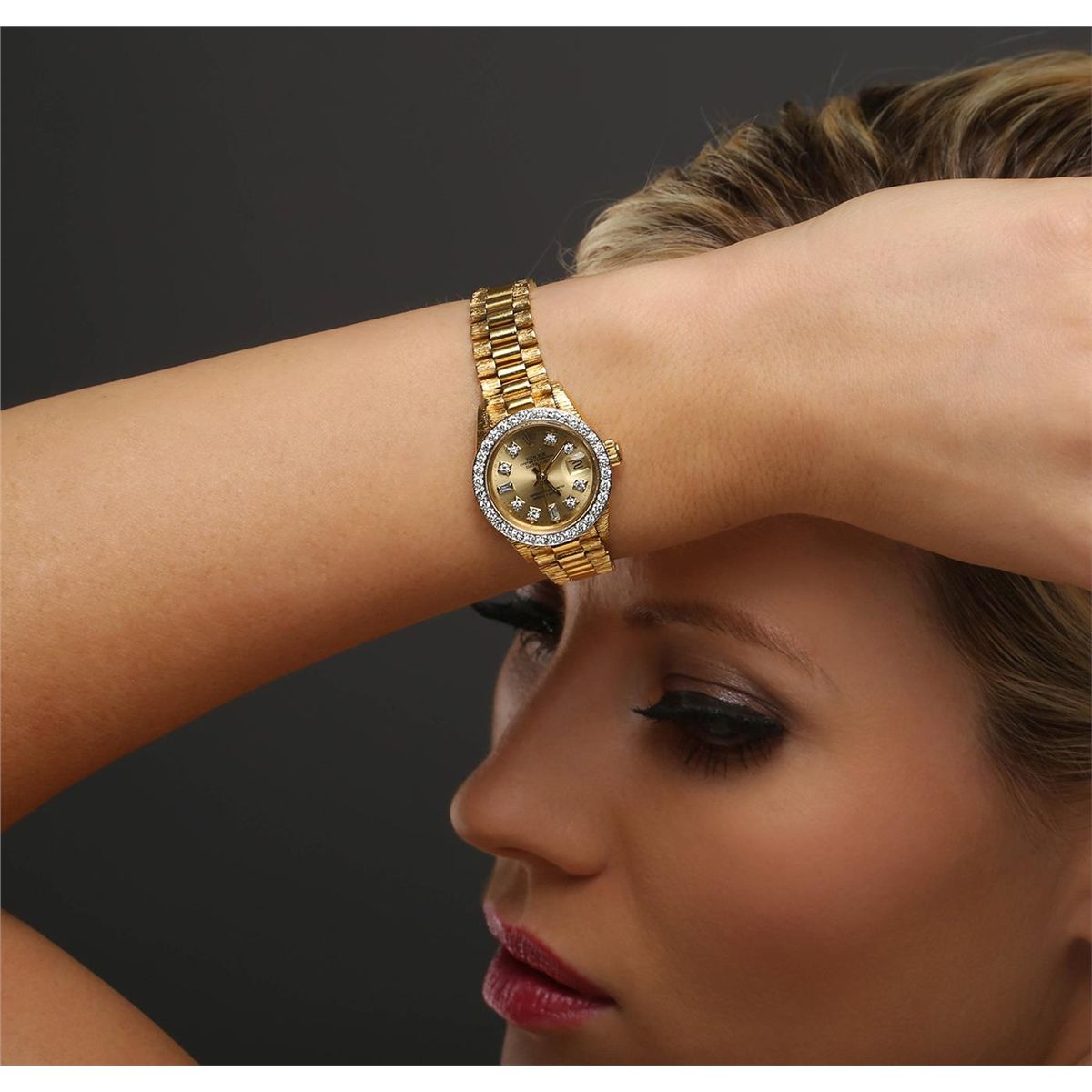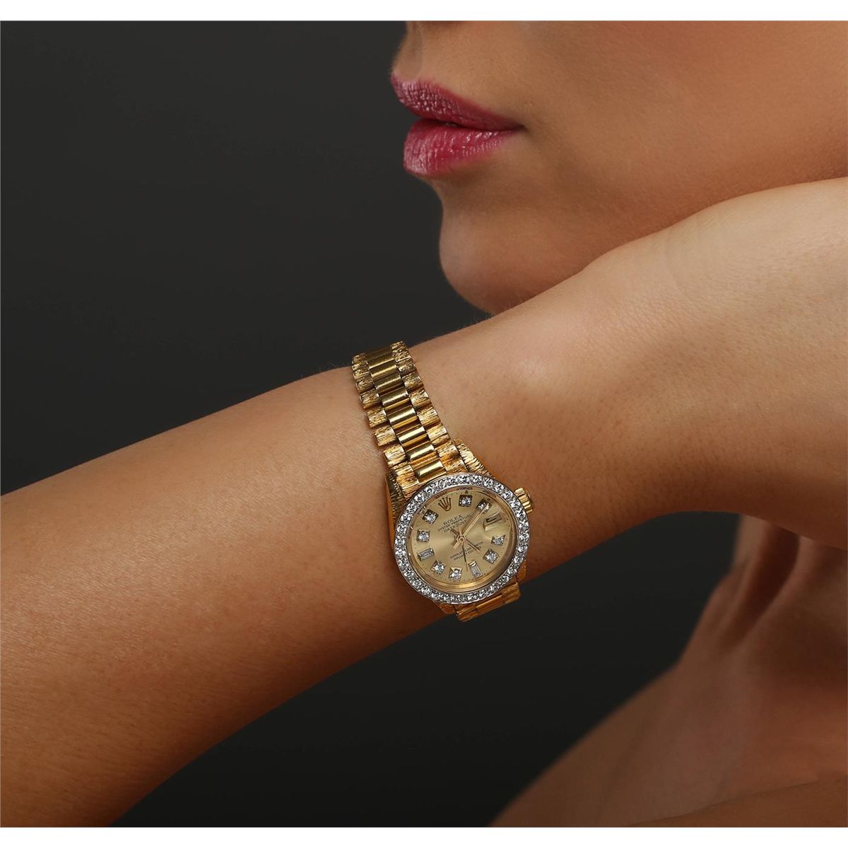 One ladies, hand crafted & machine milled Rolex Lady President the DateJust model wristwatch electronically tested 18KT yellow gold, Circa: early 1980's, Case: 25mm oyster, Crown: twinlock with logo, Custom Bezel: diamond set, Crystal: acrylic cyclops lens.Movement: superlative chronometer. Dial: Champagne color, with baton hands, & diamond markers, Date Display: 3 o'clock position, non-quick set, Bracelet: 18KT yellow gold Lady President, Condition: G-4 Average. Customized bark & bright finish. Six and one quarter inch length. Concealed deployment clasp, with logo. Containing:Thirty Two prong set round brilliant cut diamonds, measuring an average of 1.85mm in diameter, approximate total weight = 0.80ct. Set & graded in the bezel Clarity VS-2 Average. Color: G - H. Total Weight of Diamonds 0.80ct. Total Weight of Watch 65.96gm. AIG Appraised at $18,550.00.