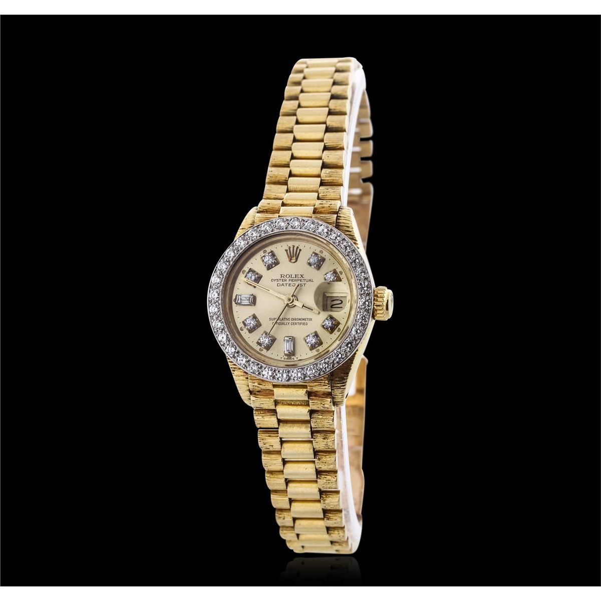 One ladies, hand crafted & machine milled Rolex Lady President the DateJust model wristwatch electronically tested 18KT yellow gold, Circa: early 1980's, Case: 25mm oyster, Crown: twinlock with logo, Custom Bezel: diamond set, Crystal: acrylic cyclops lens.Movement: superlative chronometer. Dial: Champagne color, with baton hands, & diamond markers, Date Display: 3 o'clock position, non-quick set, Bracelet: 18KT yellow gold Lady President, Condition: G-4 Average. Customized bark & bright finish. Six and one quarter inch length. Concealed deployment clasp, with logo. Containing:Thirty Two prong set round brilliant cut diamonds, measuring an average of 1.85mm in diameter, approximate total weight = 0.80ct. Set & graded in the bezel Clarity VS-2 Average. Color: G - H. Total Weight of Diamonds 0.80ct. Total Weight of Watch 65.96gm. AIG Appraised at $18,550.00.