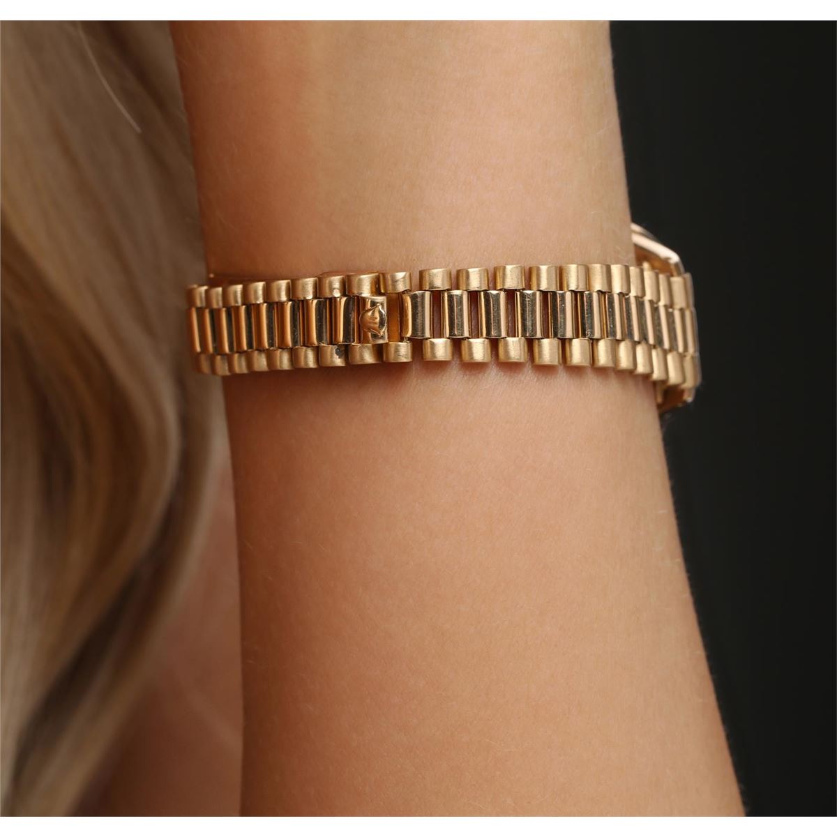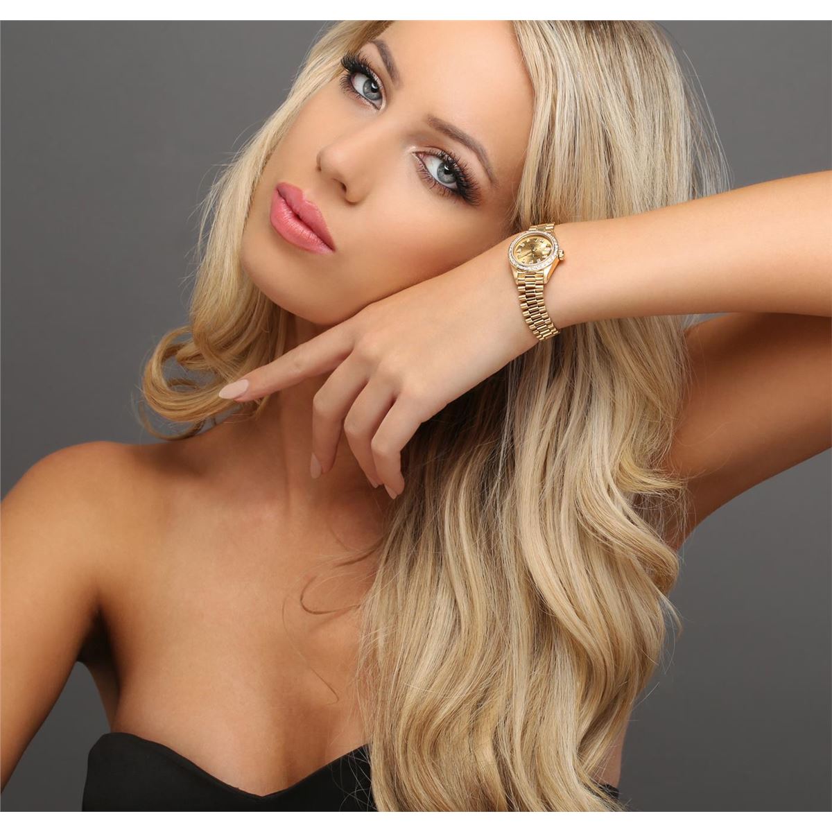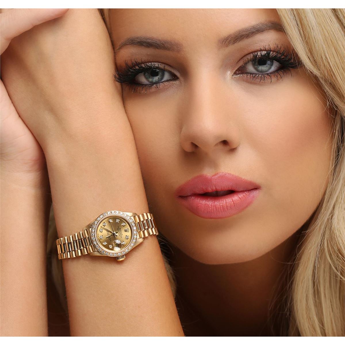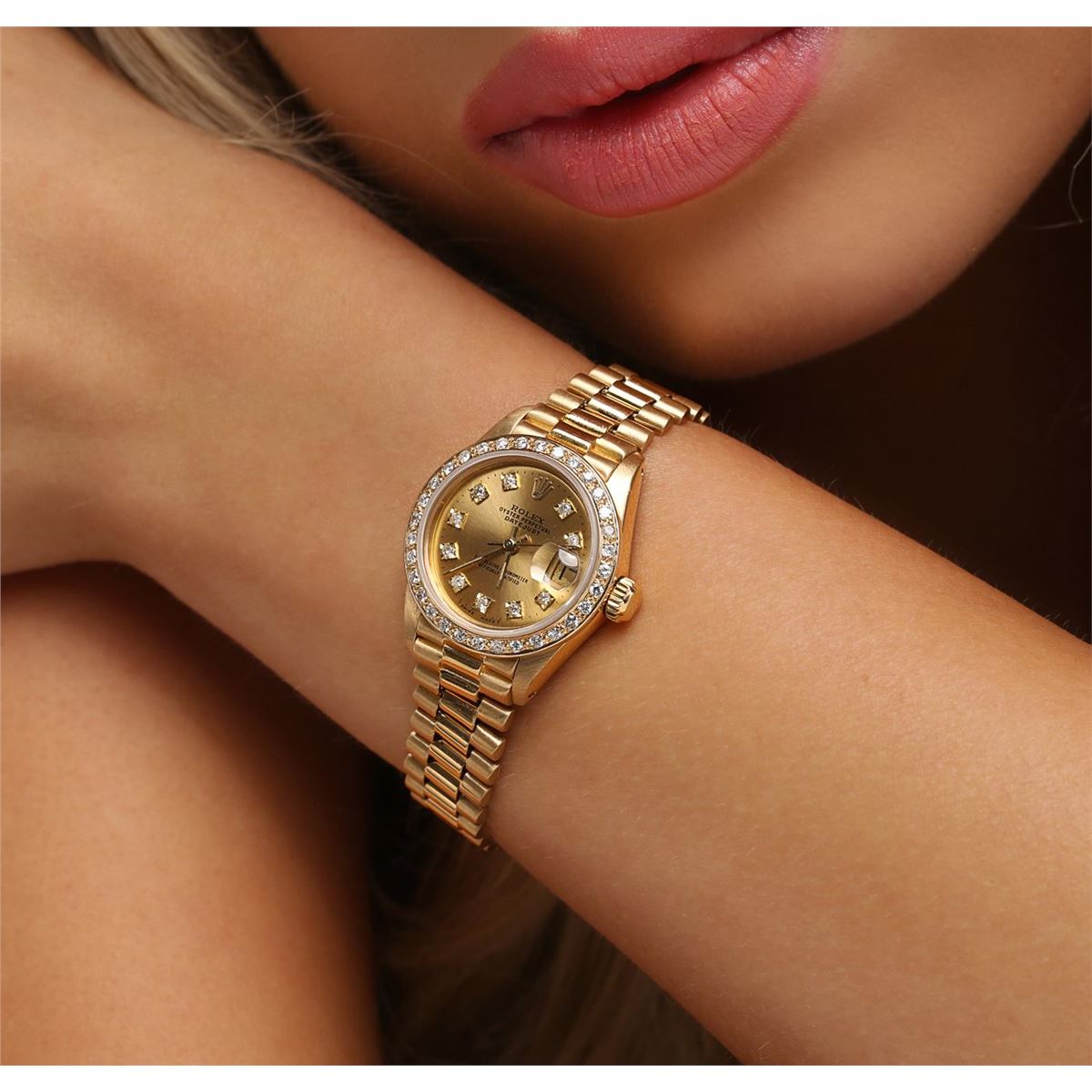 One ladies, hand crafted & machine milled Rolex Lady DateJust model wristwatch electronically tested 18KT yellow gold, Circa: 1978, Case: 26mm oyster, Crown: twinlock with logo, Custom Bezel: diamond set, Custom Crystal: synthetic sapphire cyclops lens. Movement: superlative chronometer. Custom Dial: Champagne color, with baton hands, & diamond markers, Date Display: 3 o'clock position, non-quick set, Bracelet: 18KT yellow gold jubilee, Condition: G-4 Average. Bright & satin finish. Five and three quarter inch length. Concealed deployment clasp. Containing: Thirty Two prong set round brilliant cut diamonds, measuring an average of 1.50mm in diameter, approximate total weight = 0.40ct. Set & graded in the bezel. Clarity: SI2 to I-1. Color: H-I. Total Weight of Diamonds: 0.40ct. Total Weight of Watch: 64.27 grams. AIG Appraised.
