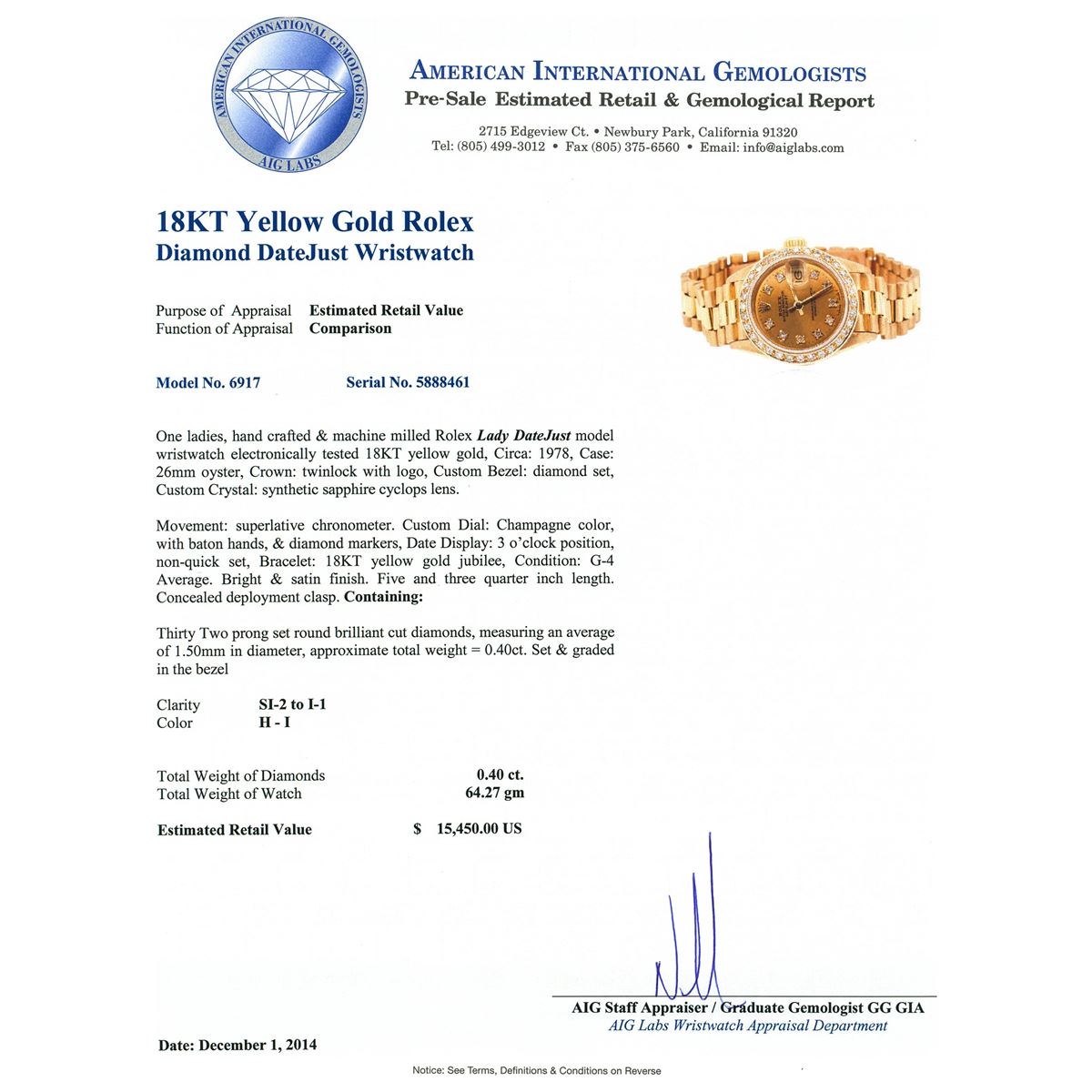 One ladies, hand crafted & machine milled Rolex Lady DateJust model wristwatch electronically tested 18KT yellow gold, Circa: 1978, Case: 26mm oyster, Crown: twinlock with logo, Custom Bezel: diamond set, Custom Crystal: synthetic sapphire cyclops lens. Movement: superlative chronometer. Custom Dial: Champagne color, with baton hands, & diamond markers, Date Display: 3 o'clock position, non-quick set, Bracelet: 18KT yellow gold jubilee, Condition: G-4 Average. Bright & satin finish. Five and three quarter inch length. Concealed deployment clasp. Containing: Thirty Two prong set round brilliant cut diamonds, measuring an average of 1.50mm in diameter, approximate total weight = 0.40ct. Set & graded in the bezel. Clarity: SI2 to I-1. Color: H-I. Total Weight of Diamonds: 0.40ct. Total Weight of Watch: 64.27 grams. AIG Appraised.
