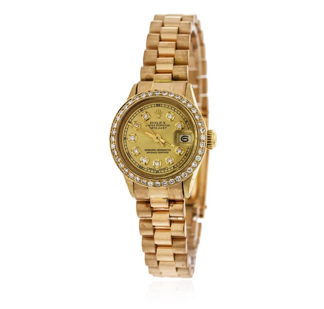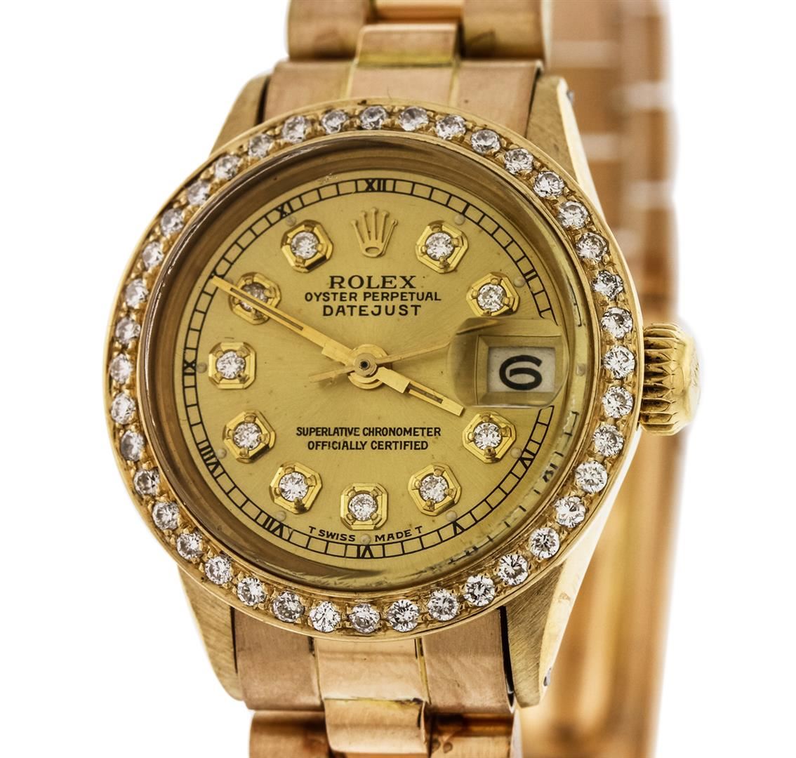 One ladies, hand crafted & machine milled Rolex DateJust model, wristwatch electronically tested 18KT yellow gold, Circa: 1962, Case: 25mm oyster, Crown: twinlock with logo, Custom Bezel: diamond set, Crystal: acrylic cyclops lens. Movement: superlative chronometer. Custom Dial: Champagne color; with baton hands, and diamond indices, Date Display: 3 o'clock position, non-quick set, Custom Bracelet: 18KT yellow gold Lady President style, Condition: G-4 Average. Bright & satin finish. Seven inch length. Custom clasp, with logo. Containing: Forty prong set round brilliant cut diamonds, measuring an average of 1.60mm in diameter, approximate total weight = 0.60ct. Set & graded in the bezel Clarity VS-2 to SI-2. Color: G -H. Total Weight of Diamonds 0.60ct. Total Weight of Watch 60.91 grams. AIG Appraised at $13,050.00.