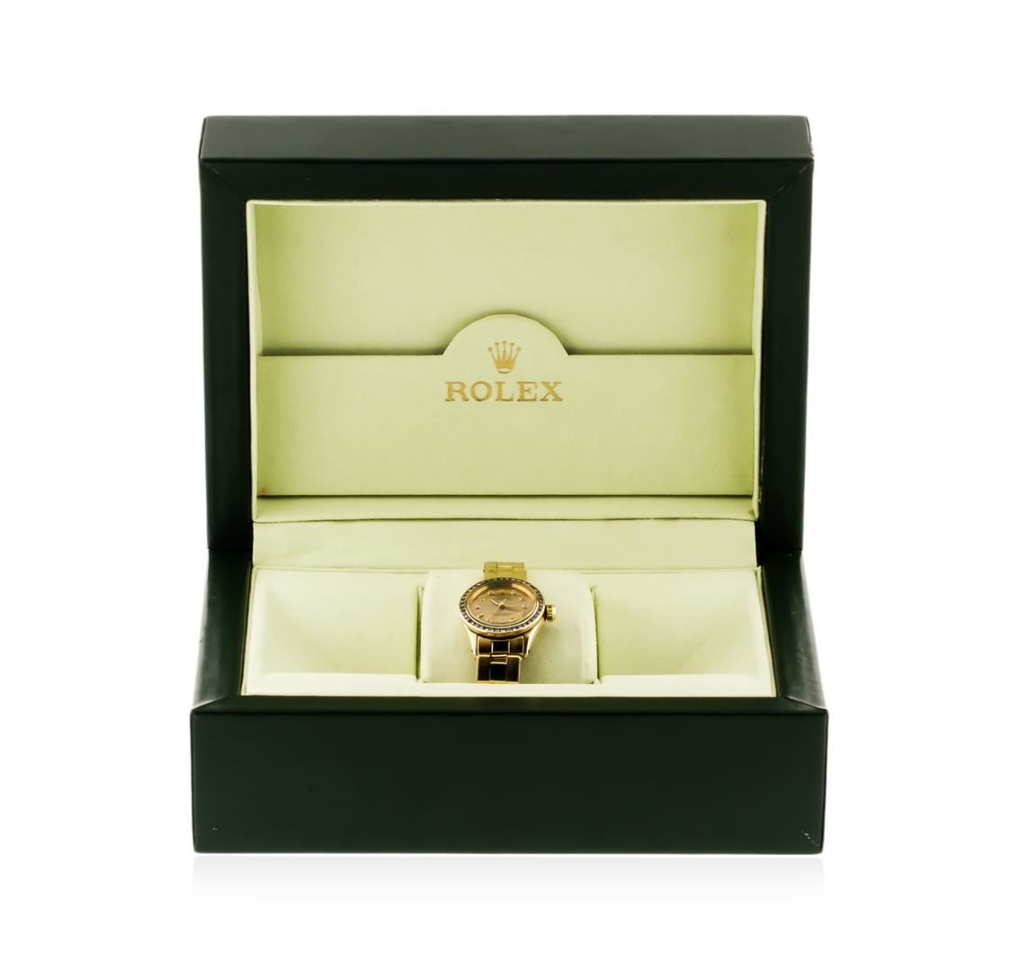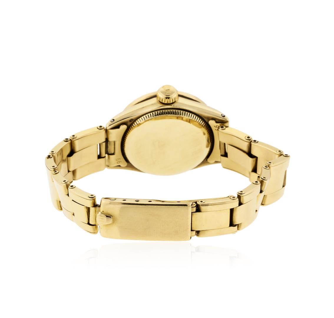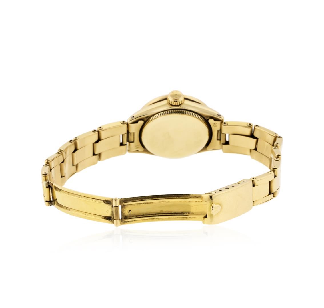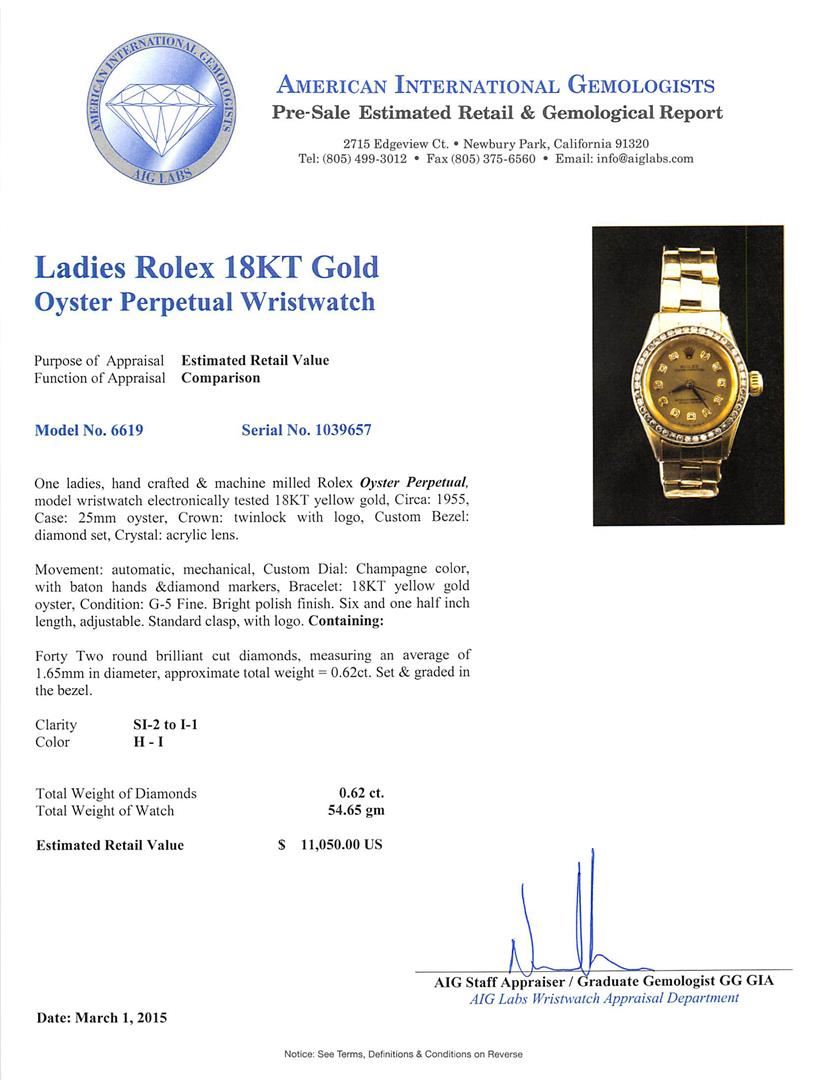 One ladies, hand crafted & machine milled Rolex Oyster Perpetual, model wristwatch electronically tested 18KT yellow gold, Circa: 1955, Case: 25mm oyster, Crown: twinlock with logo, Custom Bezel: diamond set, Crystal: acrylic lens. Movement: automatic, mechanical, Custom Dial: Champagne color, with baton hands &diamond markers, Bracelet: 18KT yellow gold oyster, Condition: G-5 Fine. Bright polish finish. Six and one half inch length, adjustable. Standard clasp, with logo. Containing: Forty Two round brilliant cut diamonds, measuring an average of 1.65mm in diameter, approximate total weight = 0.62ct. Set & graded in the bezel. Clarity SI-2 to I-1. Color: H - I. Total Weight of Diamonds 0.62ct. Total Weight of Watch 54.65gm. AIG Appraised at $11,050.00.