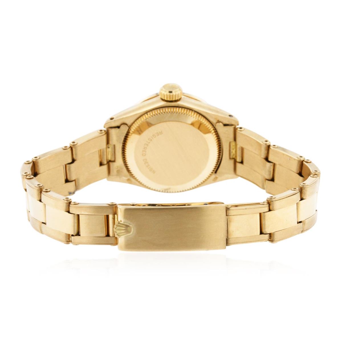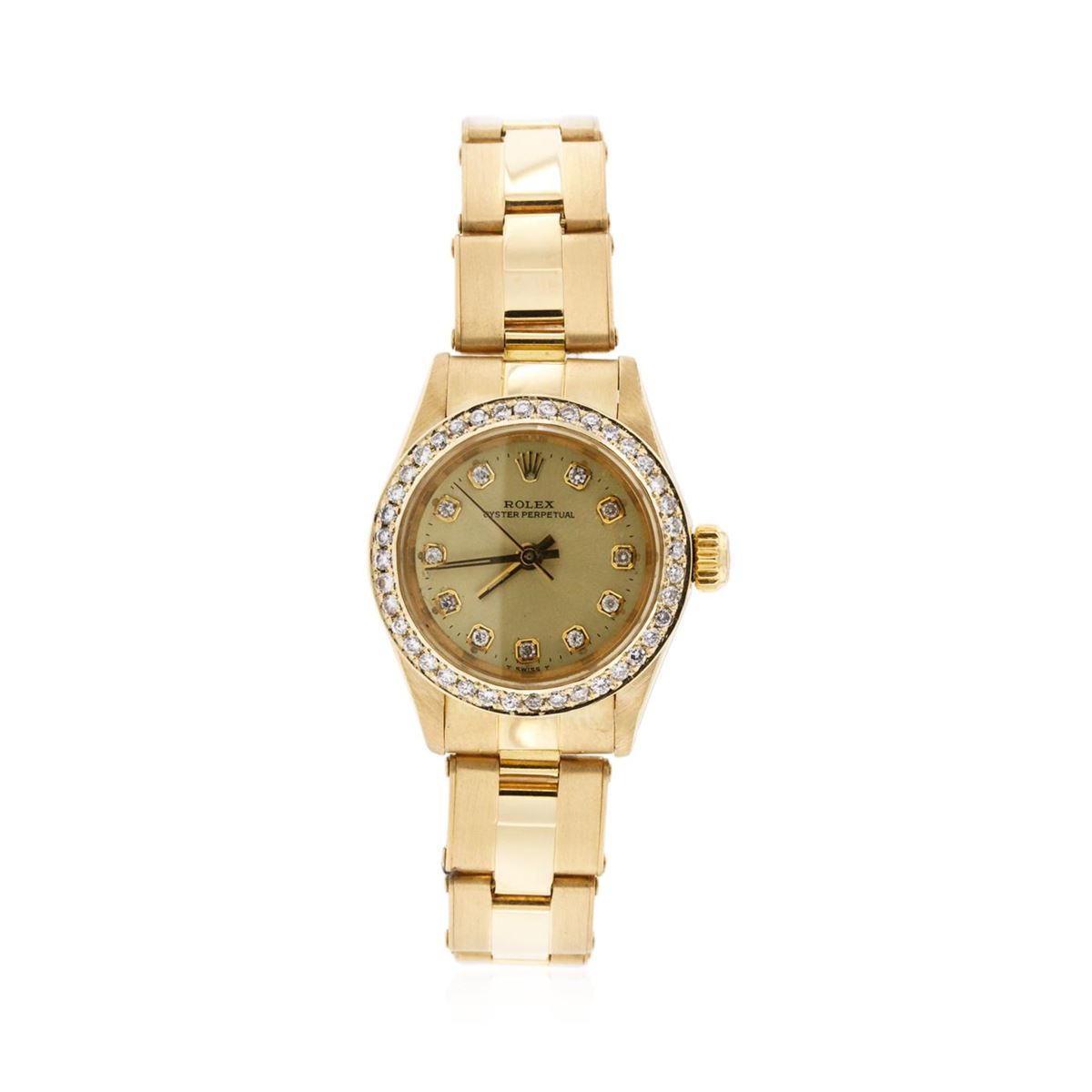 One ladies, hand crafted & machine milled Rolex Oyster Perpetual, model wristwatch electronically tested 18KT yellow gold, Circa: 1979, Case: 25mm oyster, Crown: twinlock with logo, Custom Bezel: diamond set, Crystal: acrylic lens. Movement: automatic, mechanical, stem wind, Dial: Champagne color, with baton hands &diamond markers, Bracelet: 18KT yellow gold oyster, Condition: G-5 Fine. Bright polish & satin finish. Seven inch length, adjustable. Standard clasp, with logo. Containing: Forty round brilliant cut diamonds, measuring an average of 1.50mm in diameter, approximate total weight = 0.42ct. Set & graded in the bezel. Clarity I-1 to I-2. Color: G - I. Total Weight of Diamonds 0.42ct. Total Weight of Watch 58.01 grams. AIG Appraised at $14,050.00.