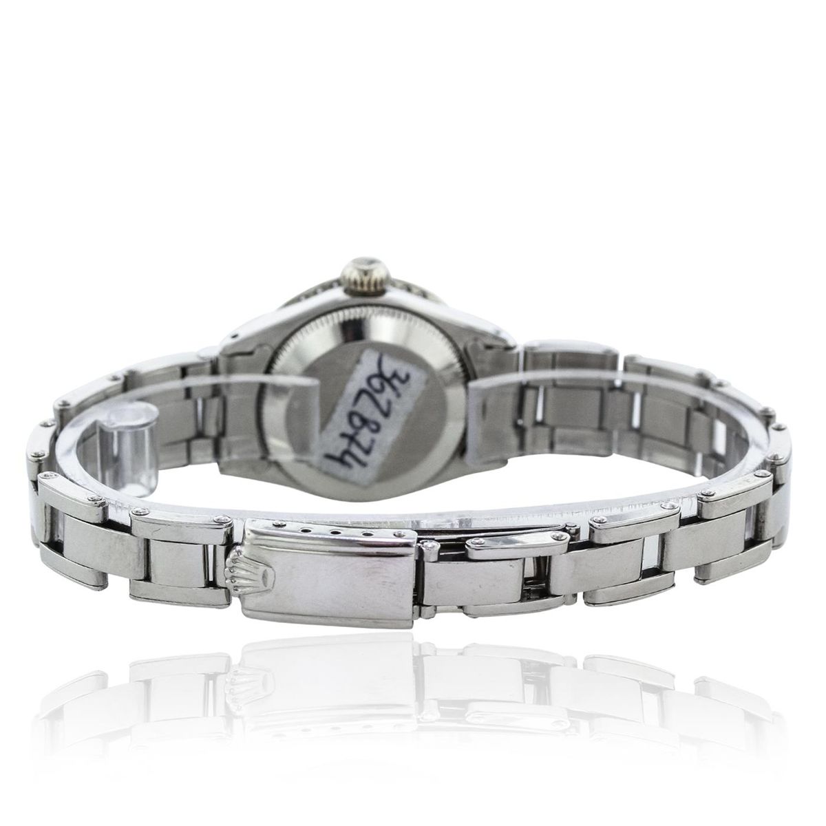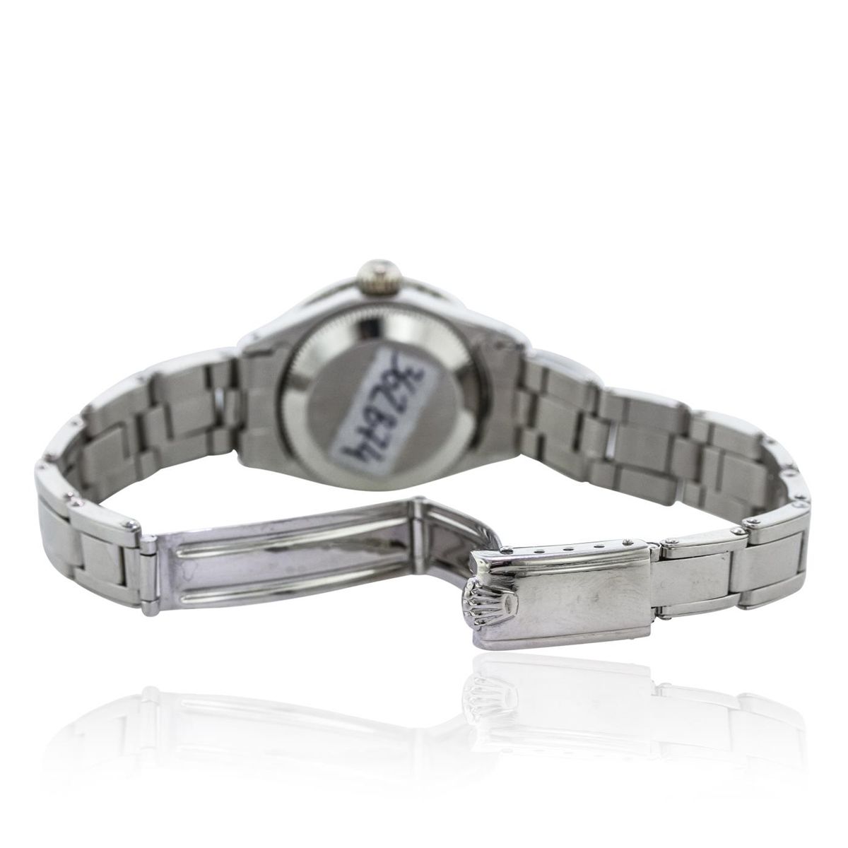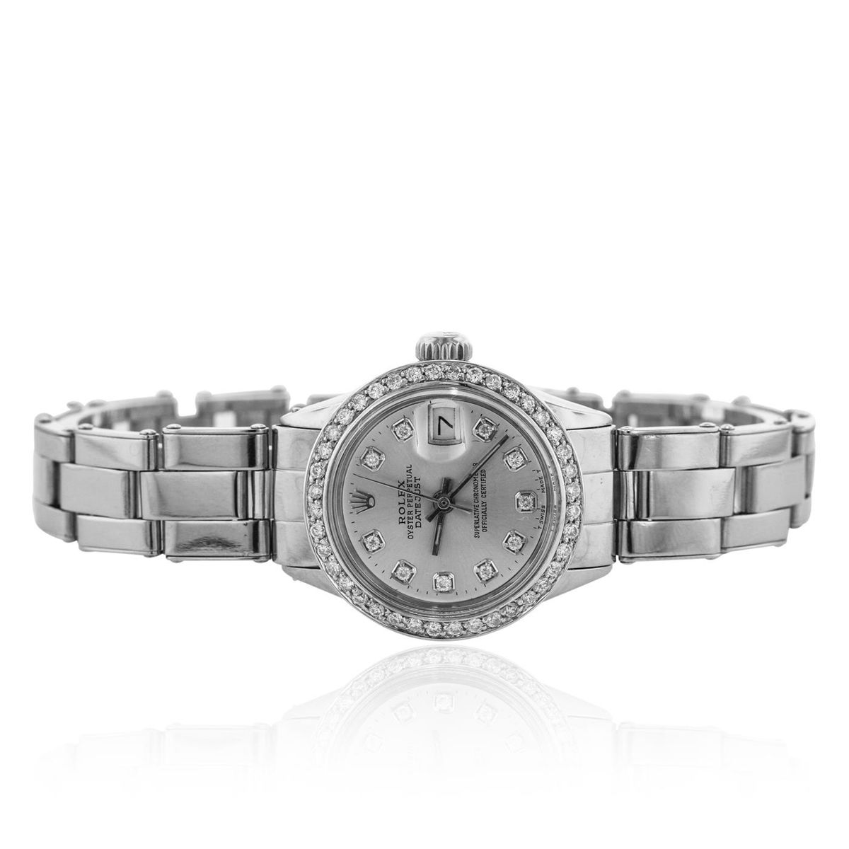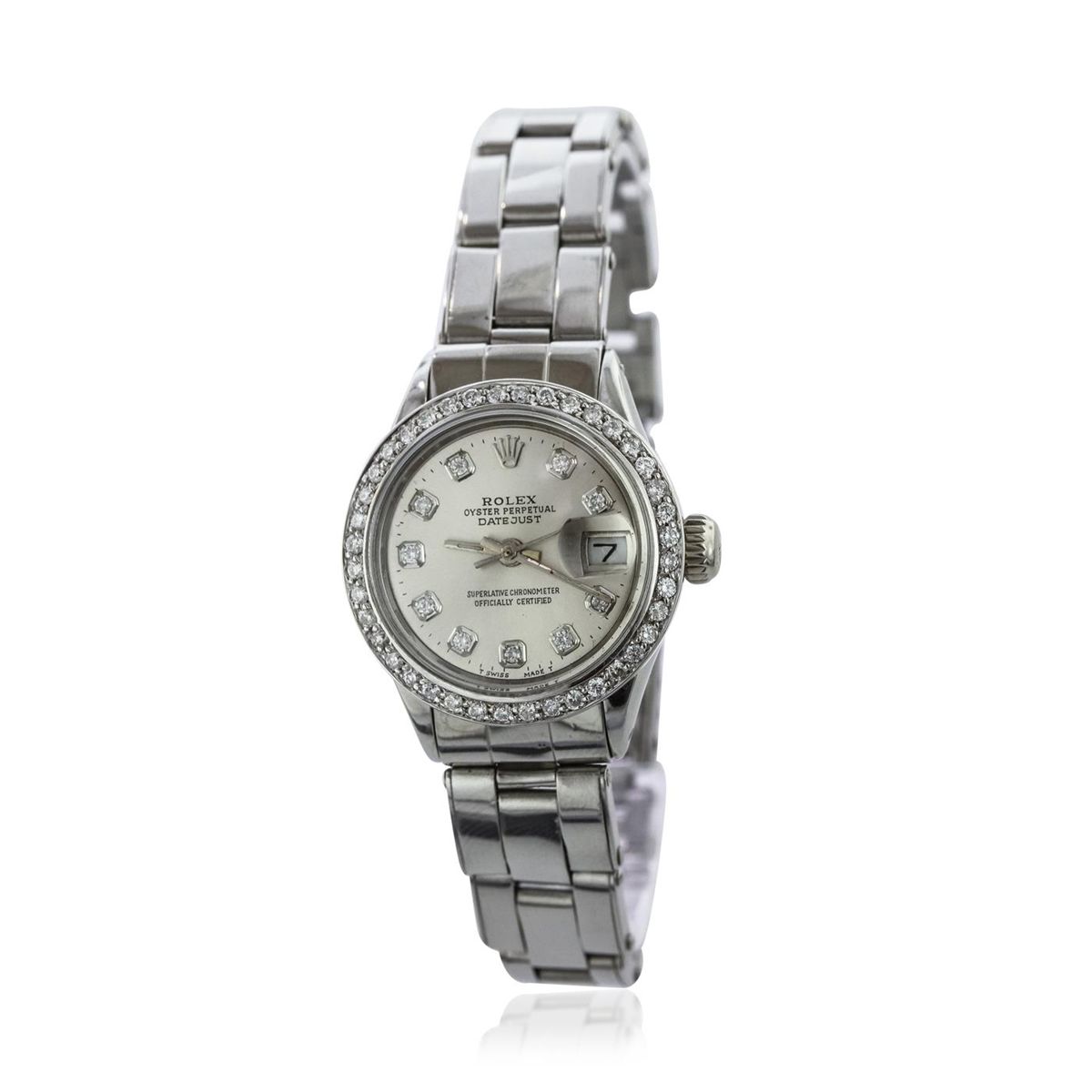 One ladies, hand crafted and machine milled Rolex DateJust Model stainless steel wristwatch electronically tested, Case: 25mm oyster, Crown: twinlock with logo, Custom Bezel: diamond set, Crystal: acrylic cyclops lens, Circa: 1968. Movement: superlative chronometer, Custom Dial: Dark Silver, with baton hands and diamond markers, Date Window: 3 o'clock position, non-quick set, Condition: G-4 Average. Bracelet: stainless steel oyster. Six and three quarter inch length, adjustable. Bright polish and brushed finish. Standard clasp, with logo. Containing: Forty prong set round brilliant cut diamonds, measuring an average of 1.50mm in diameter, approximate. Total Weight of 40 Stones = 0.50ct. Set and graded in the bezel. Clarity: SI-2 to I-1. Color: G - I. Total Weight of Diamonds 0.50ct. Total Weight of Watch 36.51 grams. AIG Appraised at $6,150.00.