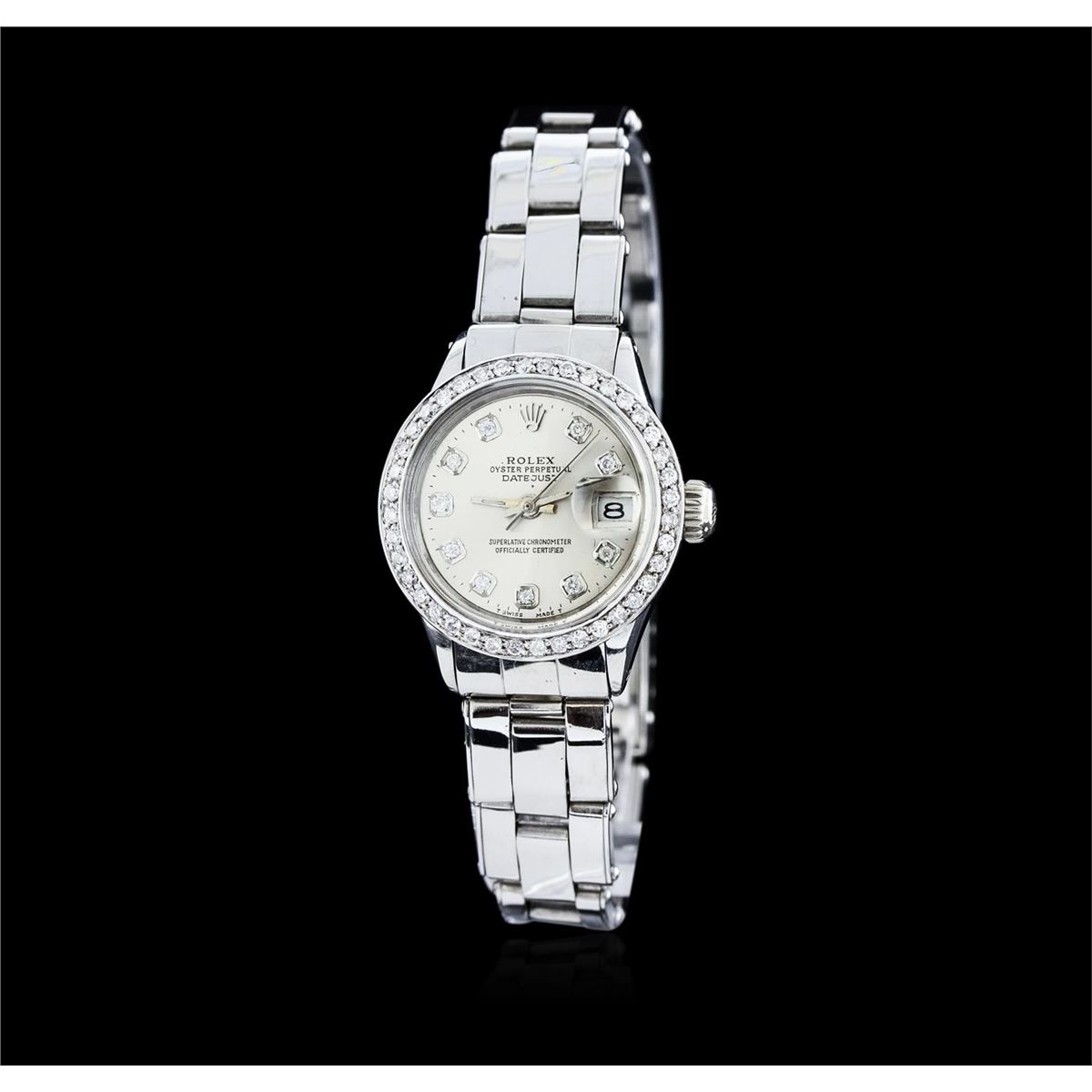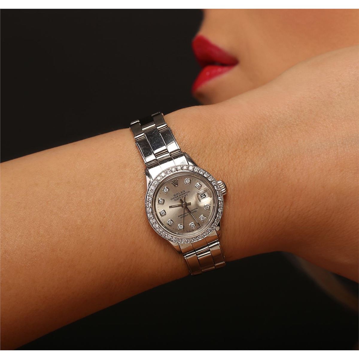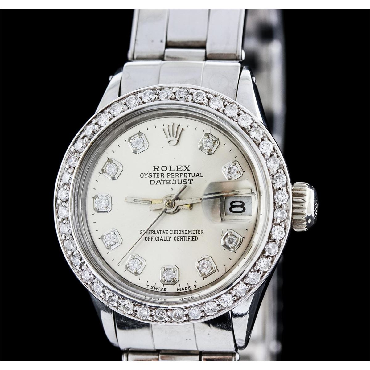 One ladies, hand crafted and machine milled Rolex DateJust Model stainless steel wristwatch electronically tested, Case: 25mm oyster, Crown: twinlock with logo, Custom Bezel: diamond set, Crystal: acrylic cyclops lens, Circa: 1968. Movement: superlative chronometer, Custom Dial: Dark Silver, with baton hands and diamond markers, Date Window: 3 o'clock position, non-quick set, Condition: G-4 Average. Bracelet: stainless steel oyster. Six and three quarter inch length, adjustable. Bright polish and brushed finish. Standard clasp, with logo. Containing: Forty prong set round brilliant cut diamonds, measuring an average of 1.50mm in diameter, approximate. Total Weight of 40 Stones = 0.50ct. Set and graded in the bezel. Clarity: SI-2 to I-1. Color: G - I. Total Weight of Diamonds 0.50ct. Total Weight of Watch 36.51 grams. AIG Appraised at $6,150.00.