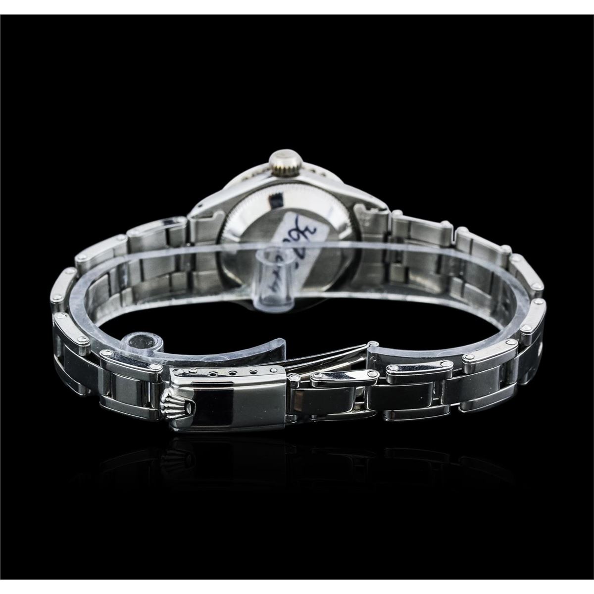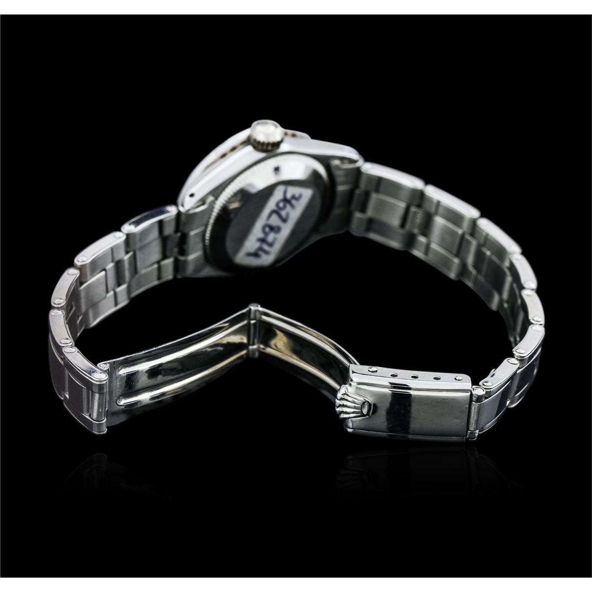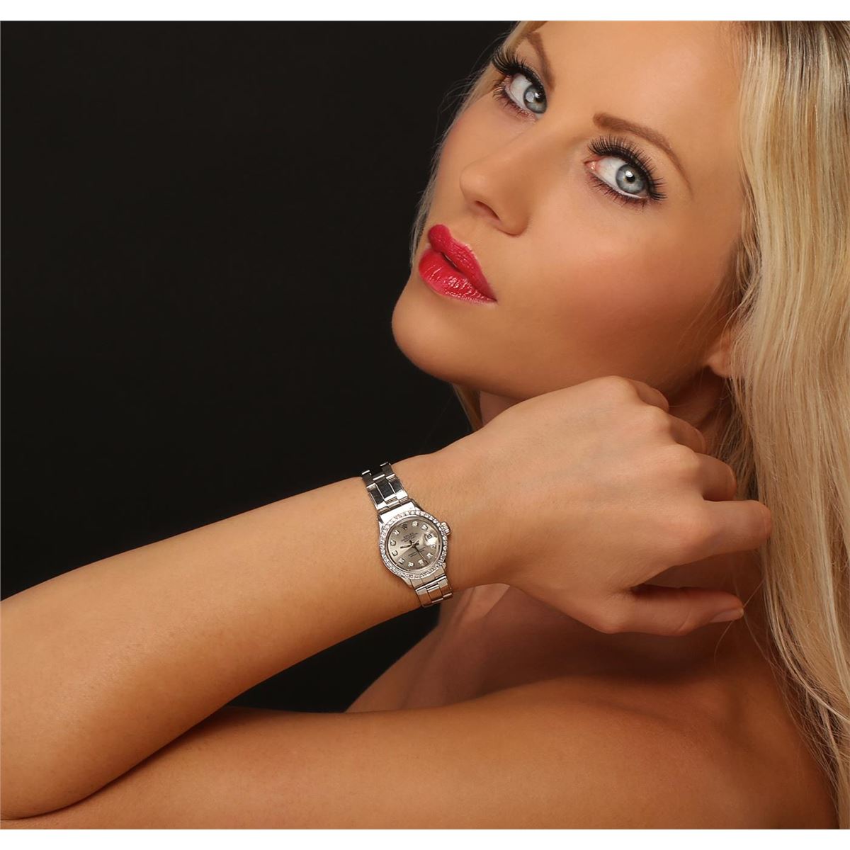 One ladies, hand crafted and machine milled Rolex DateJust Model stainless steel wristwatch electronically tested, Case: 25mm oyster, Crown: twinlock with logo, Custom Bezel: diamond set, Crystal: acrylic cyclops lens, Circa: 1968. Movement: superlative chronometer, Custom Dial: Dark Silver, with baton hands and diamond markers, Date Window: 3 o'clock position, non-quick set, Condition: G-4 Average. Bracelet: stainless steel oyster. Six and three quarter inch length, adjustable. Bright polish and brushed finish. Standard clasp, with logo. Containing: Forty prong set round brilliant cut diamonds, measuring an average of 1.50mm in diameter, approximate. Total Weight of 40 Stones = 0.50ct. Set and graded in the bezel. Clarity: SI-2 to I-1. Color: G - I. Total Weight of Diamonds 0.50ct. Total Weight of Watch 36.51 grams. AIG Appraised at $6,150.00.
