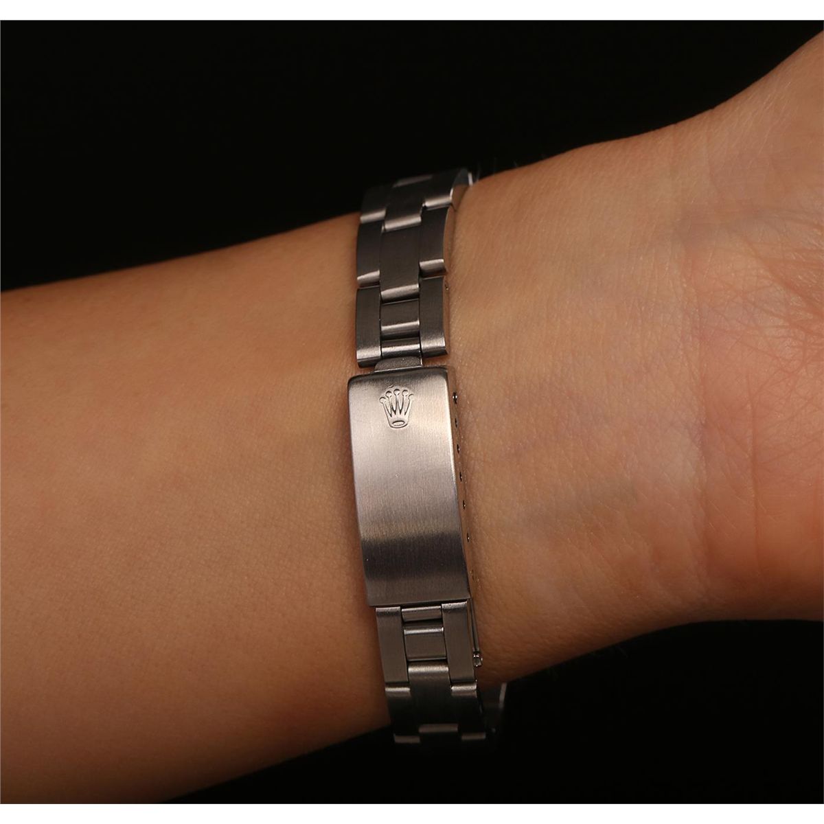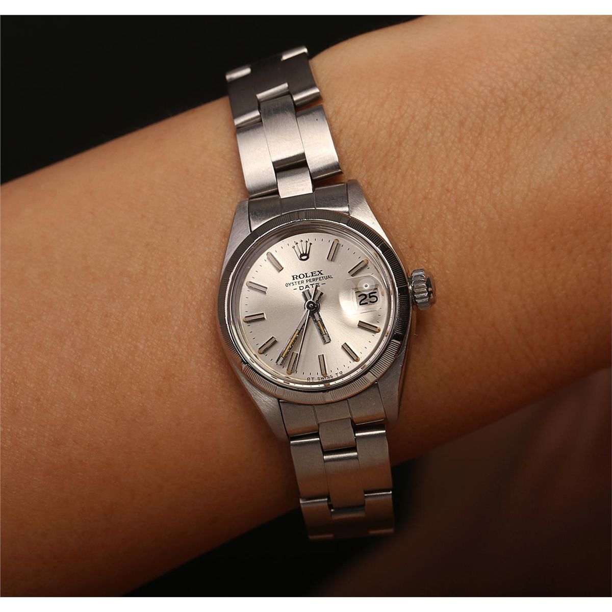 One ladies, hand crafted & machine milled Rolex Date Model Stainless Steel wristwatch electronically tested, Case: 26mm oyster, Crown: twinlock with logo, Bezel: engine turned, Crystal: acrylic cyclops lens. Movement: mechanical, stem wind, Dial: Silvered, with luminous hands, and indices, Date Window: 3 o'clock position non-quick set, Circa: 1977, Condition: G-4 Average. Bracelet: stainless steel oyster. Brushed polish finish. Six and three quarter inch length, adjustable. Standard clasp, with logo. Total Weight of Watch 49.30gm. AIG Appraised at $3,180.00.