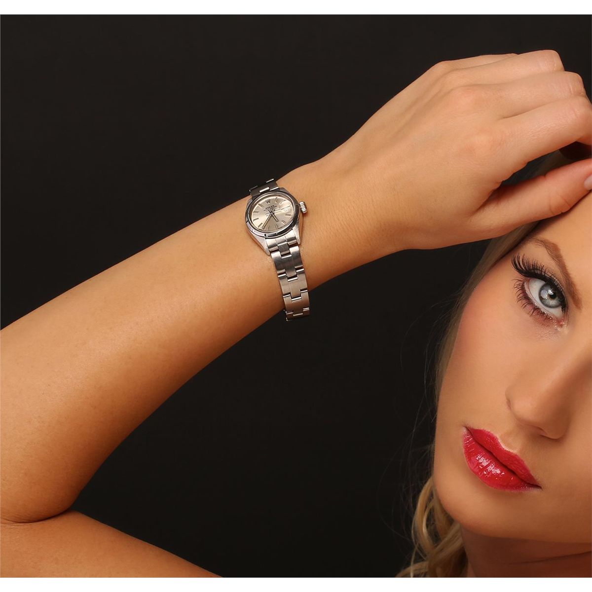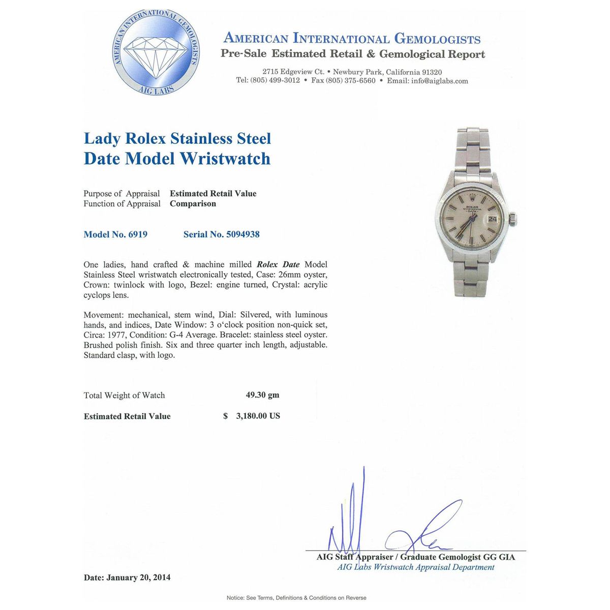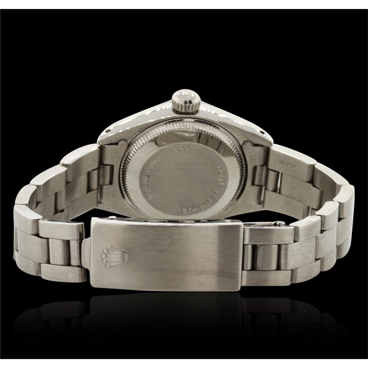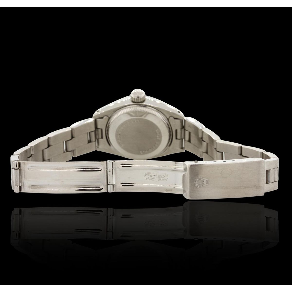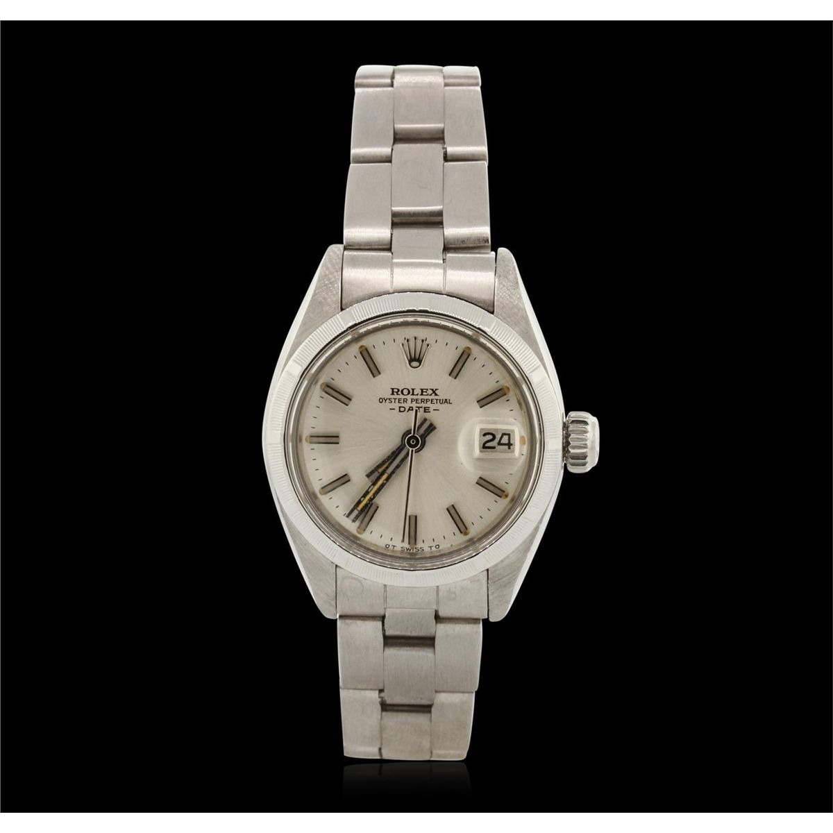 One ladies, hand crafted & machine milled Rolex Date Model Stainless Steel wristwatch electronically tested, Case: 26mm oyster, Crown: twinlock with logo, Bezel: engine turned, Crystal: acrylic cyclops lens. Movement: mechanical, stem wind, Dial: Silvered, with luminous hands, and indices, Date Window: 3 o'clock position non-quick set, Circa: 1977, Condition: G-4 Average. Bracelet: stainless steel oyster. Brushed polish finish. Six and three quarter inch length, adjustable. Standard clasp, with logo. Total Weight of Watch 49.30gm. AIG Appraised at $3,180.00.