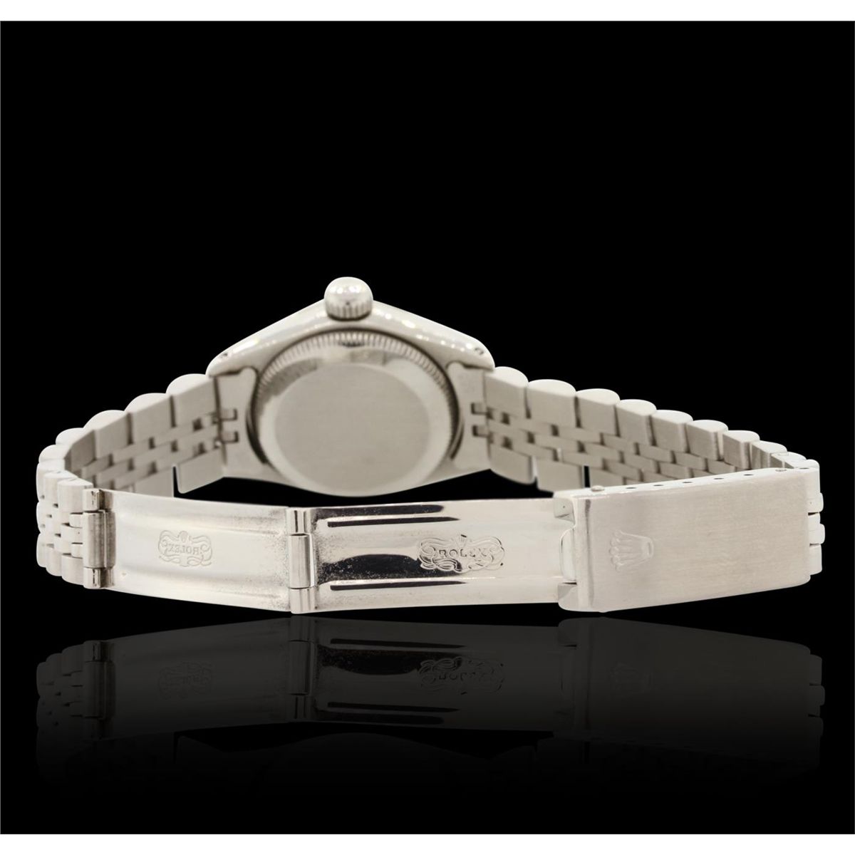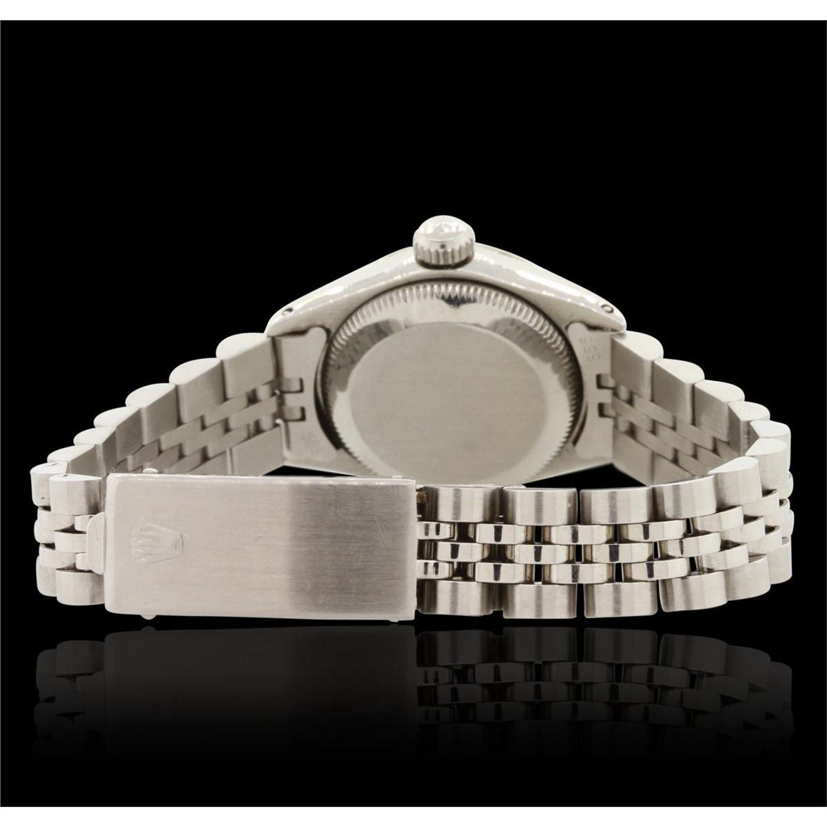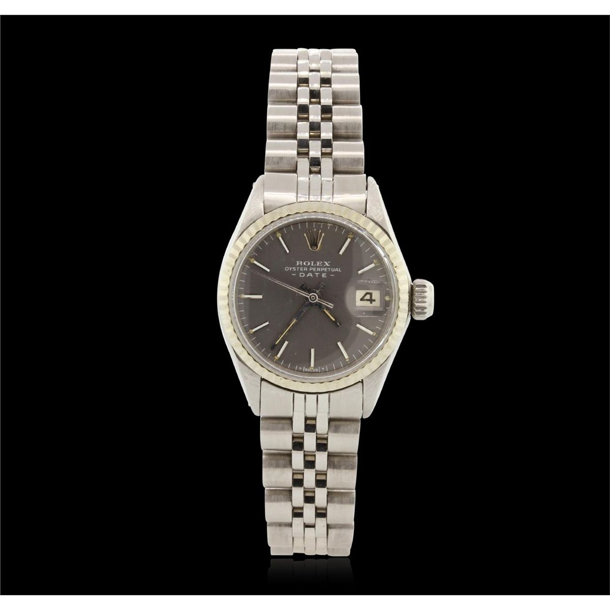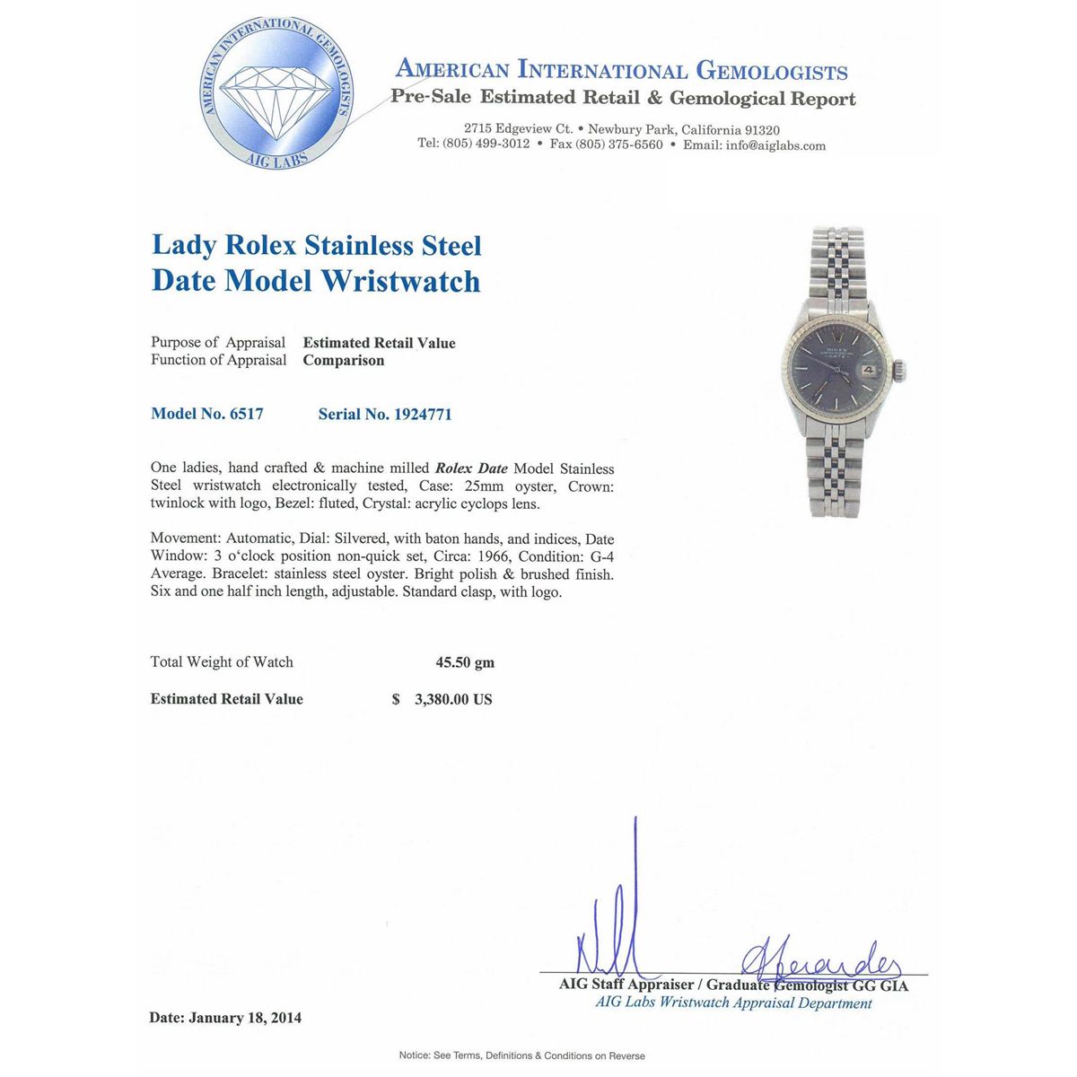 One ladies, hand crafted & machine milled Rolex Date Model Stainless Steel wristwatch electronically tested, Case: 25mm oyster, Crown: twinlock with logo, Bezel: fluted, Crystal: acrylic cyclops lens. Movement: Automatic, Dial: Silvered, with baton hands, and indices, Date Window: 3 o'clock position non-quick set, Circa: 1966, Condition: G-4 Average. Bracelet: stainless steel oyster. Bright polish & brushed finish. Six and one half inch length, adjustable. Standard clasp, with logo. Total Weight of Watch 45.50 gm. AIG Appraised at $3,380.00.