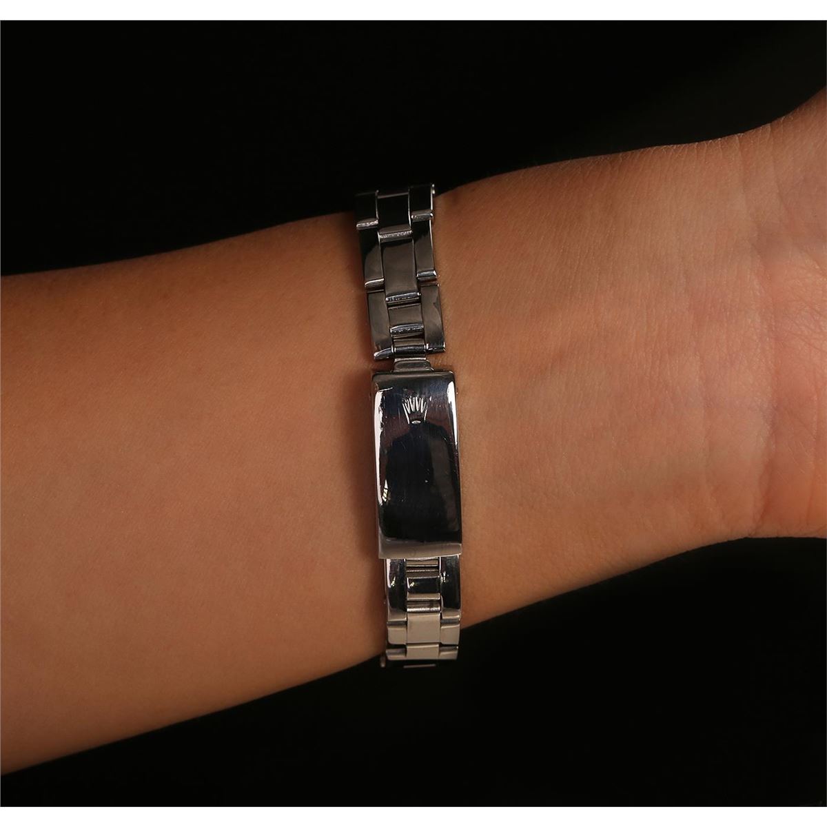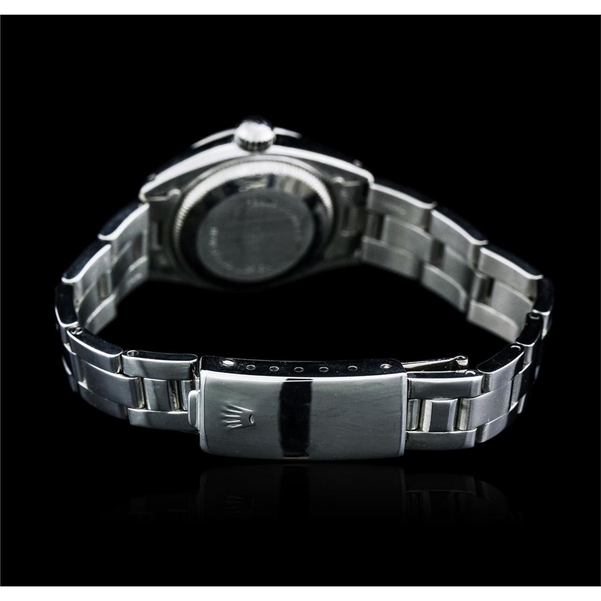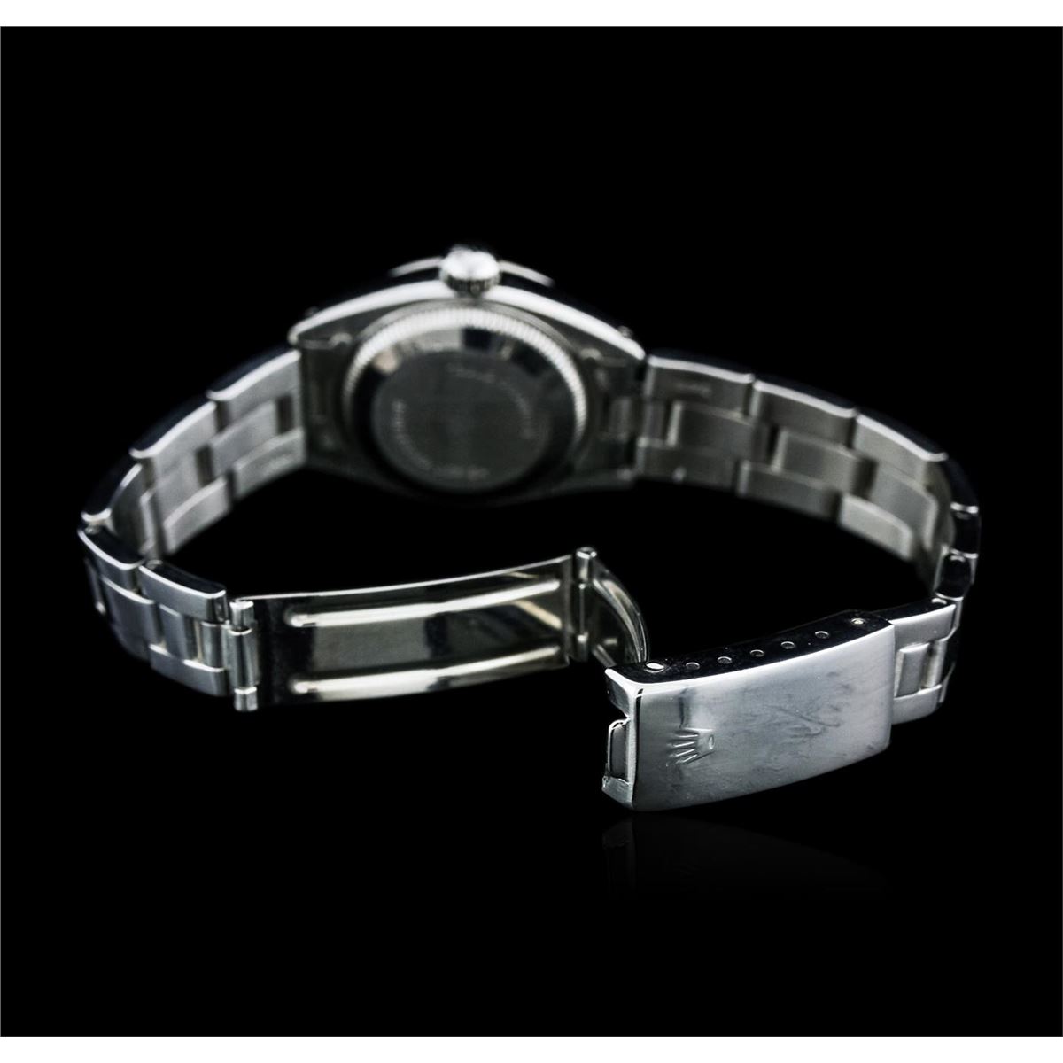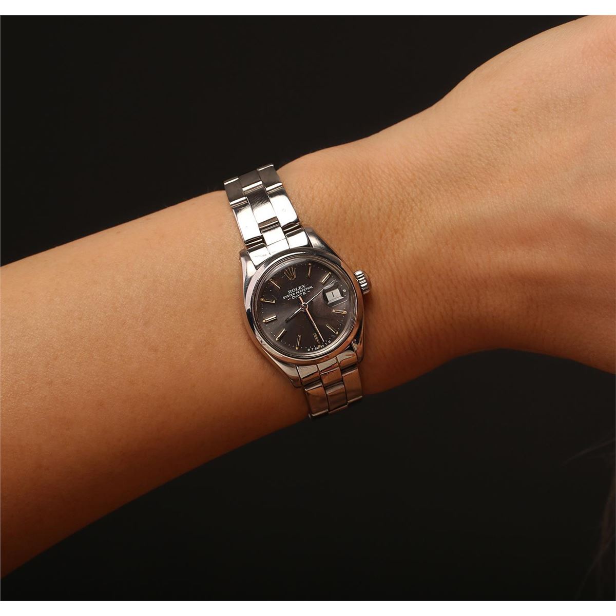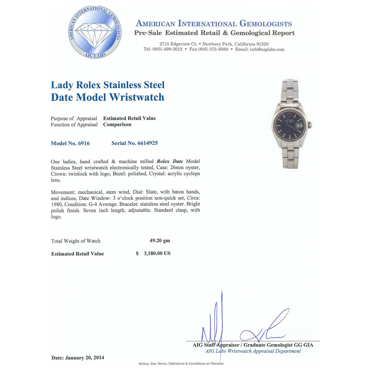 One ladies, hand crafted & machine milled Rolex Date Model Stainless Steel wristwatch electronically tested, Case: 26mm oyster, Crown: twinlock with logo, Bezel: polished, Crystal: acrylic cyclops lens. Movement: mechanical, stem wind, Dial: Slate, with baton hands, and indices, Date Window: 3 o'clock position non-quick set, Circa: 1980, Condition: G-4 Average. Bracelet: stainless steel oyster. Bright polish finish. Seven inch length, adjustable. Standard clasp, with logo. Total Weight of Watch 49.20gm. AIG Appraised at $3,180.00.