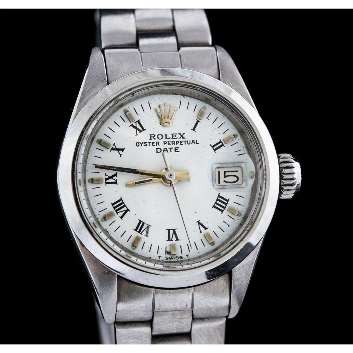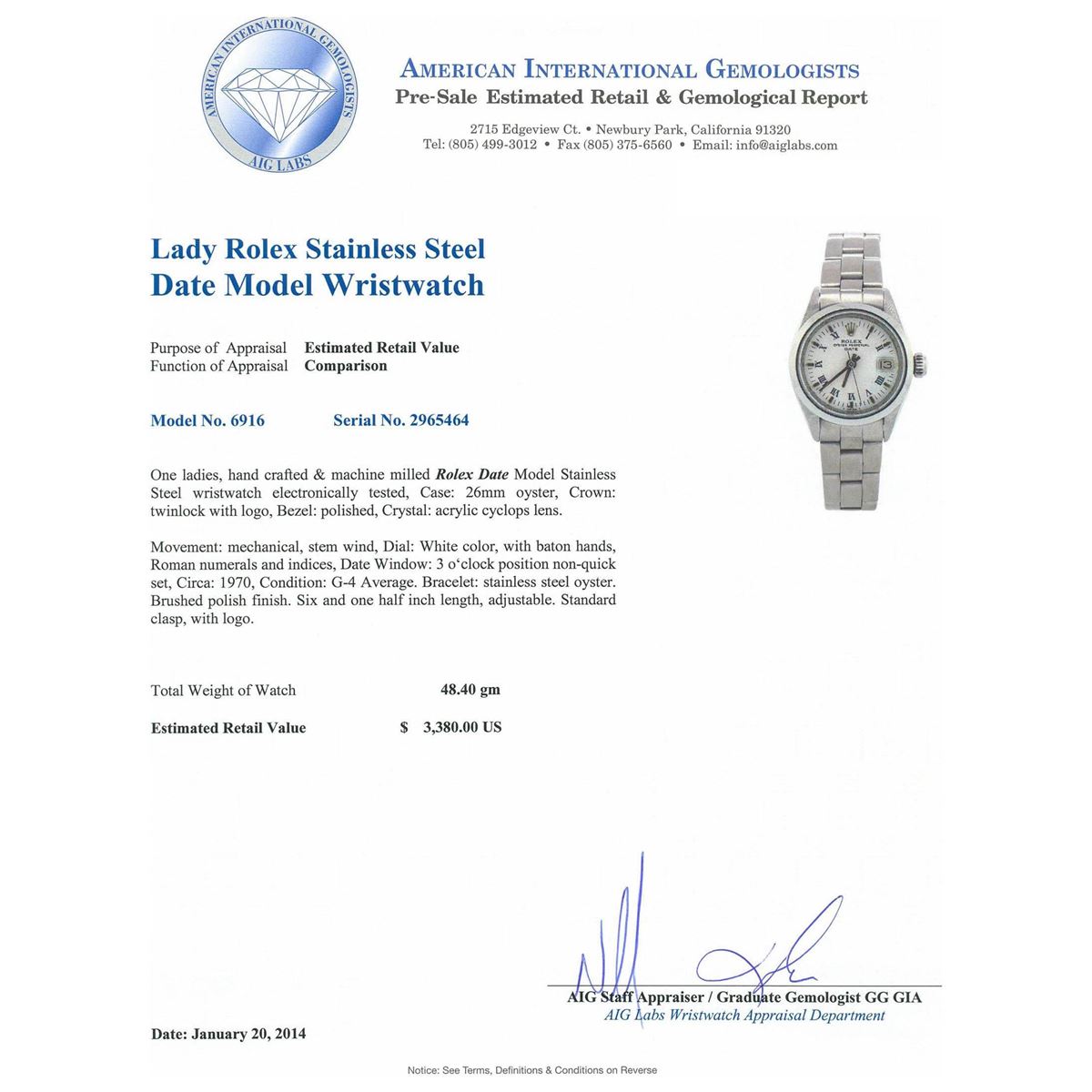 One ladies, hand crafted & machine milled Rolex Date Model Stainless Steel wristwatch electronically tested, Case: 26mm oyster, Crown: twinlock with logo, Bezel: polished, Crystal: acrylic cyclops lens. Movement: mechanical, stem wind, Dial: White color, with baton hands, Roman numerals and indices, Date Window: 3 o'clock position non-quick set, Circa: 1970, Condition: G-4 Average. Bracelet: stainless steel oyster. Brushed polish finish. Six and one half inch length, adjustable. Standard clasp, with logo. Total Weight of Watch 48.40gm. AIG Appraised at $3,380.00.